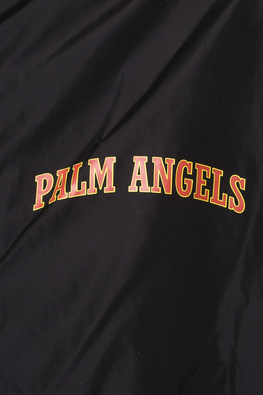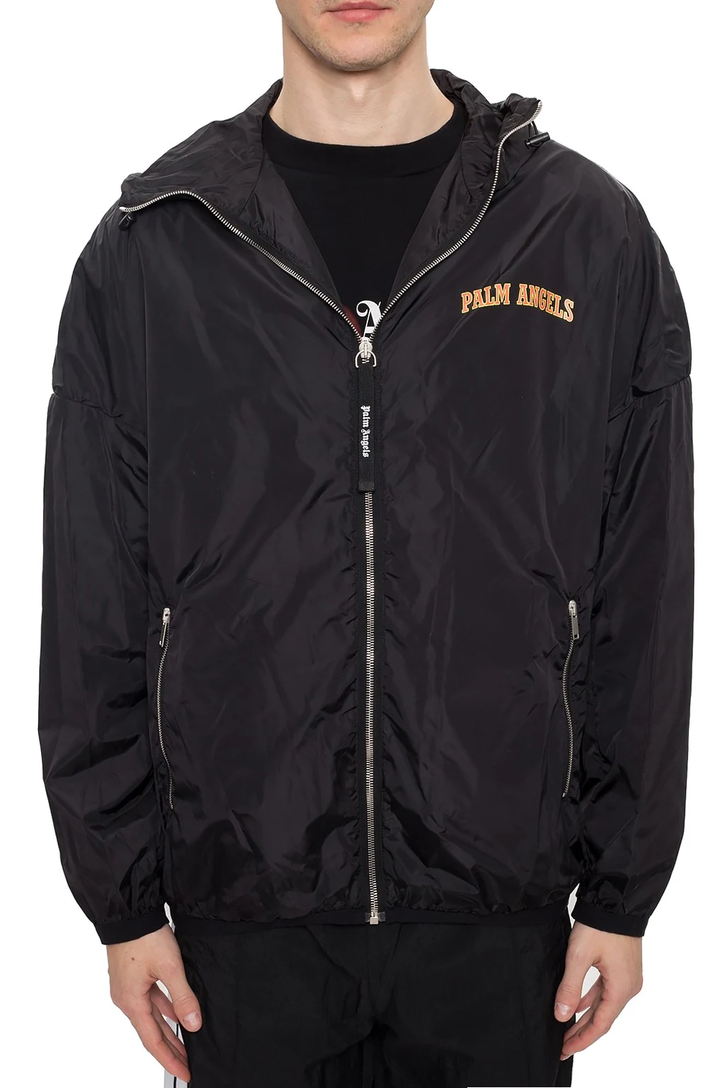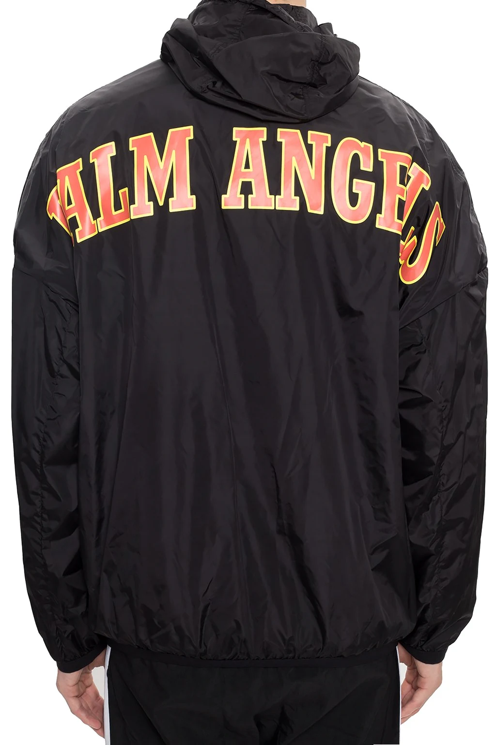 Czarna, ortalionowa kurtka Palm Angels. Zapinana na zamek. Z przodu i z tyłu nadrukowane żółto-pomarańczowe logo. Kaptur ściągany trokami. Dwie kieszenie zapinane na zamek.