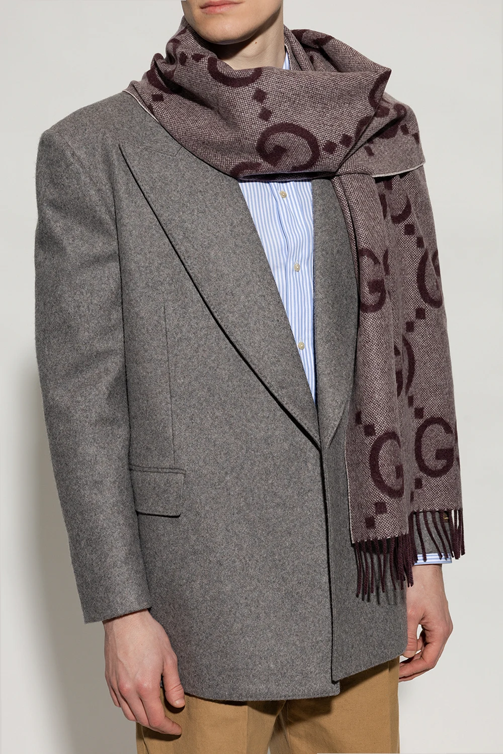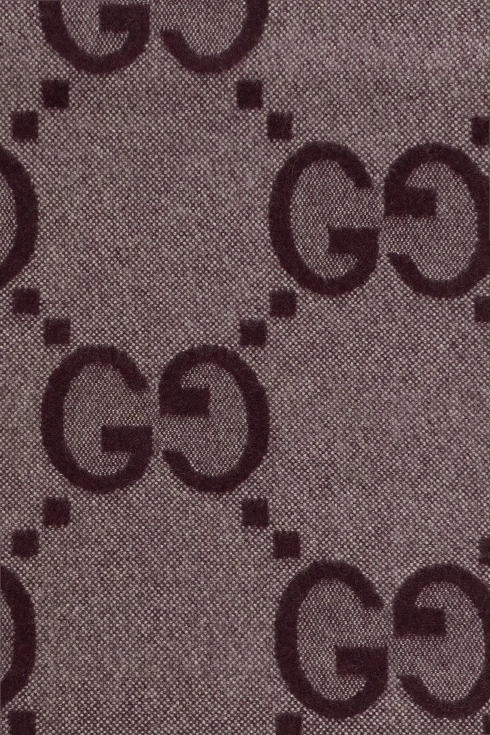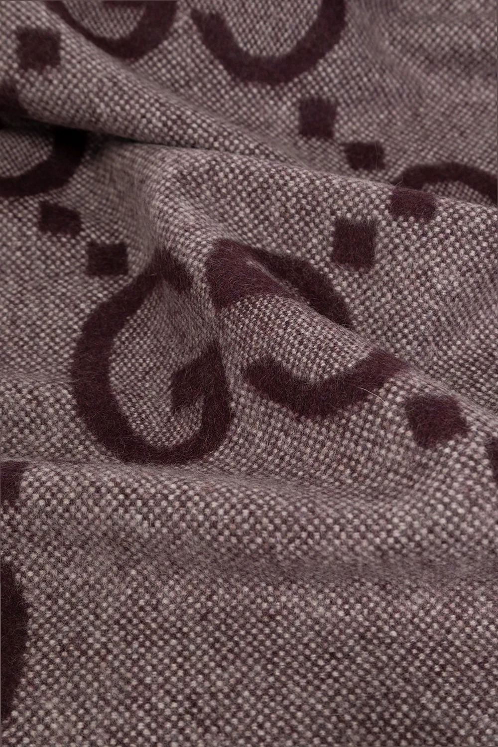 Fioletowy szal Gucci. Wykonany z kaszmiru. Ozdobiony wzorem z monogramem ‘GG’. Wykończony frędzlami.