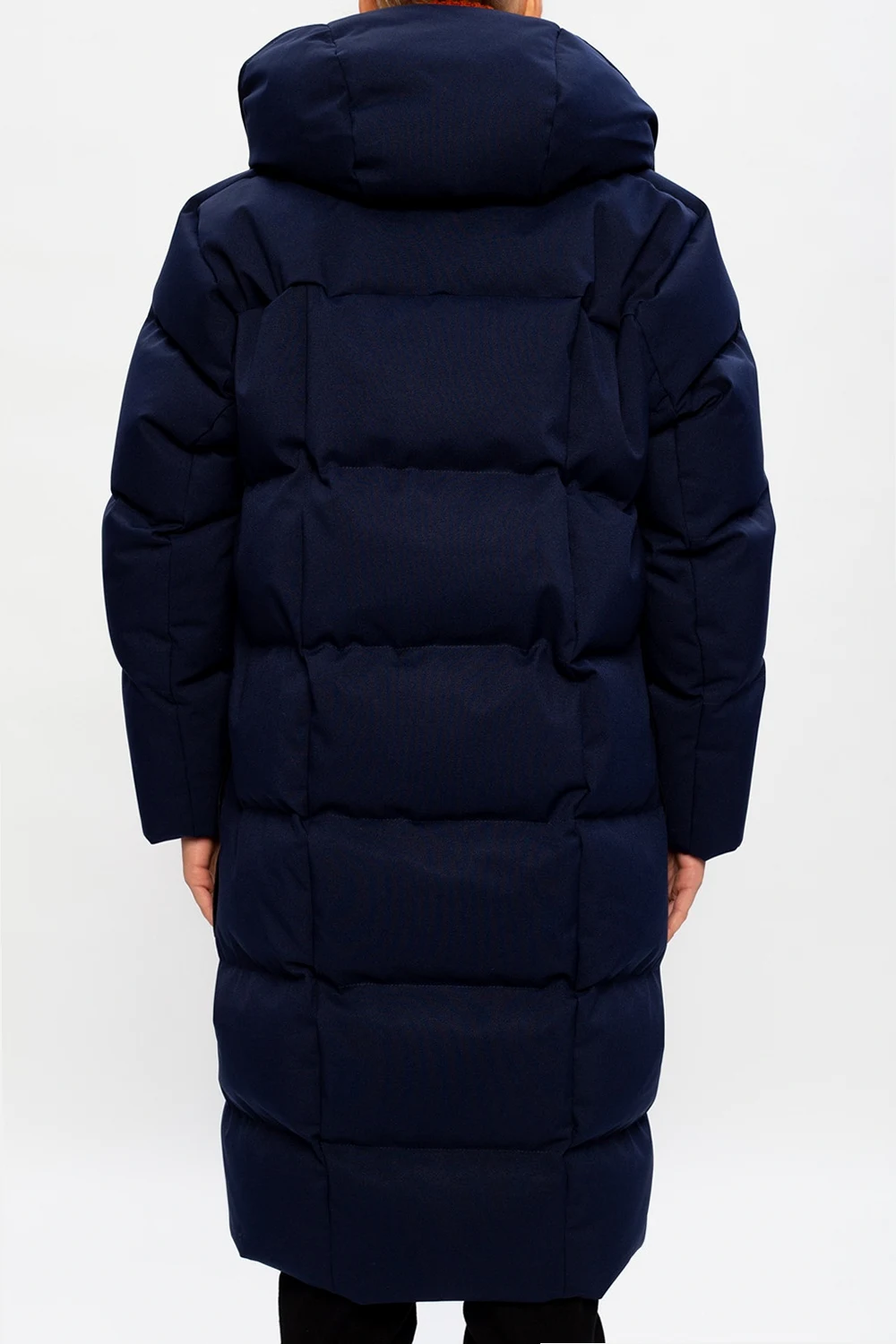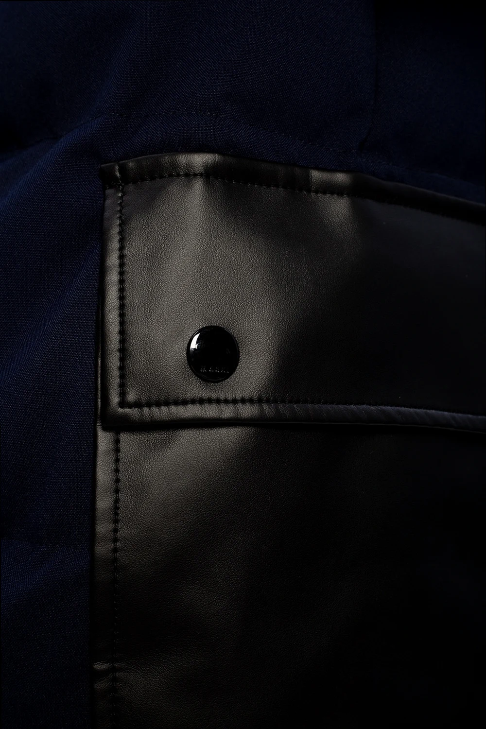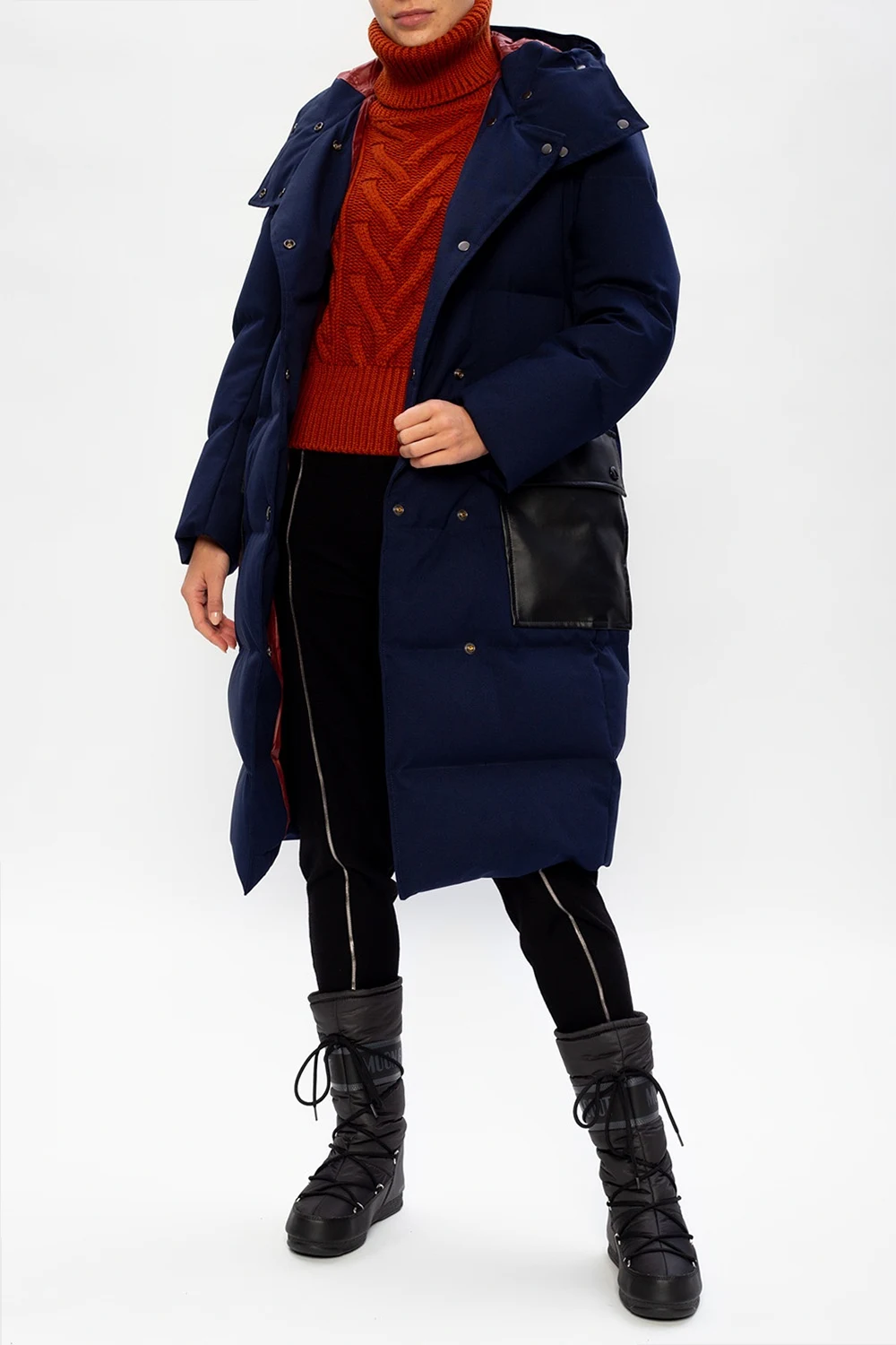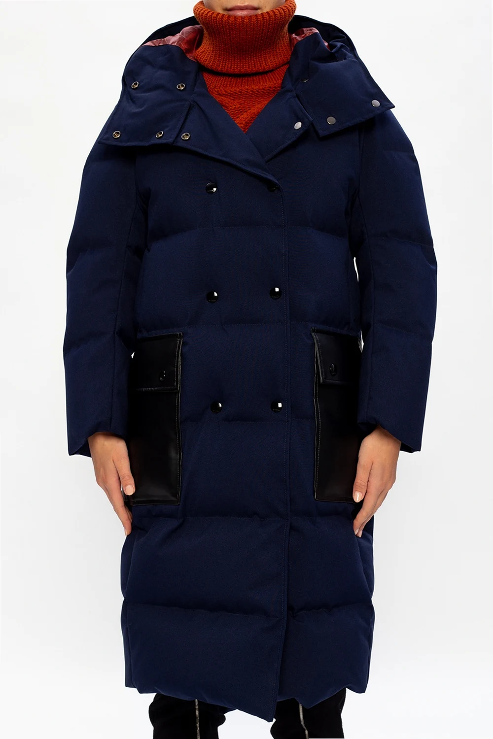 Granatowo-czarna, pikowana, puchowa kurtka z kapturem Marni. Dwurzędowa, zapinana na zatrzaski. Z przodu dwie kieszenie z patką zapinane na zatrzaski. Długie rękawy.