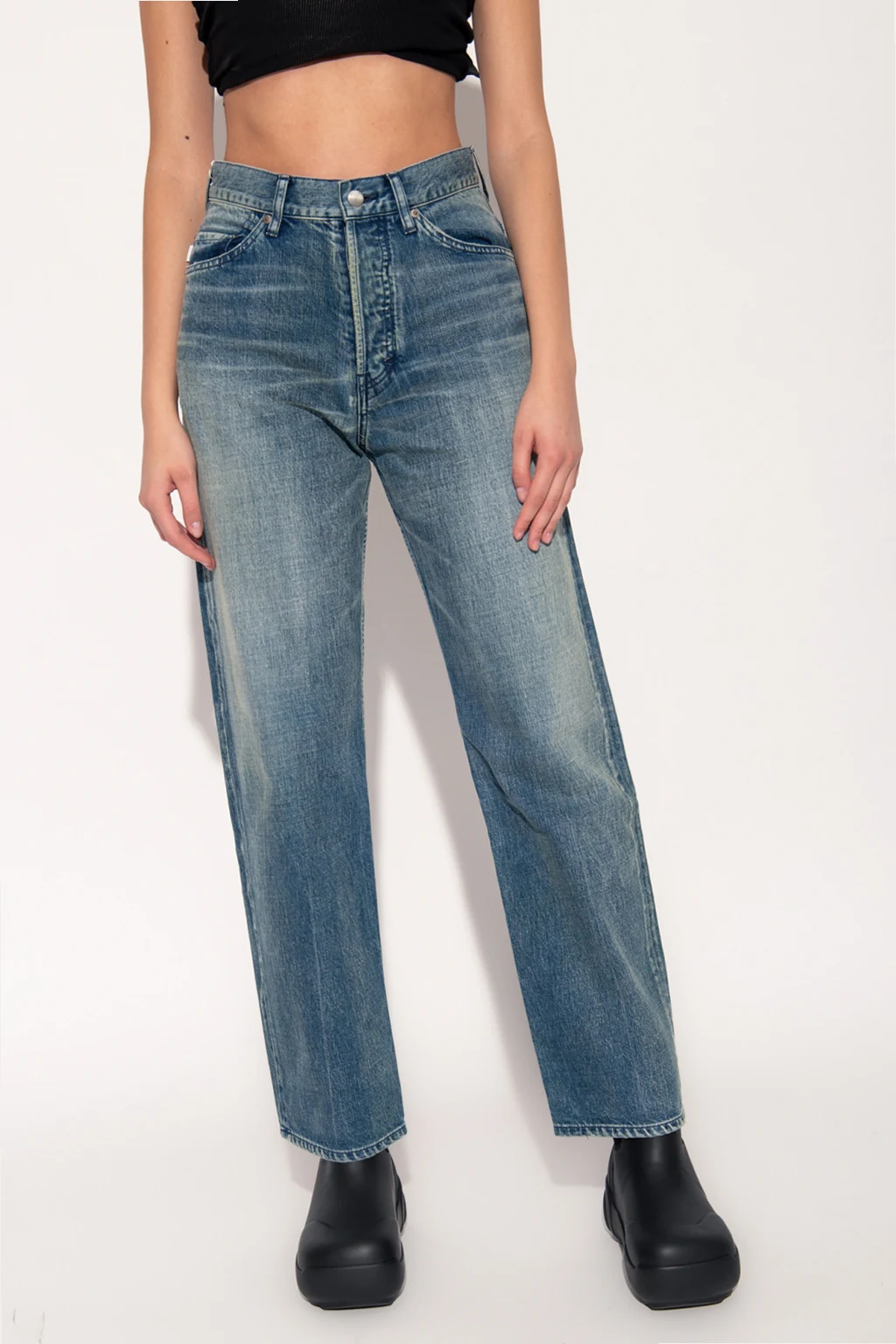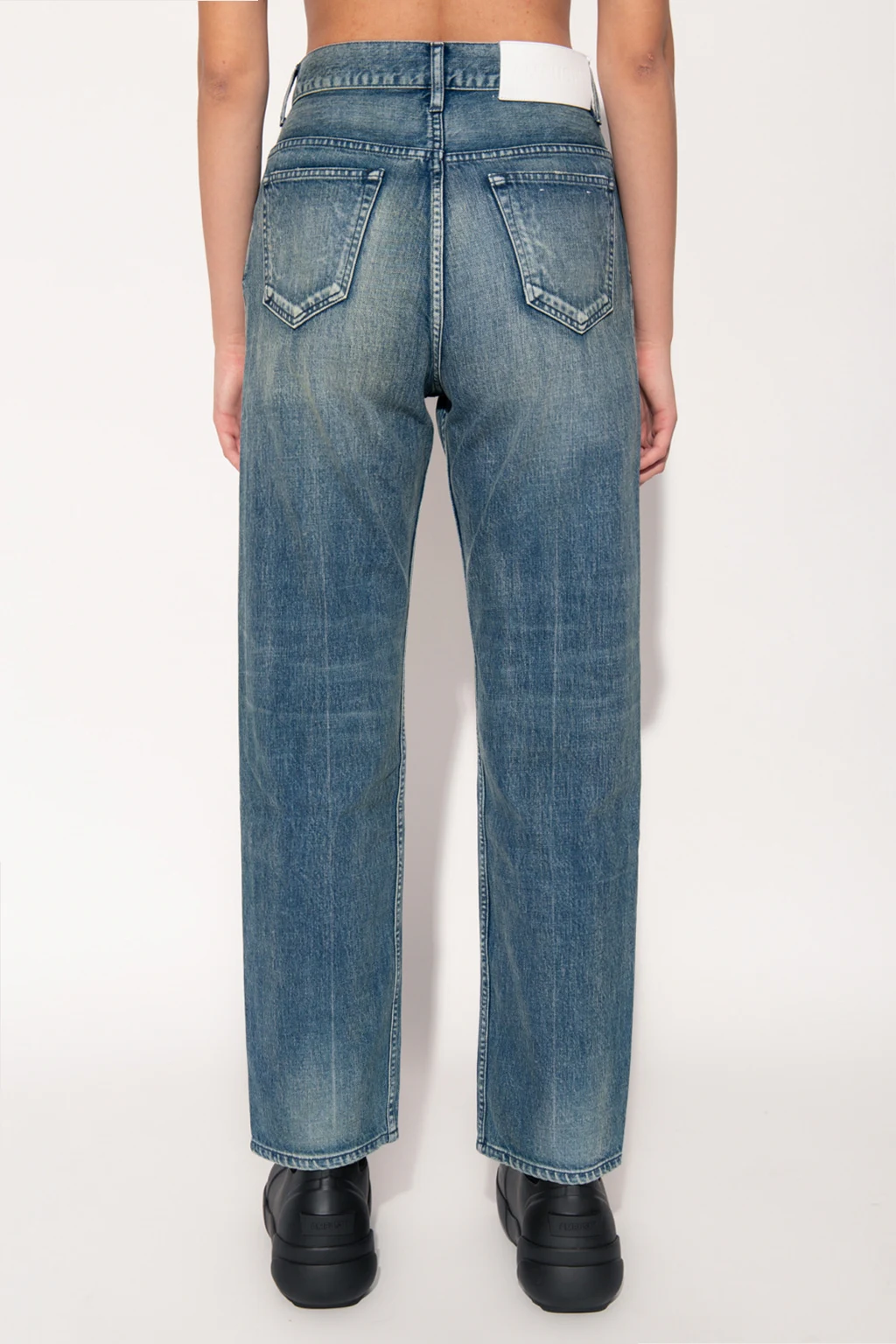 Niebieskie, przecierane jeansy typu ‘regular fit’ Ambush. Zapinane na guziki. Pięć wsuwanych kieszeni: trzy z przodu i dwie z tyłu. Z tyłu biała naszywka z logo.