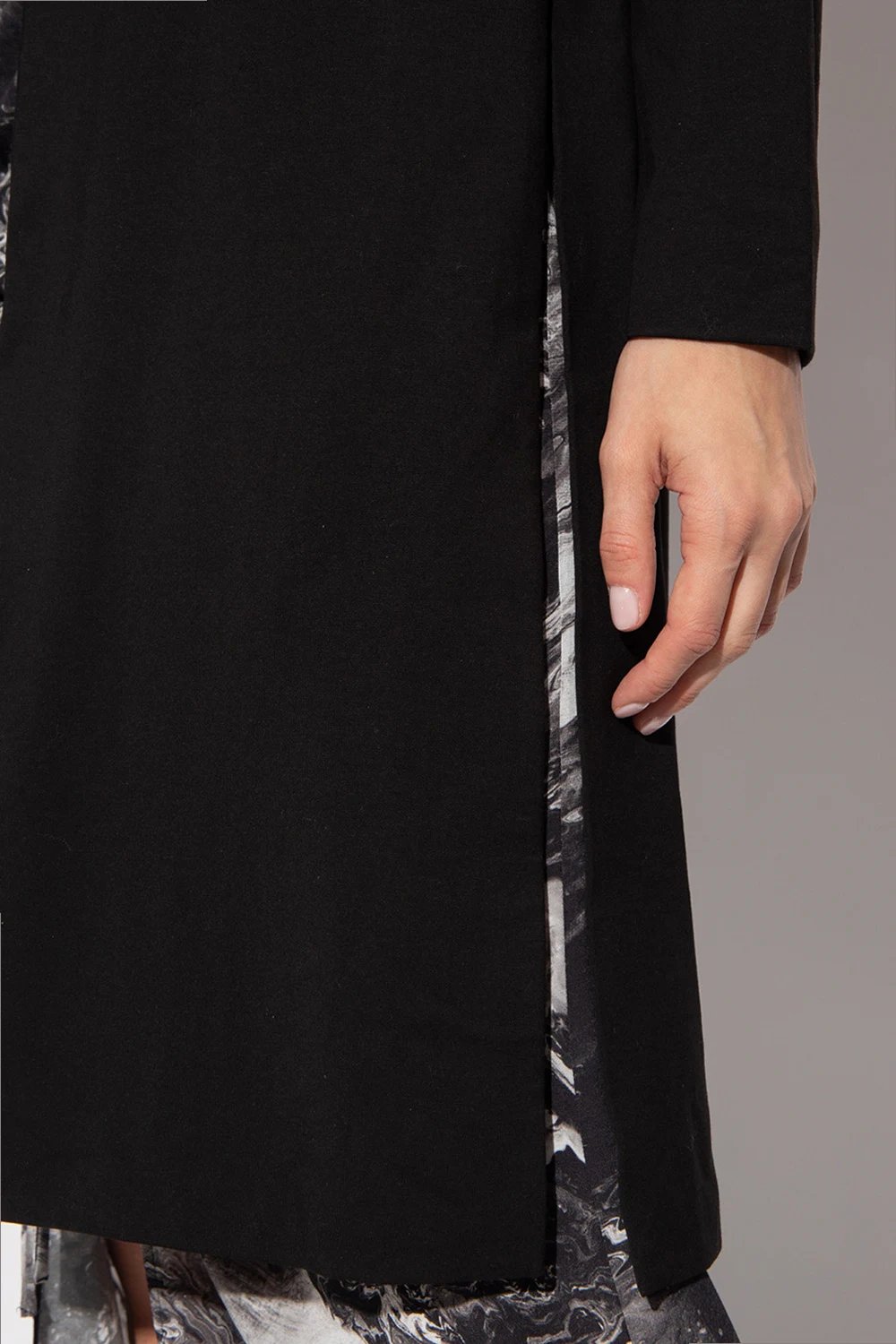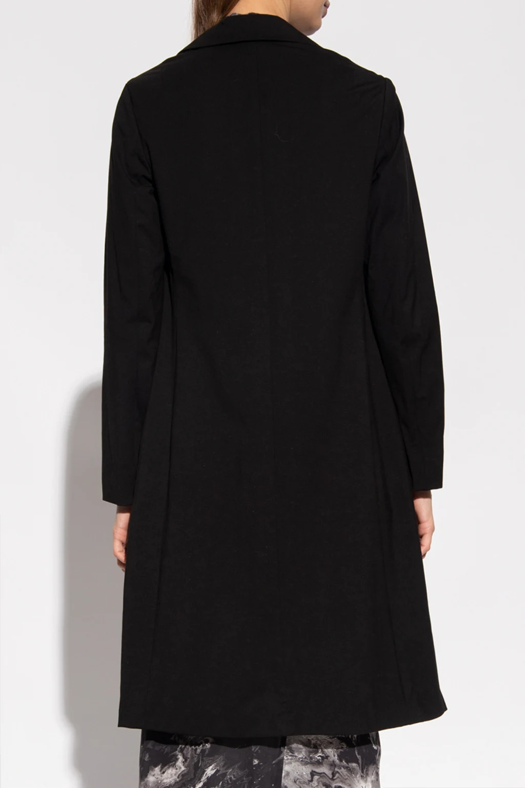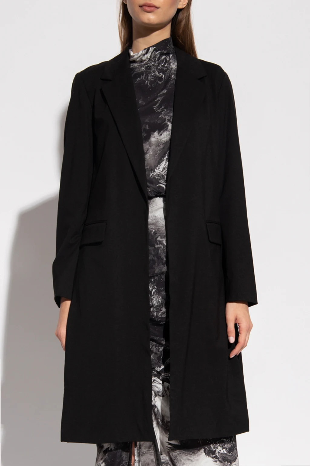 Czarny płaszcz, model ‘Aleida’ AllSaints. Z przodu dekoracyjne, otwarte klapy. Po bokach pojedyncze rozcięcie i wsuwana kieszeń.
