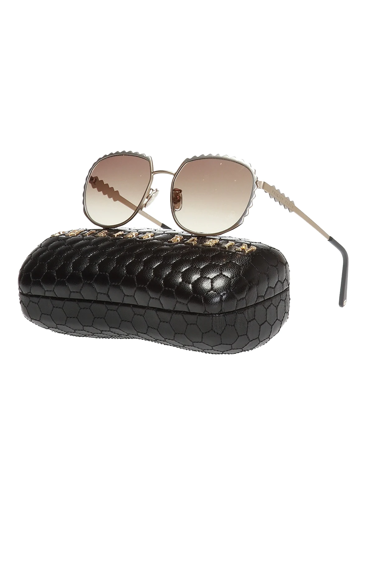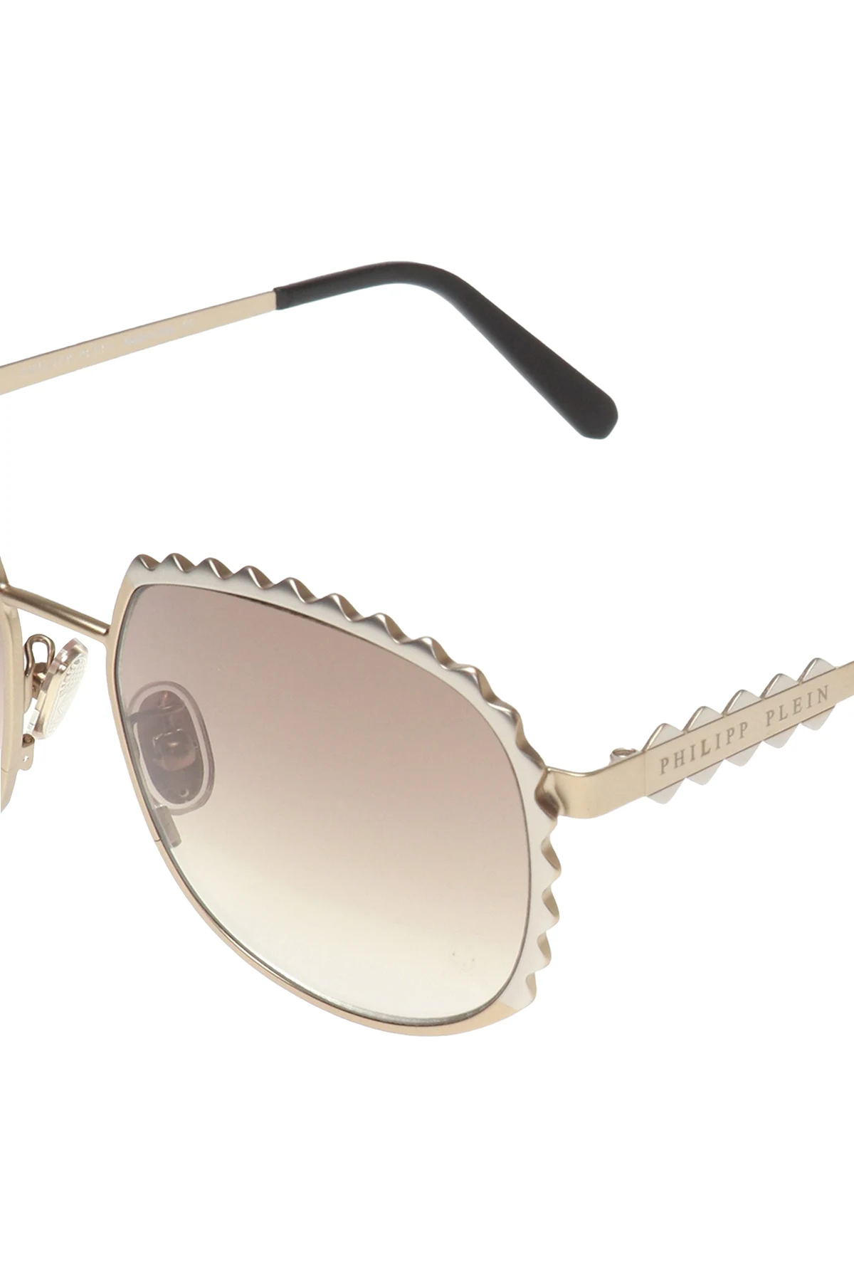 Okulary przeciwsłoneczne w kolorze srebrnym Philipp Plein. Oprawki z dekoracyjnymi wycięciami. Zauszniki z wytłoczonym logo. Brązowe, certyfikowane soczewki UVA/UVB. Dołączone etui.