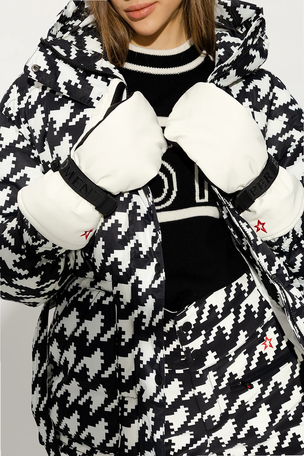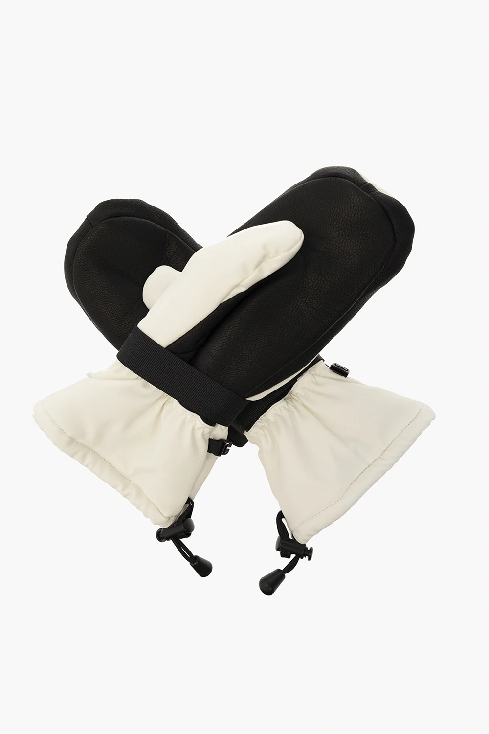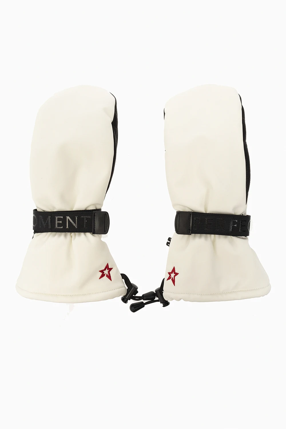 Biało-czarne rękawiczki Perfect Moment. Na nadgarstkach regulowany pas z zapięciem na rzep. Ozdobione haftem z logo w kolorze czerwonym. Wykończone skórą.