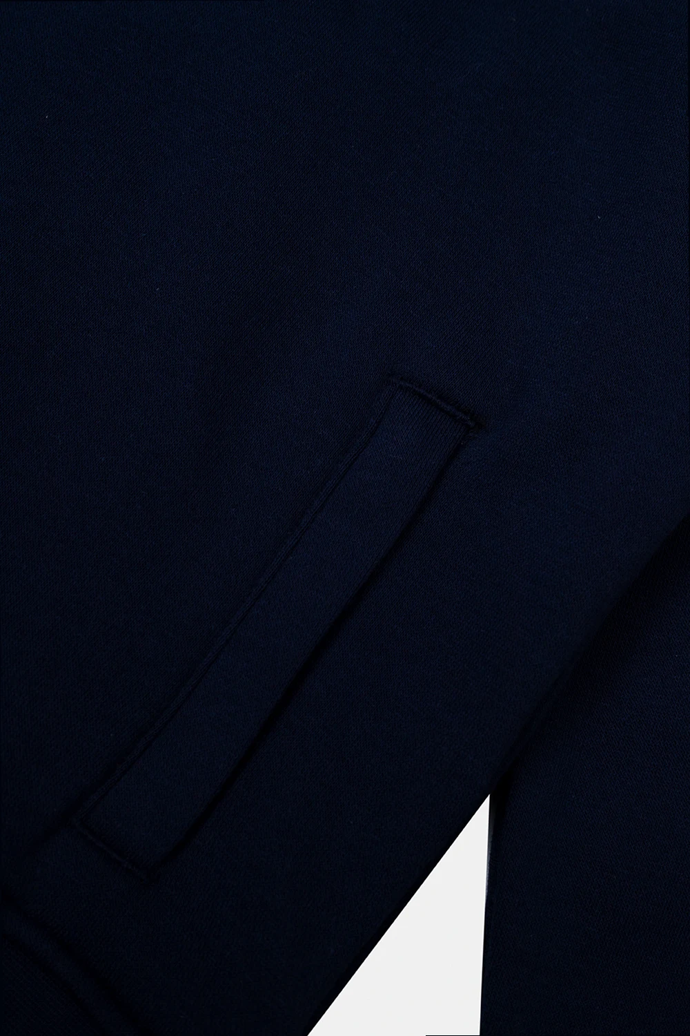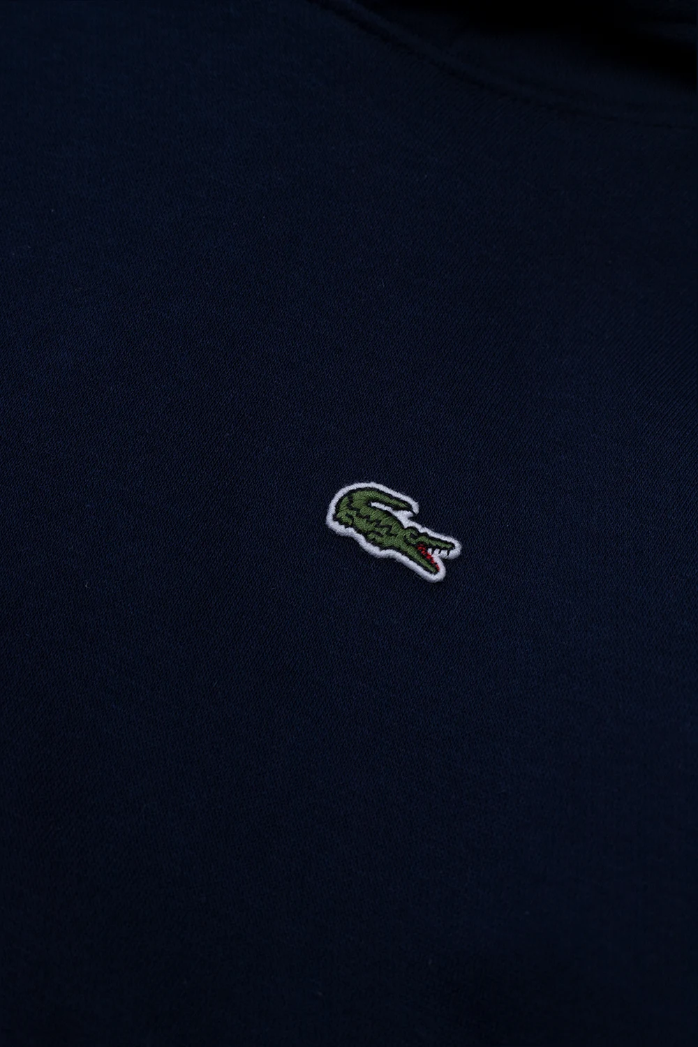 Granatowa bluza z kapturem Lacoste Kids. Ozdobiona naszywką z logo. Dwie kieszenie zapinane na zamek. Dół oraz długie rękawy wykończone ściągaczem.