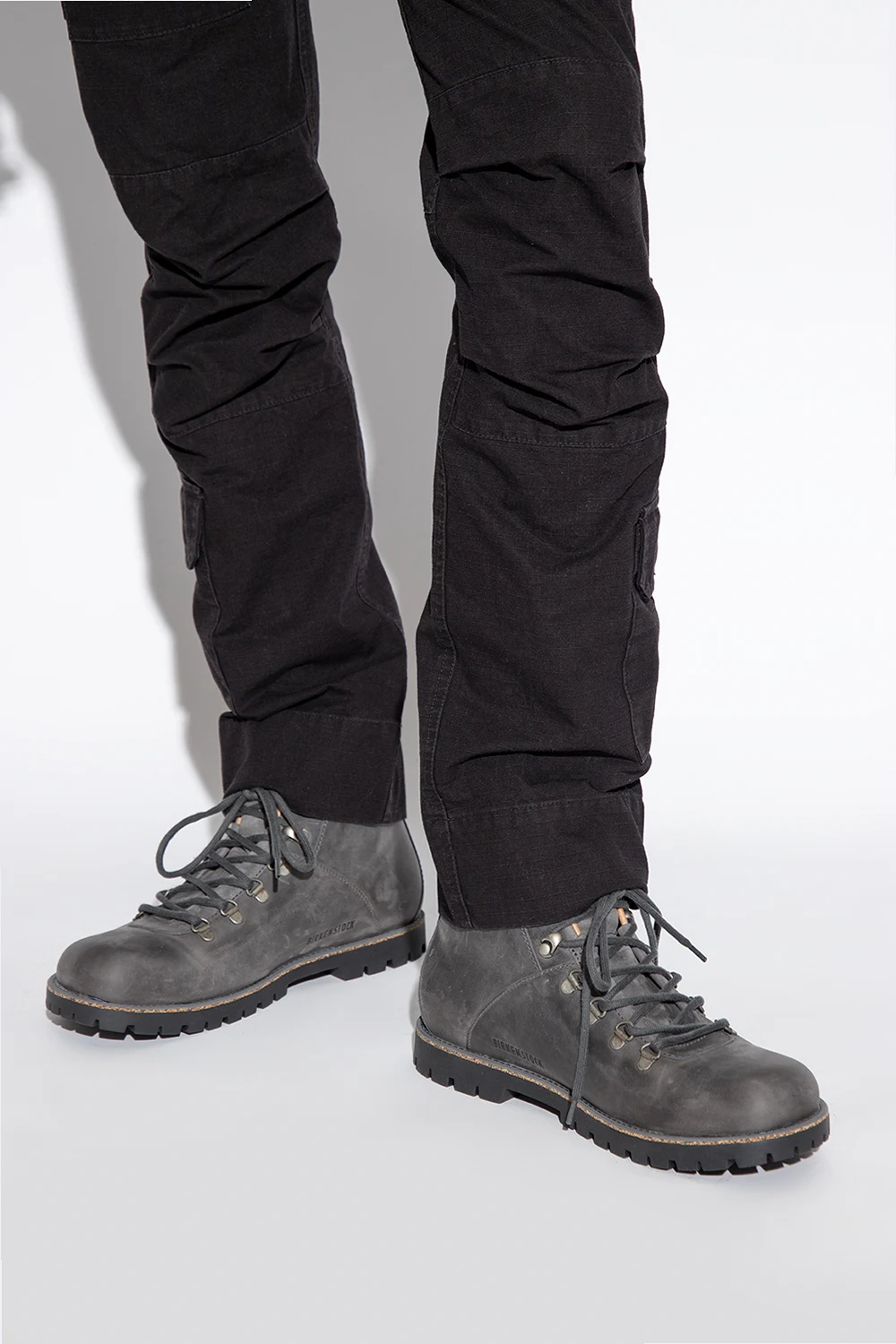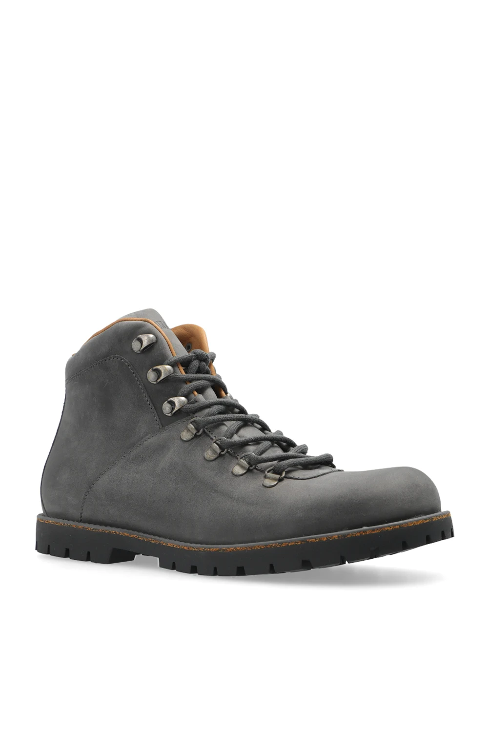 Szare, sznurowane buty za kostkę, model ‘Jackson’ Birkenstock. Wodoodporna cholewka wykonana z olejowanej skóry nubukowej. Woskowane szwy. Na języku wytłoczone logo. Wyjmowana, anatomicznie ukształtowana wkładka korkowo-lateksowa. Czarna, antypoślizgowa podeszwa wykonana z gumy.