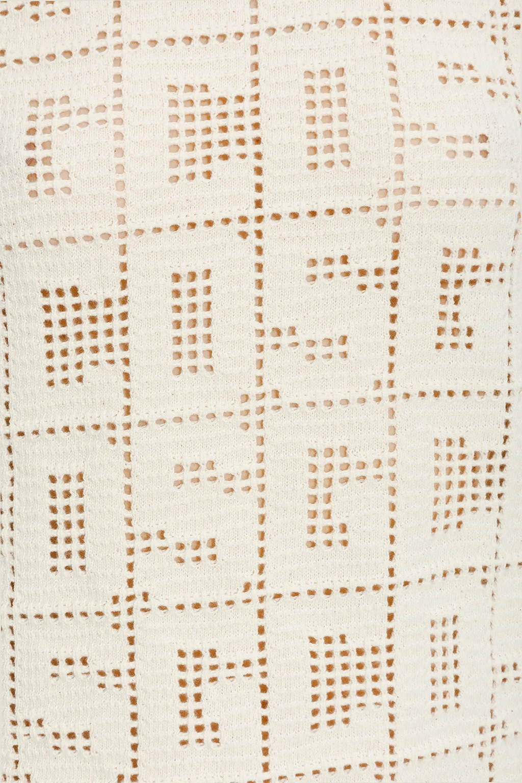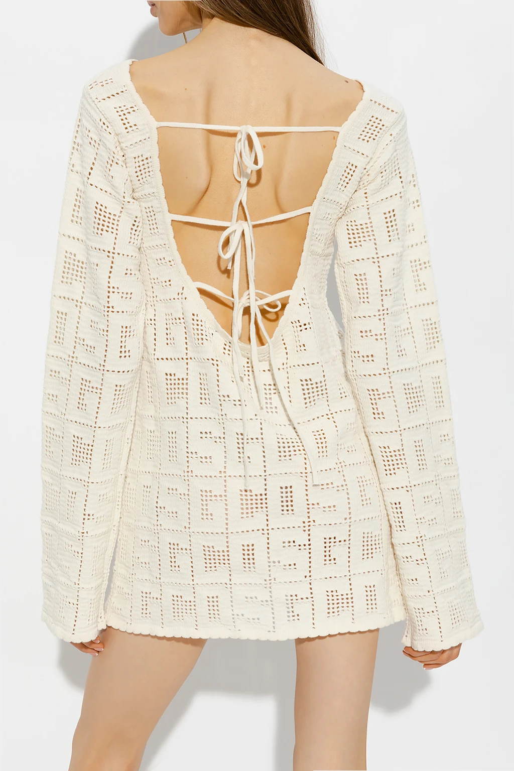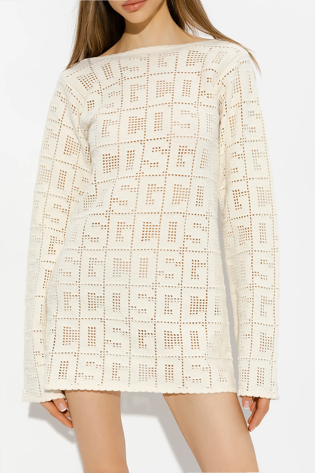 Kremowa, krótka sukienka GCDS. Wykonana częściowo z bawełny. Z tyłu sznurowana. Ozdobiona ażurowym wzorem z motywem logo. Dekoracyjnie wykończony dekolt w łódkę. Długie, rozszerzane rękawy.