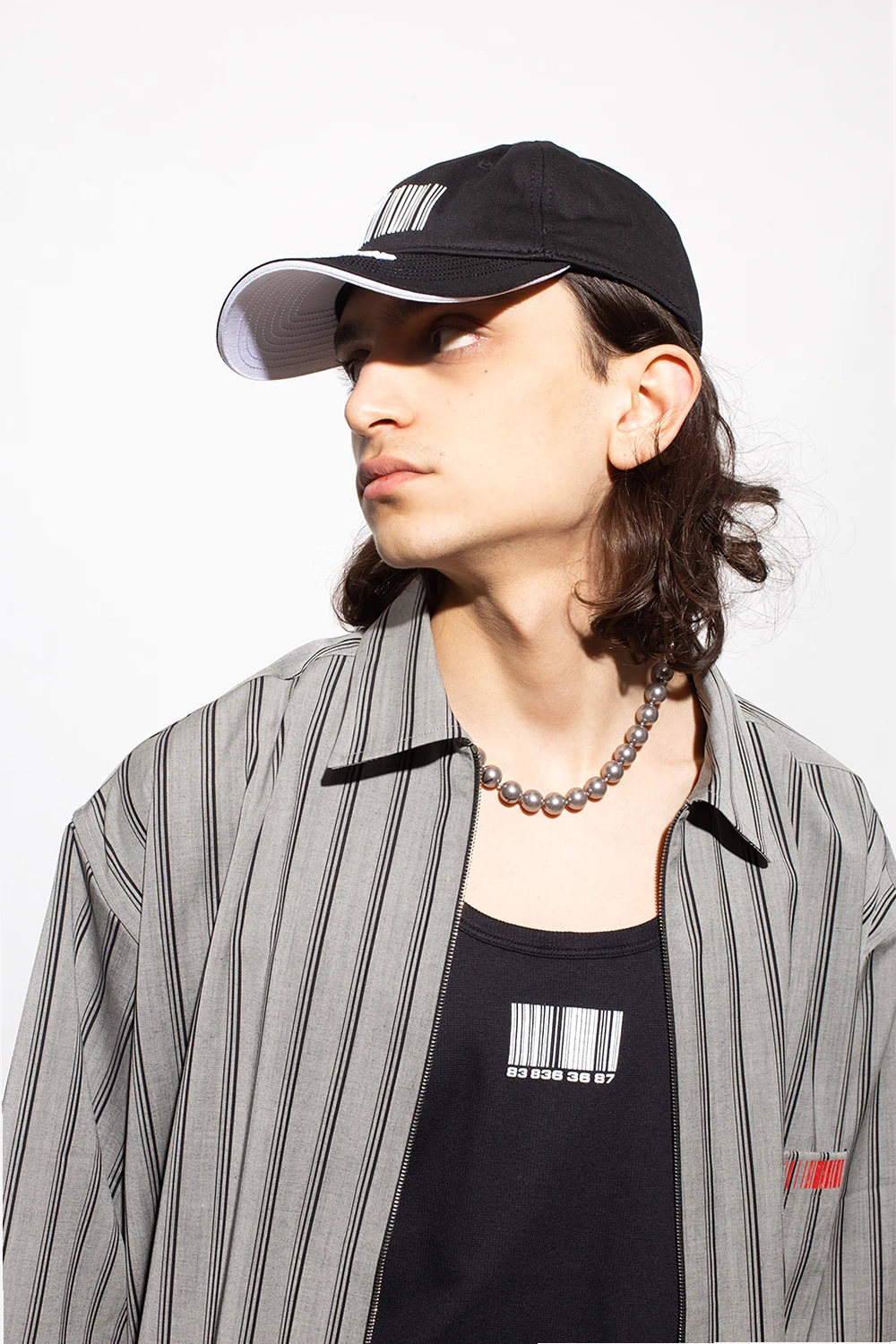 Naszyjnik w kolorze srebrnym VTMNTS. Wykonany z mosiądzu. Zapinany na dekoracyjny zaczep z wygrawerowanym, charakterystycznym dla marki motywem kodu kreskowego. Sztuczne perły w kolorze srebrnym ozdobione nadrukowanym napisem ‘VTMNTS’