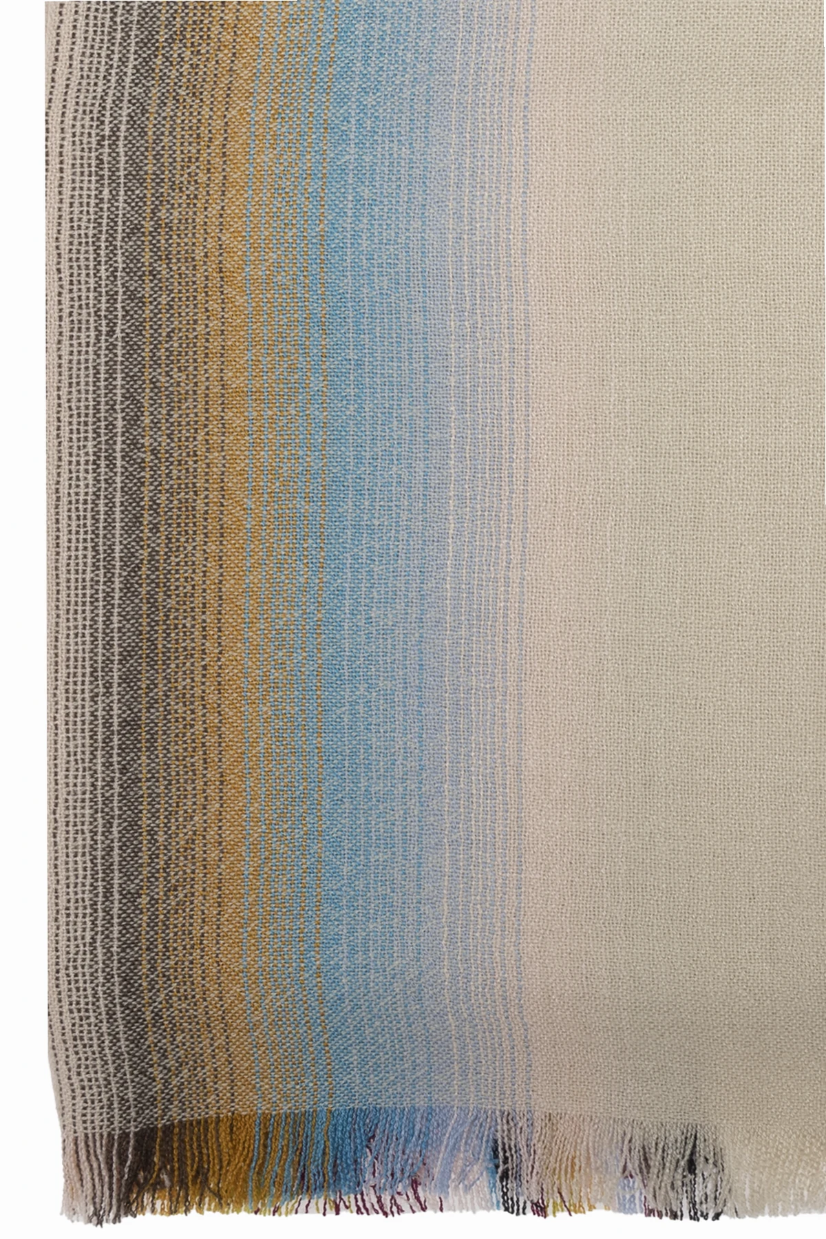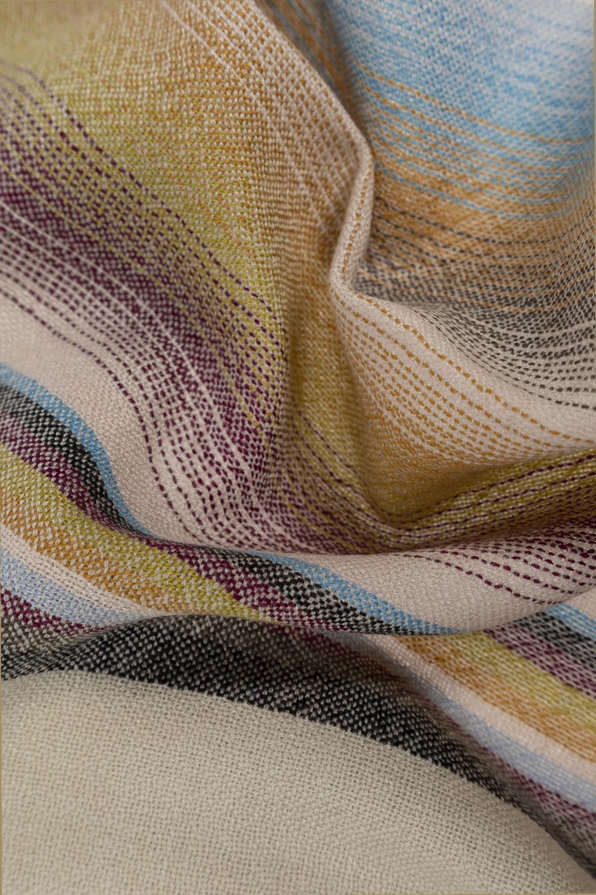 Dominujący beżowy kolor w połączeniu z subtelnymi pasami w odcieniach niebieskiego, żółtego, fioletowego i czarnego tworzy harmonijną kompozycję, podkreślającą unikalność wzoru. Wykonany z najwyższej jakości materiałów, szal łączy w sobie miękkość wełny z delikatnością jedwabiu, co nadaje mu wyjątkową lekkość i styl.