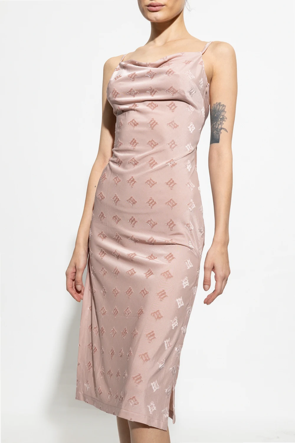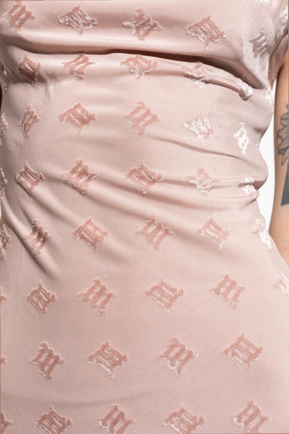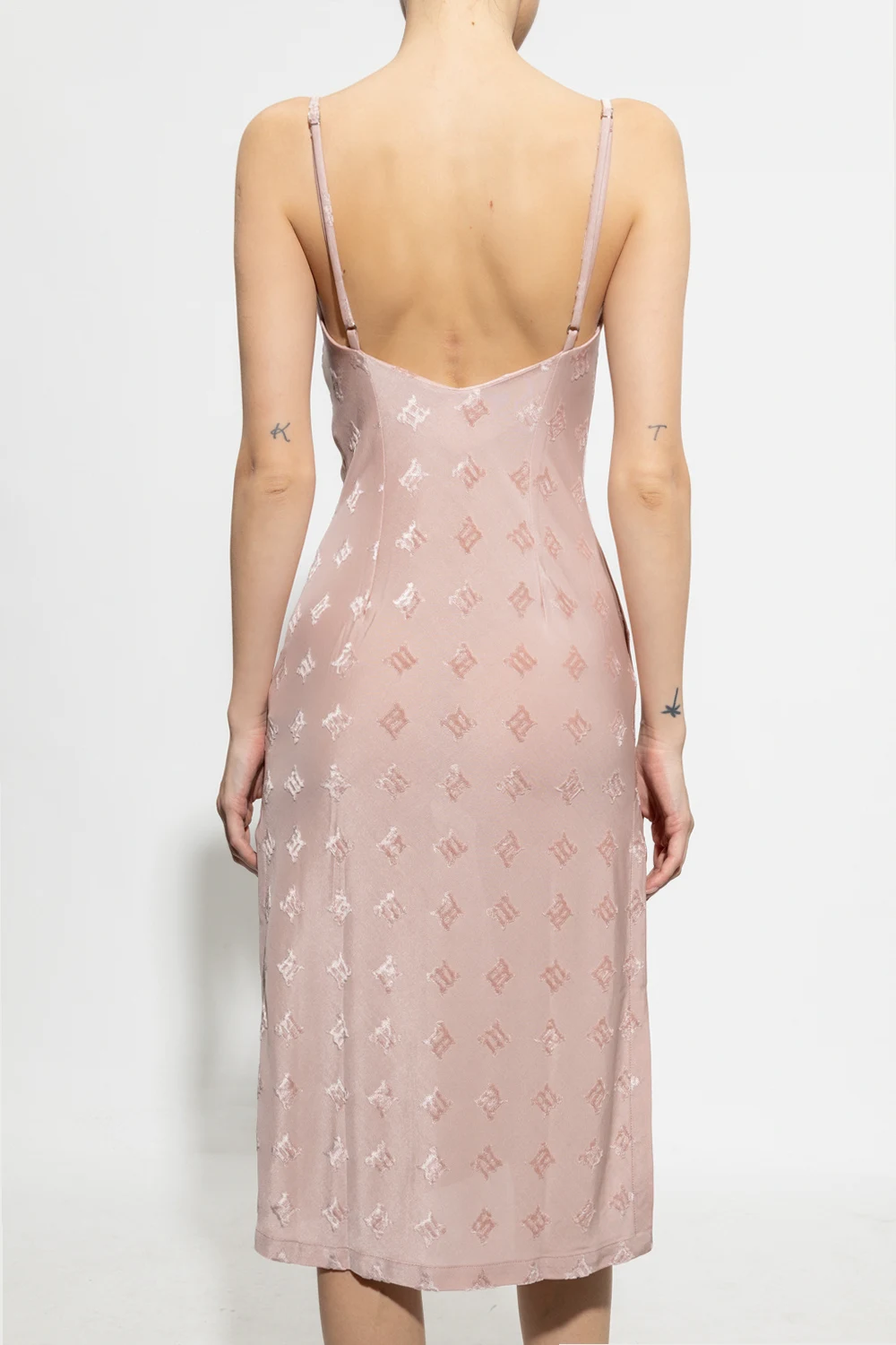 Jasnoróżowa sukienka na ramiączkach MISBHV. Zapinana na kryty zamek. Ozdobiona welurowym wzorem z monogramem. Po bokach rozcięcia. Z tyłu półokrągłe wycięcie. Cienkie ramiączka z możliwością regulacji długości.