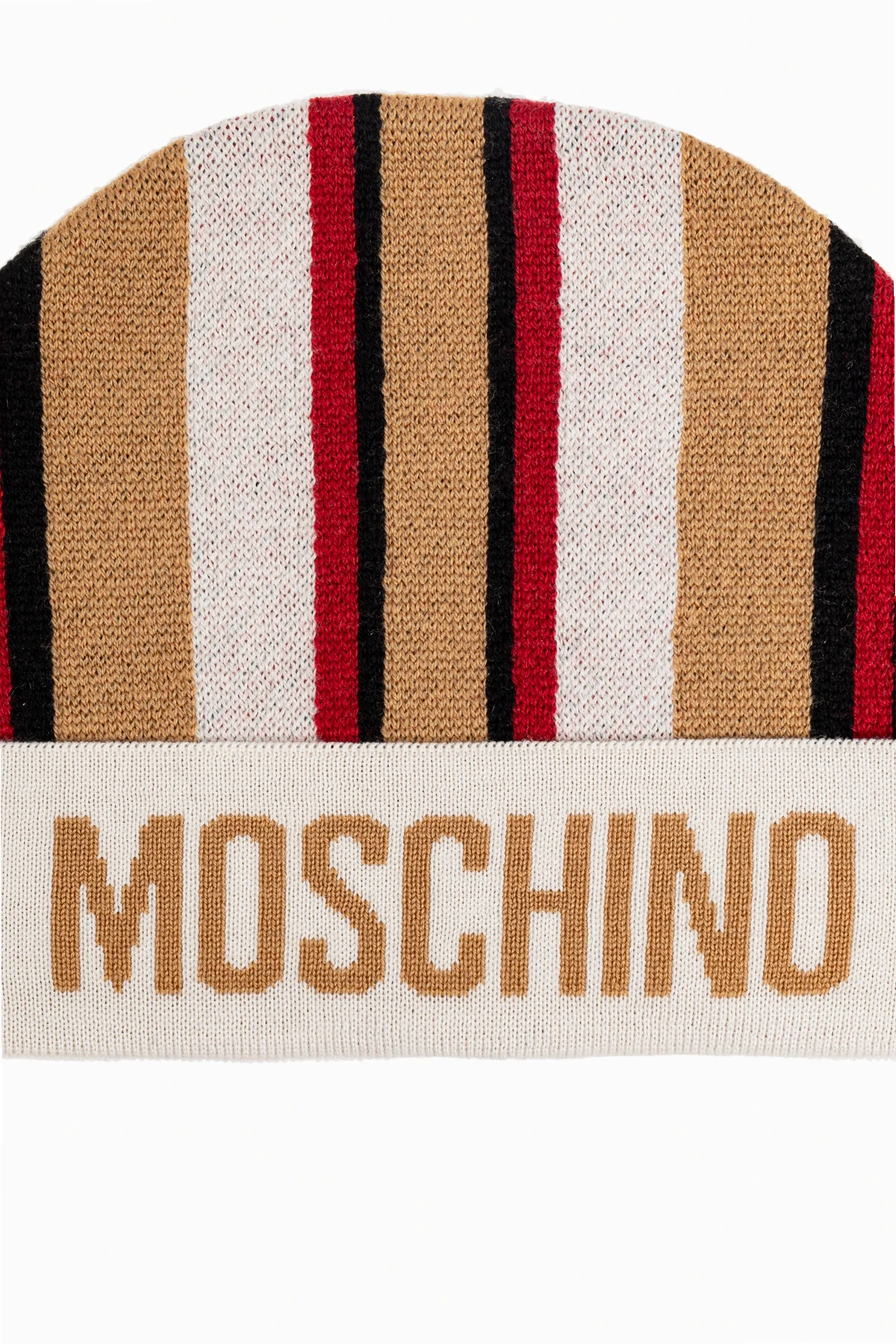 Wykonana z najwyższej jakości wełny, czapka gwarantuje ciepło i komfort noszenia, idealne na chłodniejsze dni. Na szerokim, białym mankiecie, znajduje się duży, beżowy napis "MOSCHINO", będący charakterystycznym elementem tej luksusowej marki.