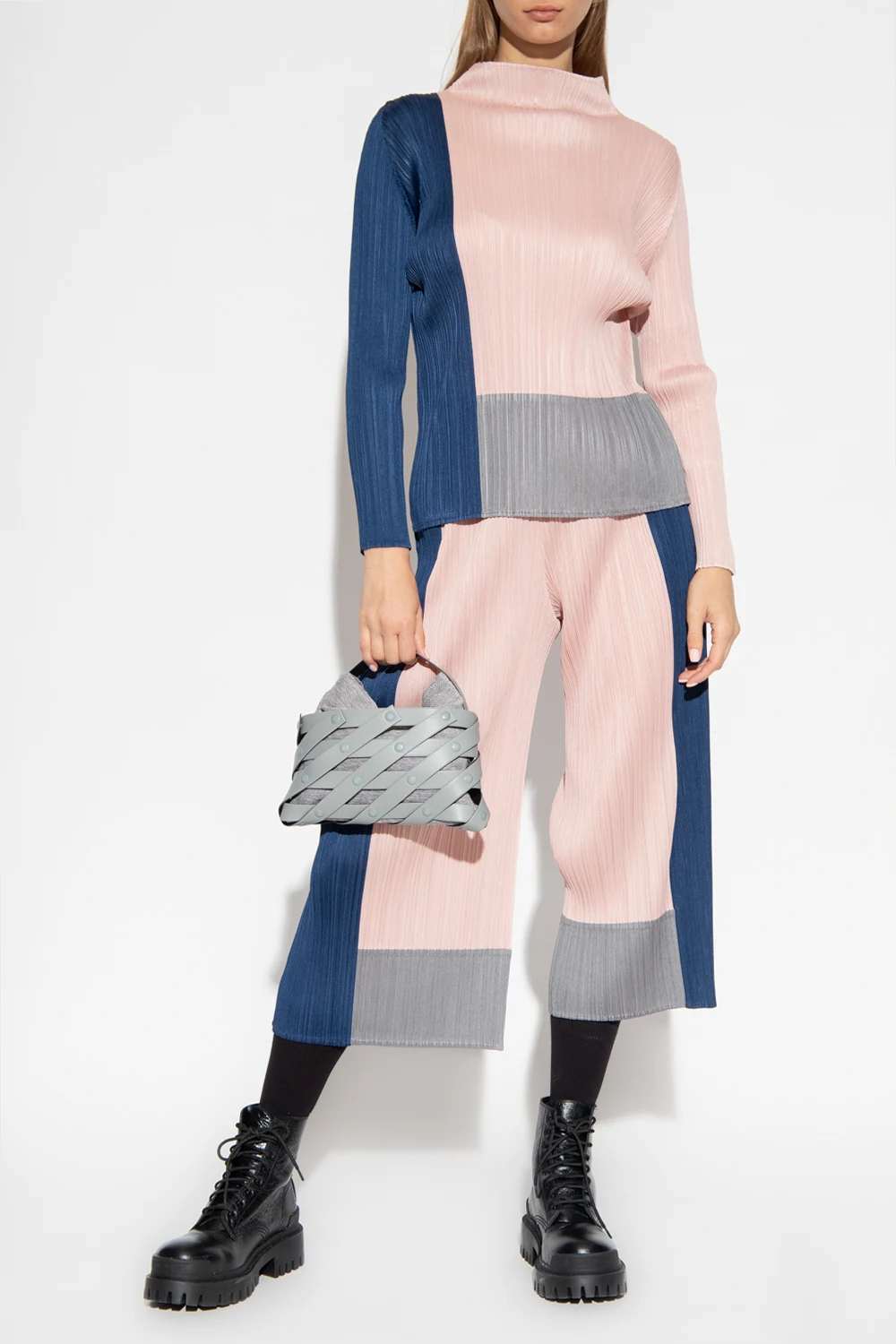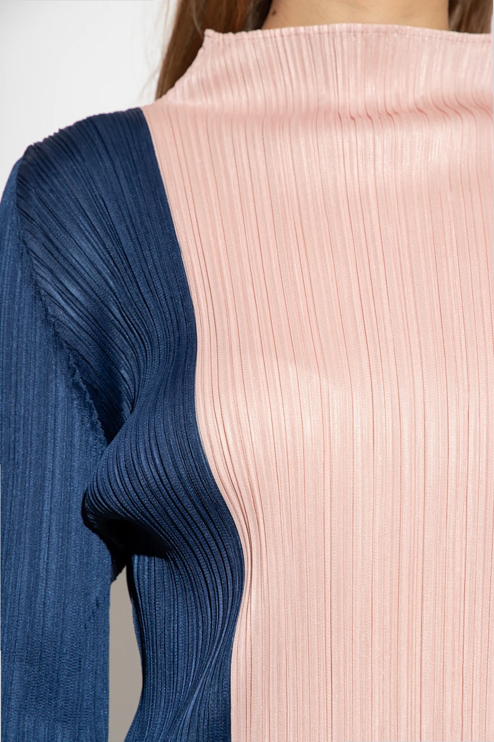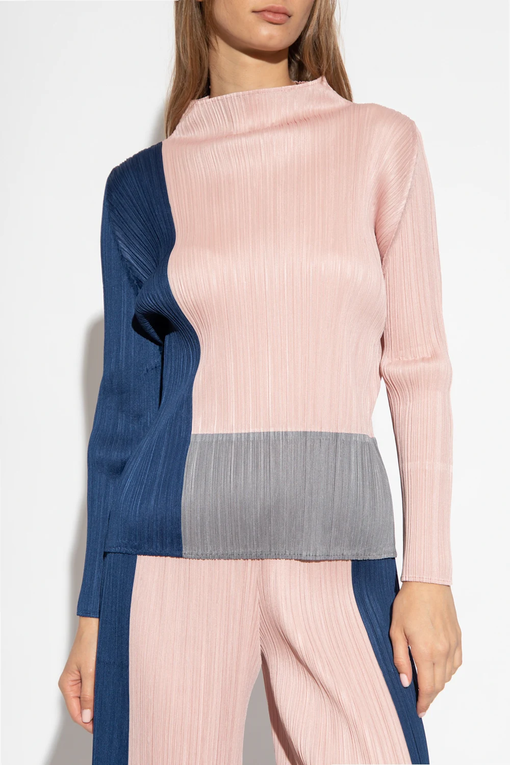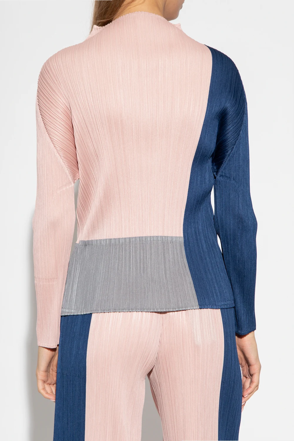 Różowo-granatowo-szary, plisowany top ze stójką Issey Miyake Pleats Please. Dopasowany krój. Długie rękawy.