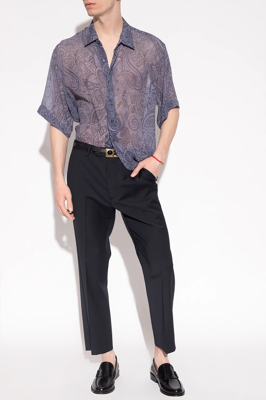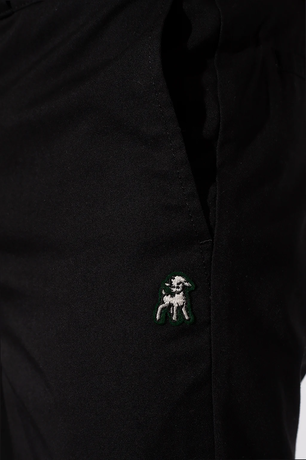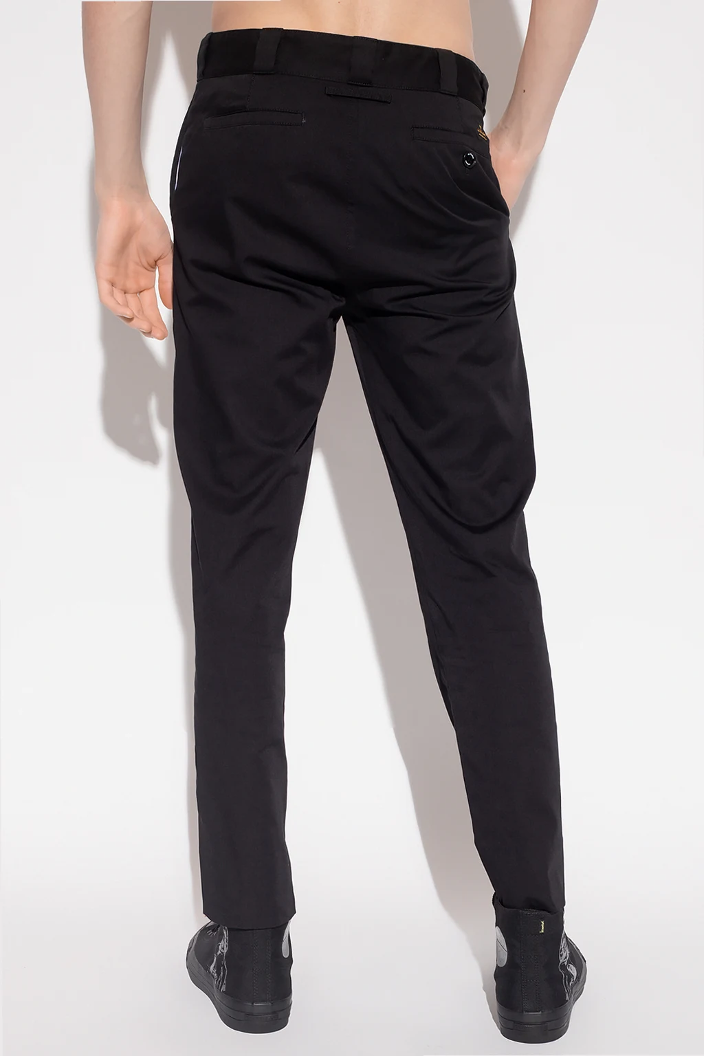 Czarne spodnie Undercover. Zapinane na zamek i zaczep. Z przodu naszywka z logo. Pięć kieszeni: trzy z przodu i dwie z tyłu, jedna zapinana na guzik. Lekko zwężane nogawki.