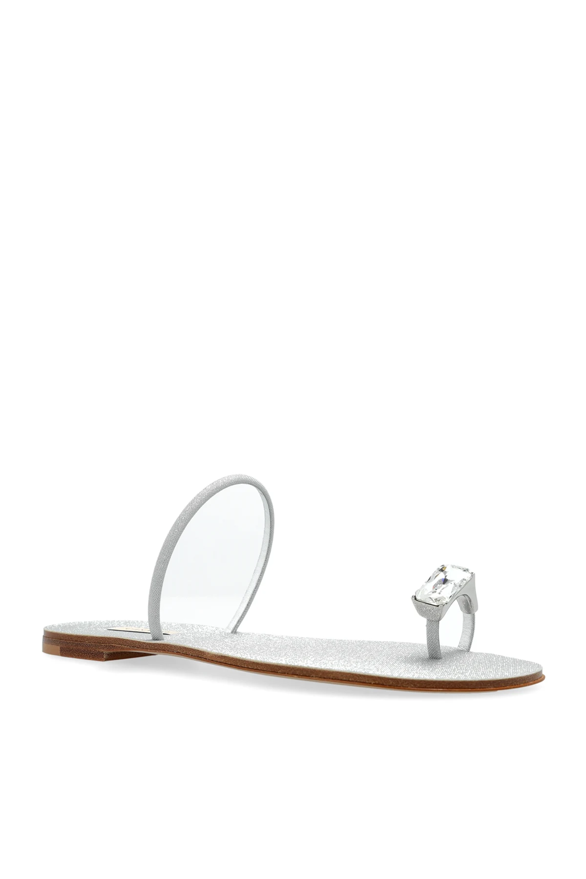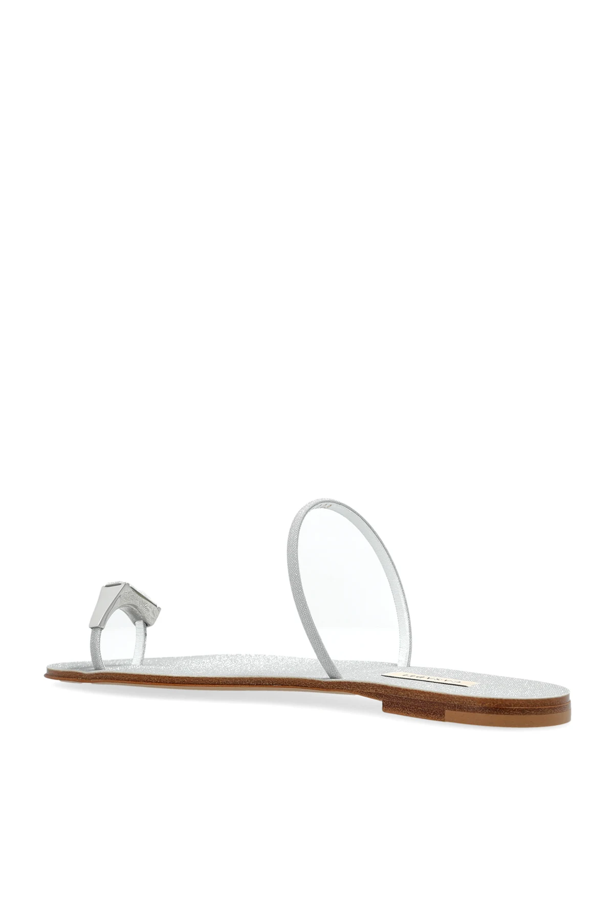 Wyjątkowy projekt wyróżnia się płaską podeszwą z delikatnym, brązowym wykończeniem oraz dwoma paskami - jednym z ozdobnym kryształem wokół palca i subtelnym okrągłym paskiem nad śródstopiem. Błyszczące metaliczne wykończenie dodaje im nowoczesnego charakteru.