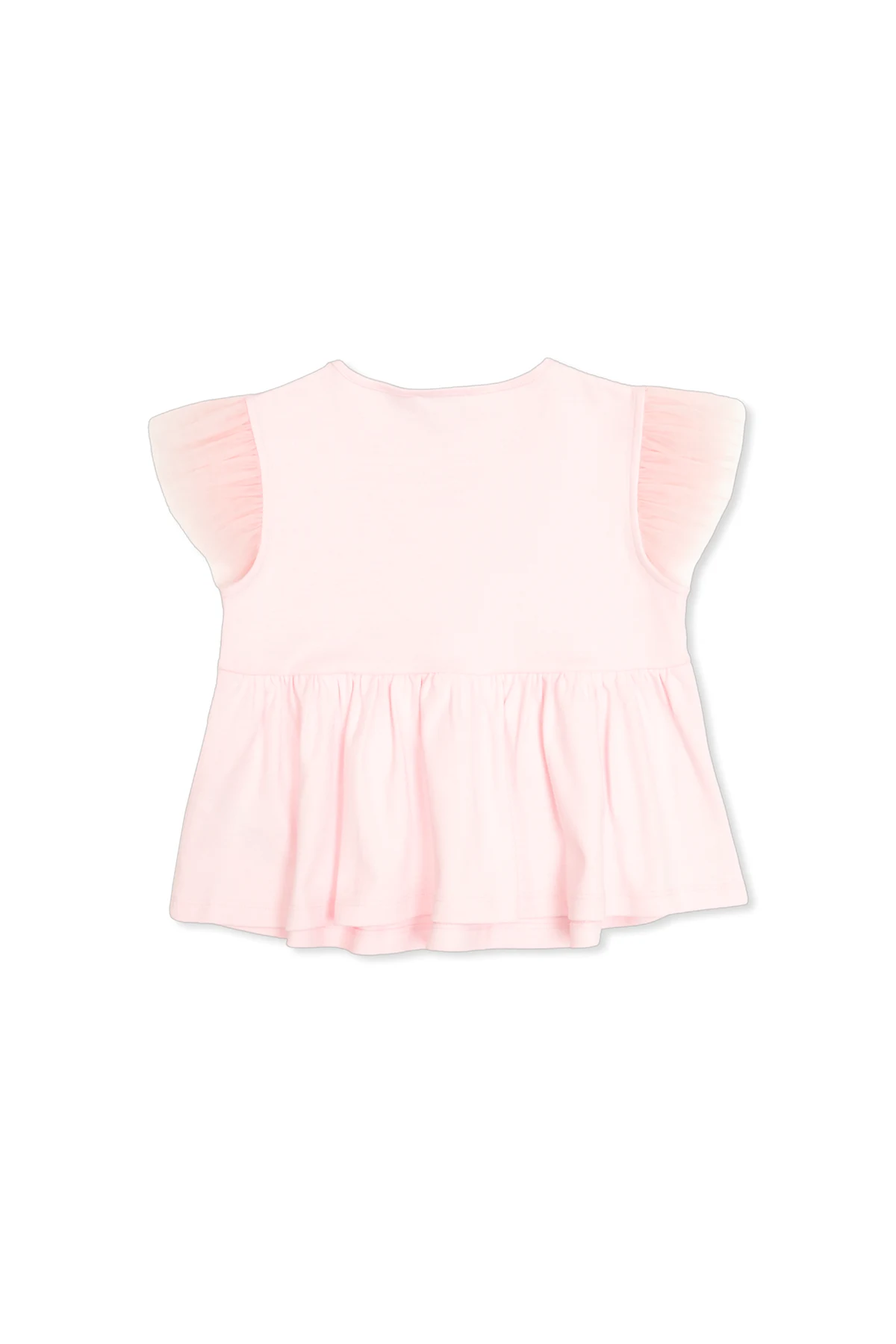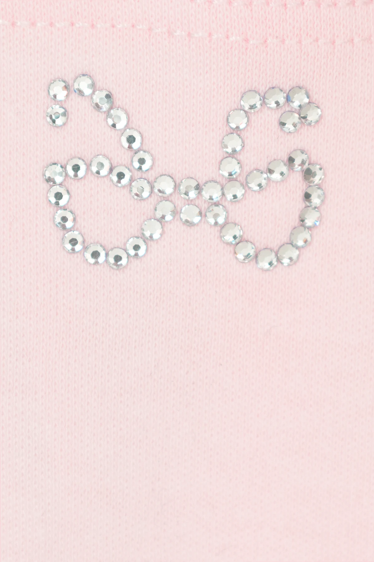 Luźny krój z rozkloszowaną dolną częścią nadaje jej dziewczęcego uroku, idealnego na specjalne okazje. Ozdobna aplikacja w kształcie kokardki, wykonana z błyszczących kryształków, dodaje blasku i ekskluzywności, czyniąc ją wyjątkową propozycją dla małych elegantek.