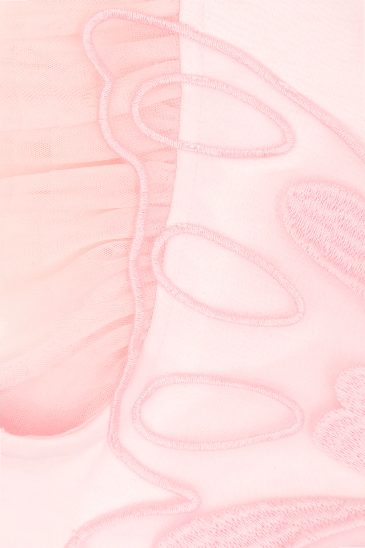 Na przodzie sukienki uwagę przykuwa wyrazisty motyw motyla , misternie wykonany z delikatnego haftu, który dodaje jej niepowtarzalnej elegancji. Wykonana z najwyższej jakości, miękkiej bawełny , zapewnia niebywały komfort noszenia, a rękawy zdobione tiulem wprowadzają subtelną lekkość.