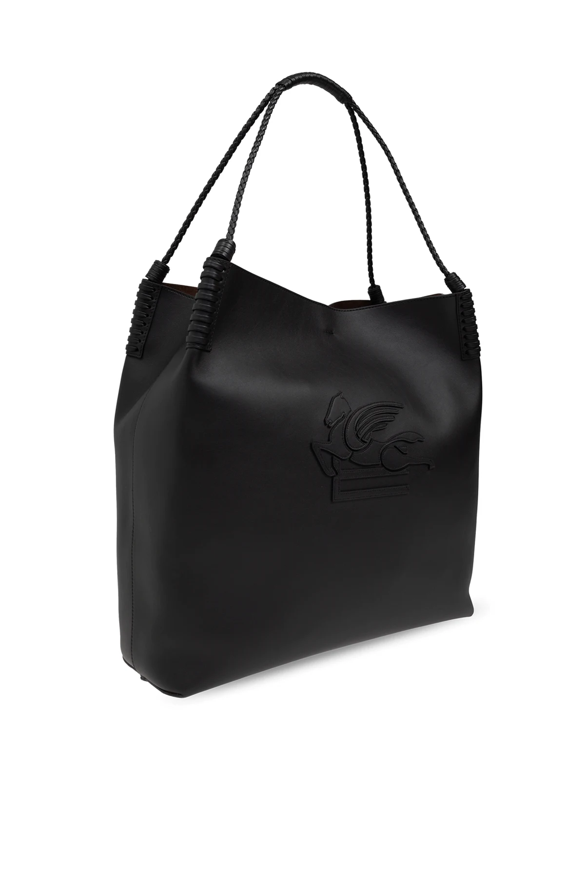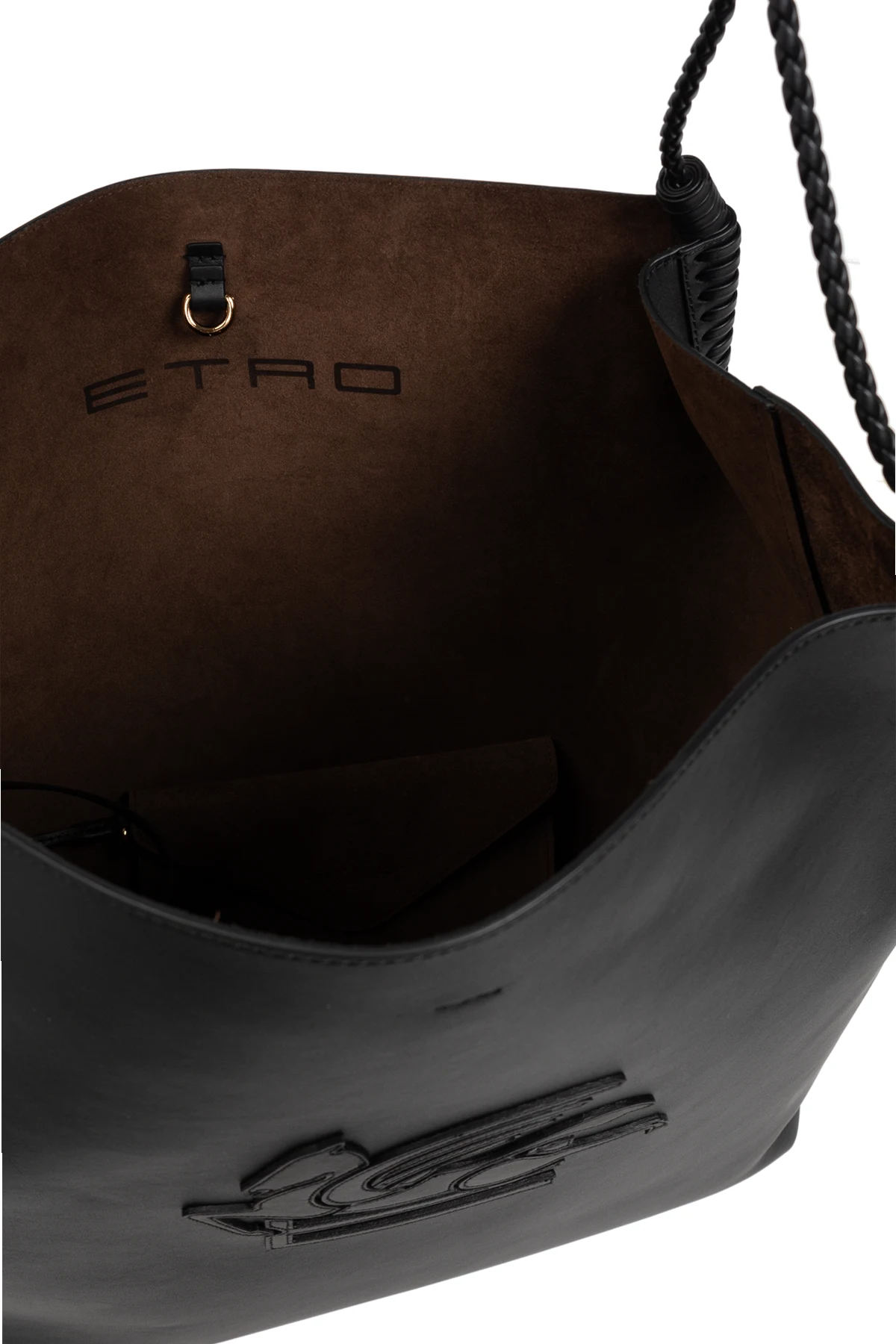 Na przedniej stronie torby znajduje się stylizowane, wytłoczone logo, które dodaje jej niepowtarzalnego charakteru. Solidne, plecione uchwyty zapewniają komfort noszenia. Wnętrze torby, wyłożone ciemnym materiałem, kryje w sobie brązową, welurową kopertówkę z wytłoczonym logo "ETRO", która stanowi elegancki i funkcjonalny dodatek.