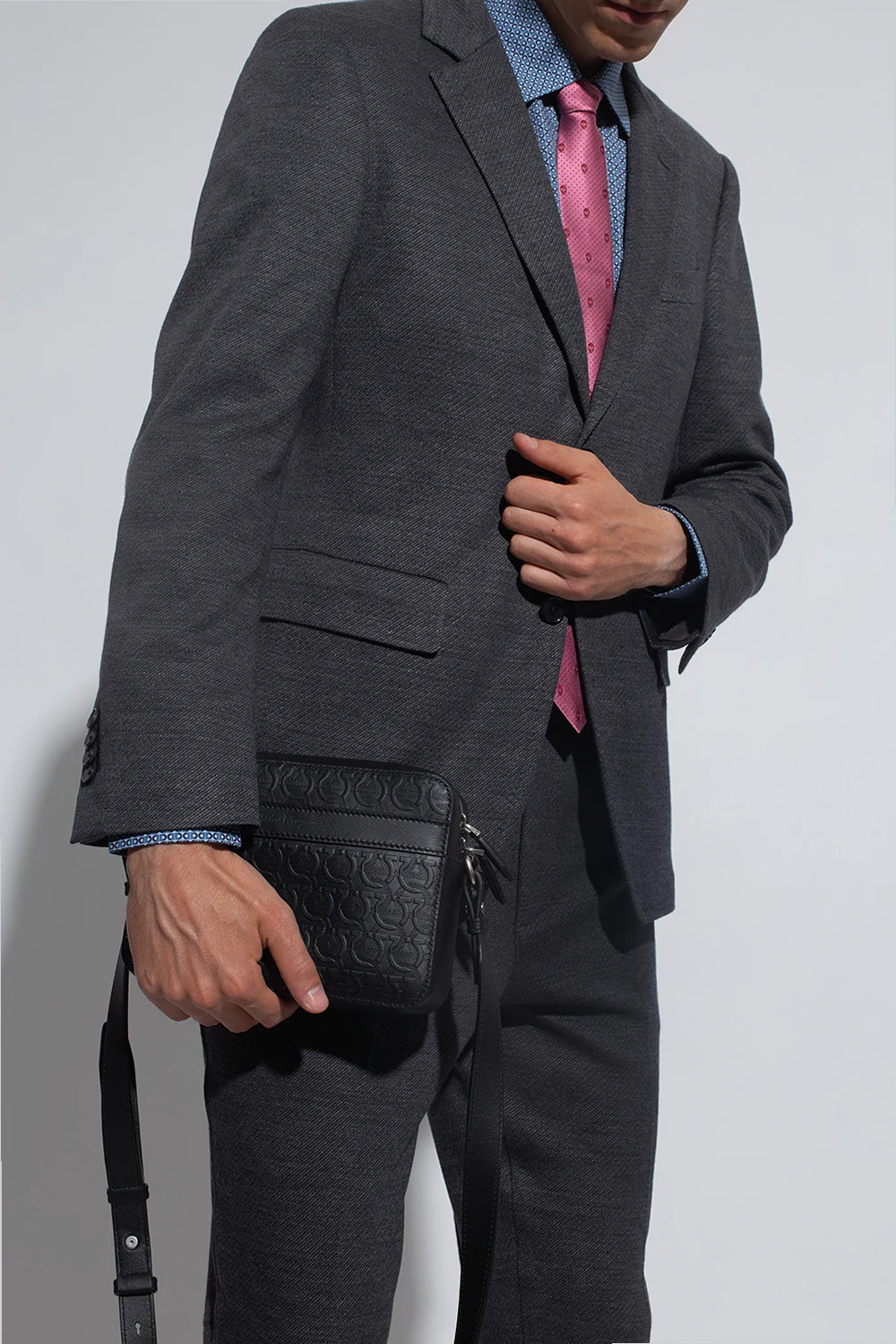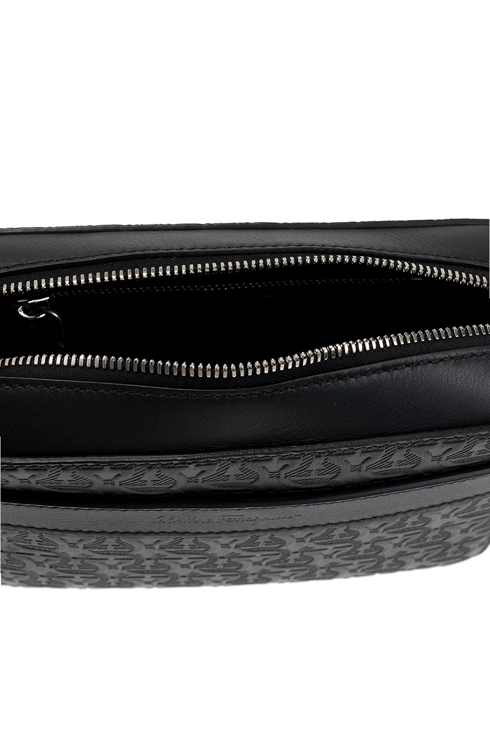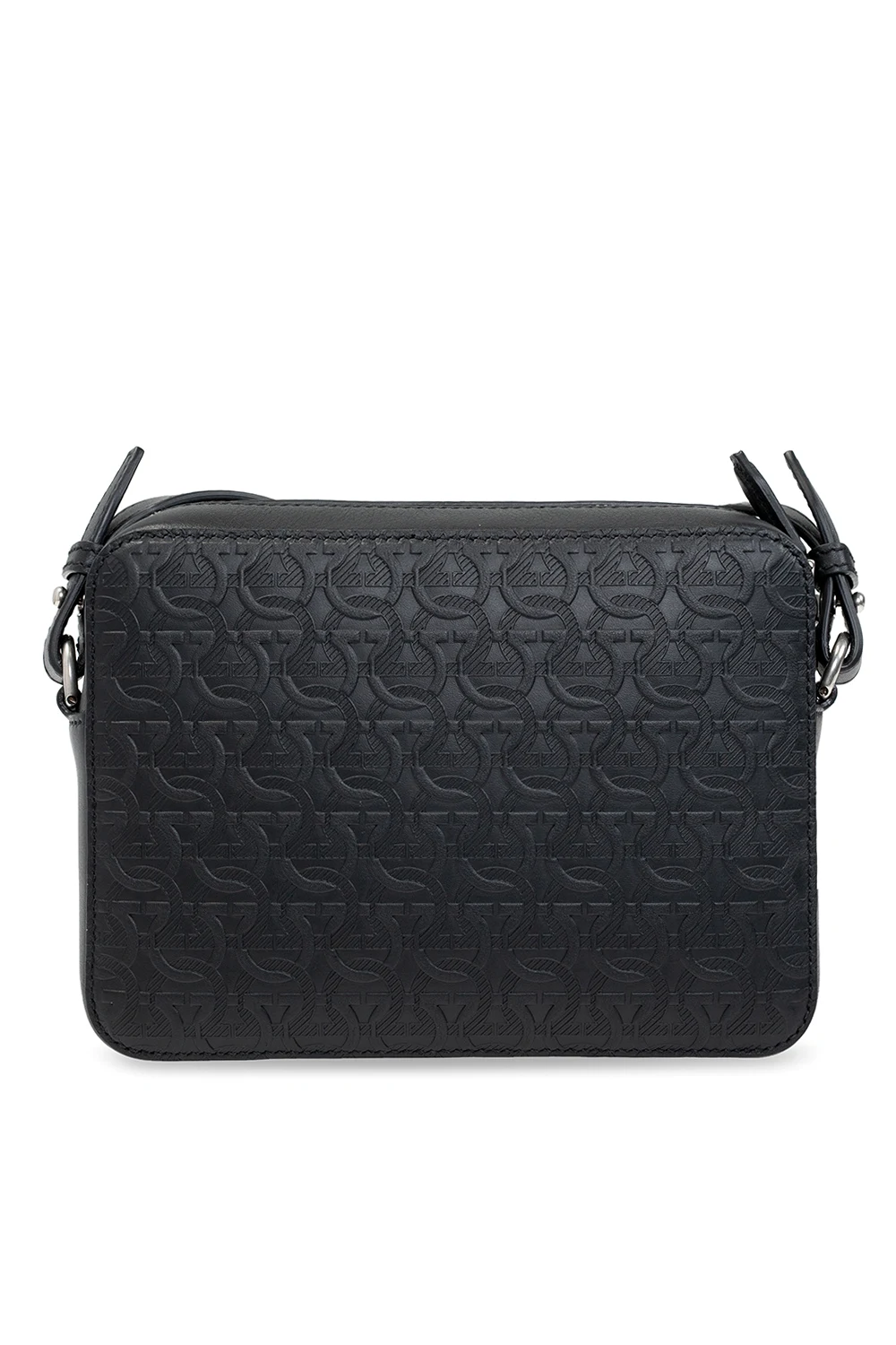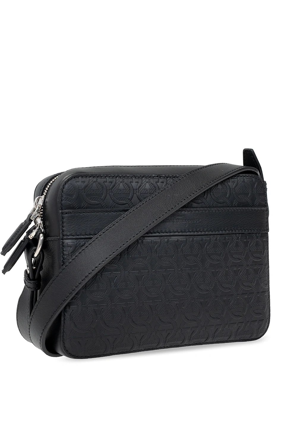 Czarna torba na ramię, model ‘Travel Embos’ FERRAGAMO. Wykonana z cielęcej skóry ozdobionej wytłoczonym logo. Zamykana na dwubiegunowy zamek. Z przodu wsuwana kieszeń. Regulowany pasek. Wewnątrz komora, kieszeń zamykana na zamek i wsuwana kieszeń. Metalowe elementy w kolorze srebrnym.