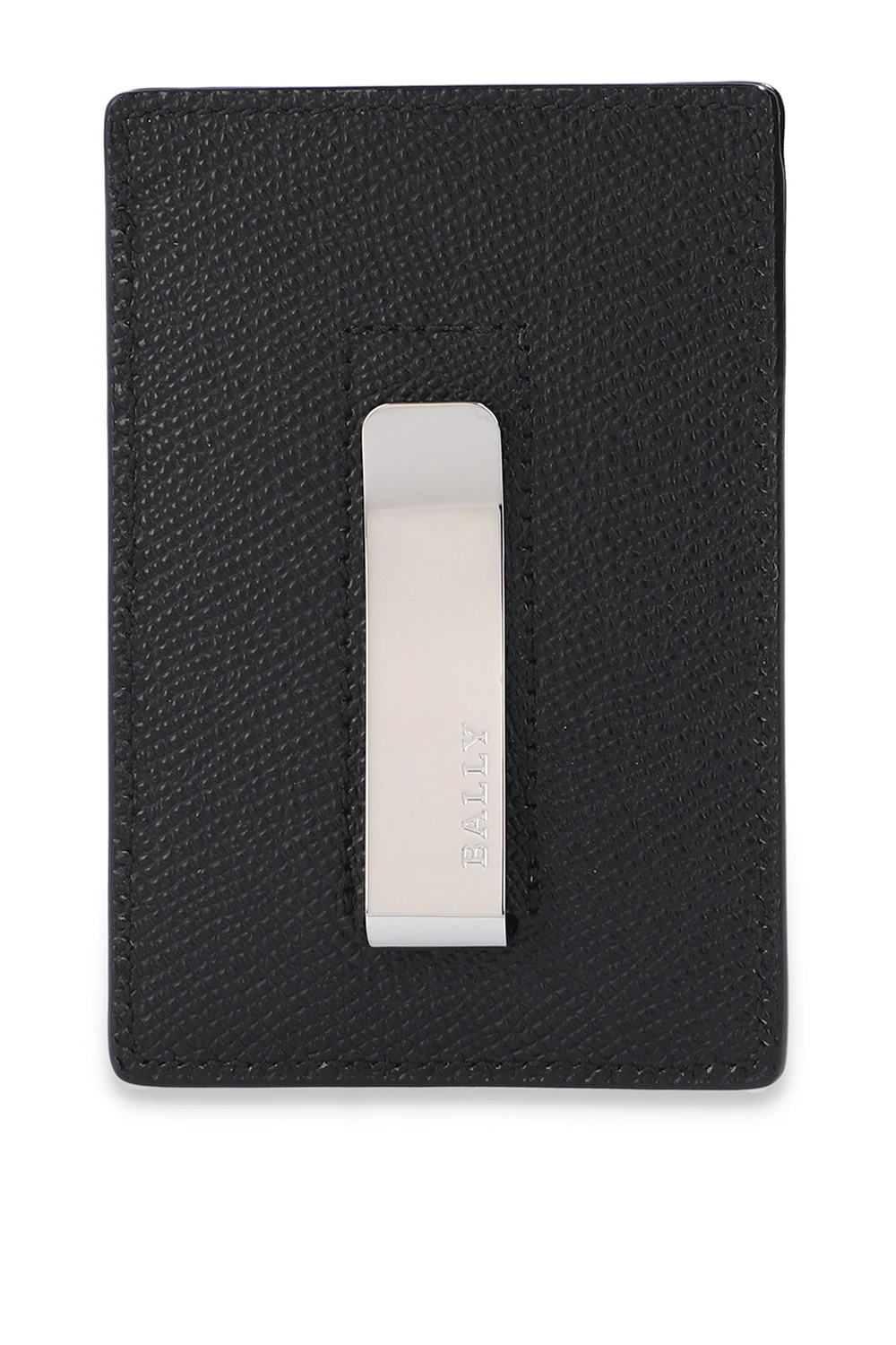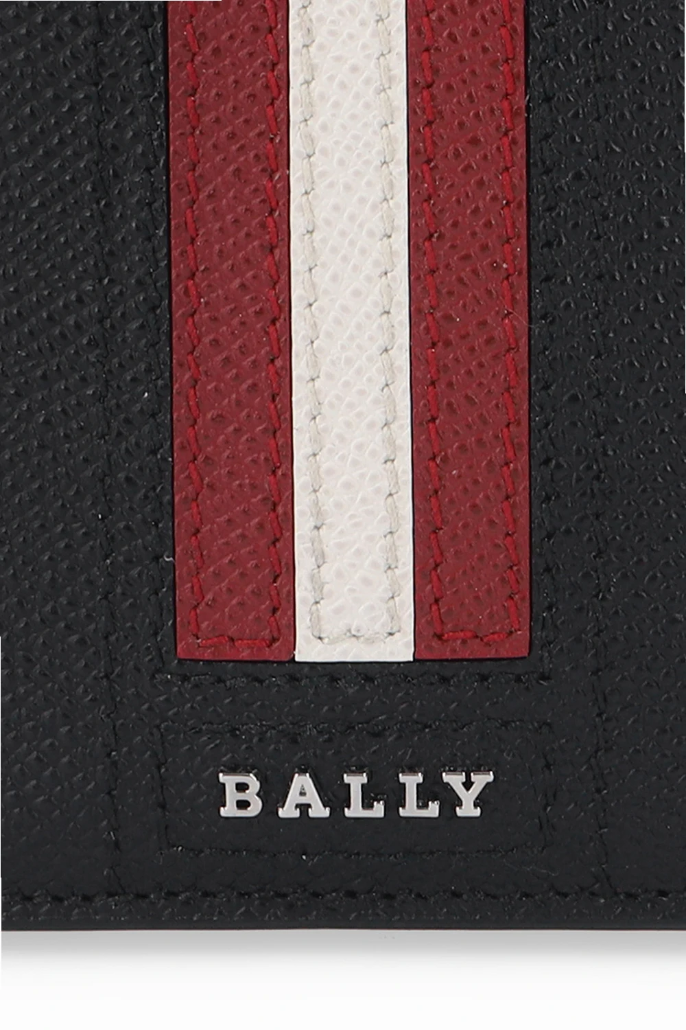 Czarne etui na karty, model ‘Taedy’ Bally. Wykonane ze skóry bydlęcej o ziarnistej fakturze. Ozdobione metalowym logo w kolorze srebrnym oraz charakterystycznym dla marki paskiem w kolorze czerwono-biało-czerwonym. Trzy miejsca na karty.