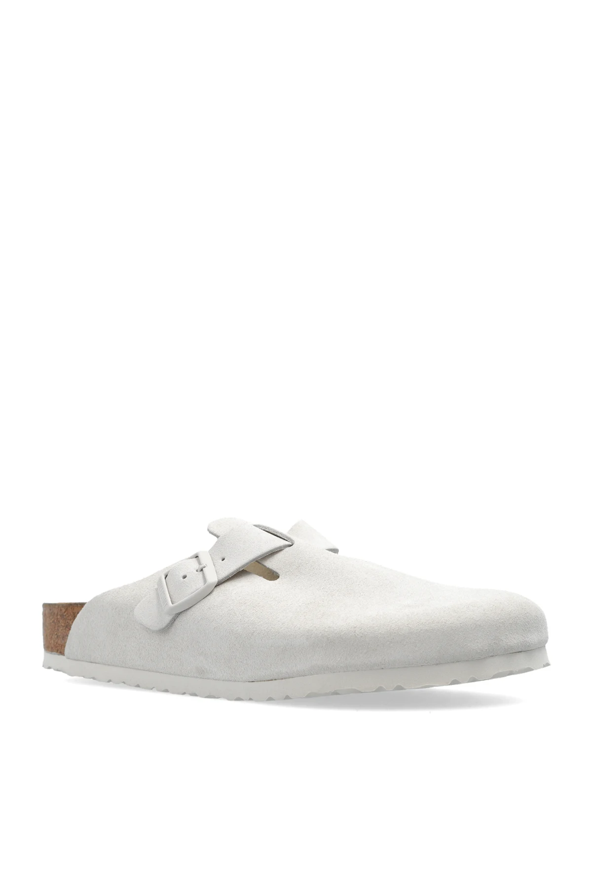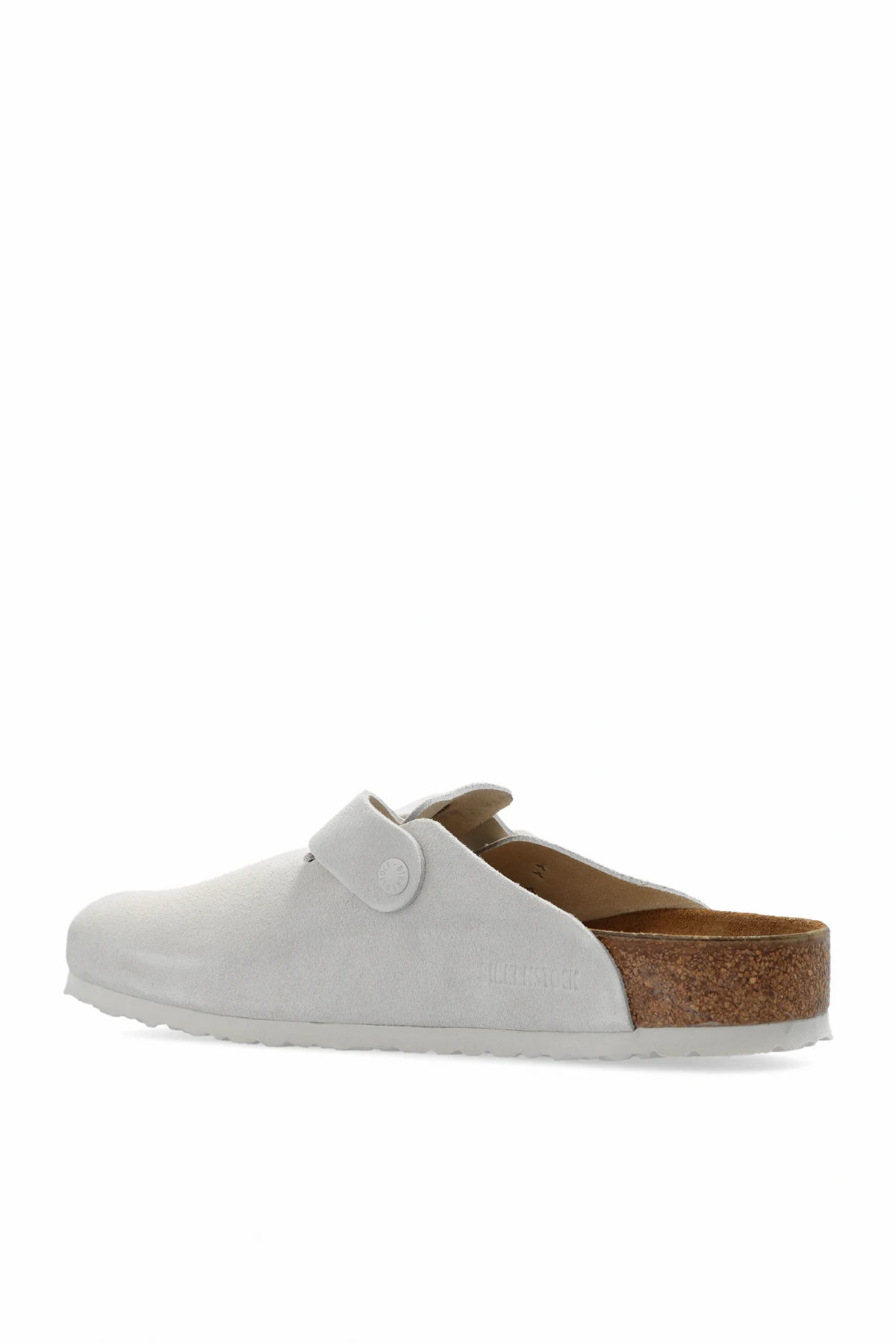 Kremowe klapki, model ‘Boston BS’ Birkenstock. Wykonane z zamszu. Z przodu regulowany pasek z klamrą. Z boku wytłoczone logo. Anatomicznie ukształtowana wkładka korkowo-lateksowa o standardowej szerokości. Kremowa podeszwa wykonana z pianki EVA.
