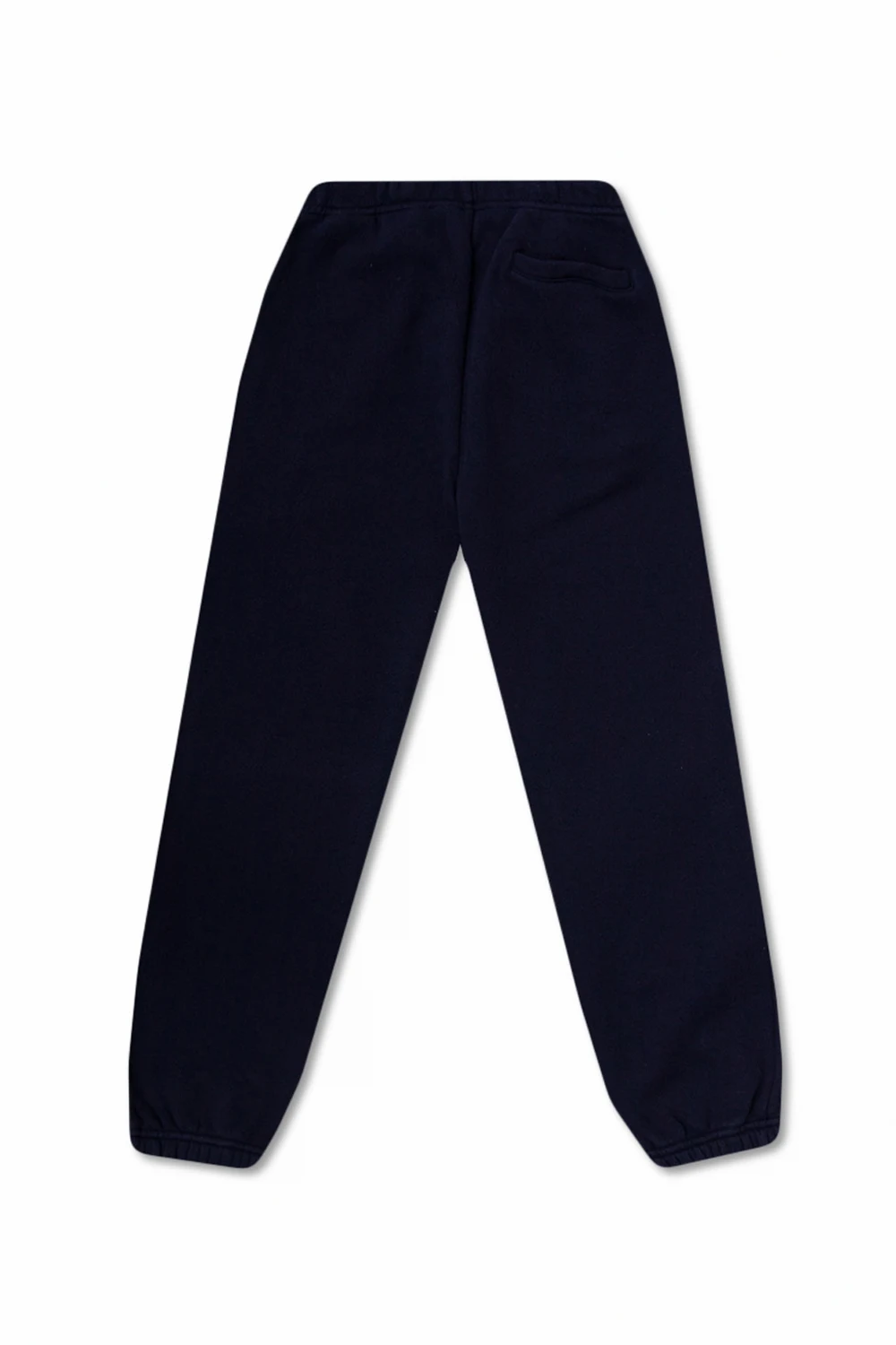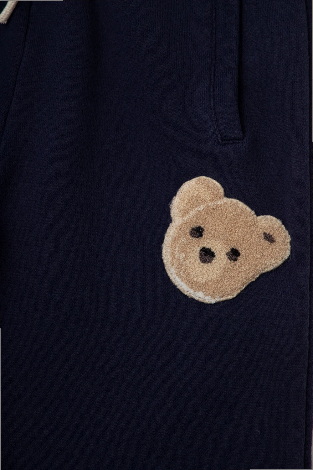 Granatowe spodnie dresowe Palm Angels Kids. Wykonane z bawełny. W pasie wszyta guma ściągana trokami. Z przodu ozdobione beżową naszywką z charakterystycznym dla marki motywem głowy misia. Trzy wsuwane kieszenie: dwie z przodu oraz z tyłu. Długie nogawki zakończone ściągaczem.