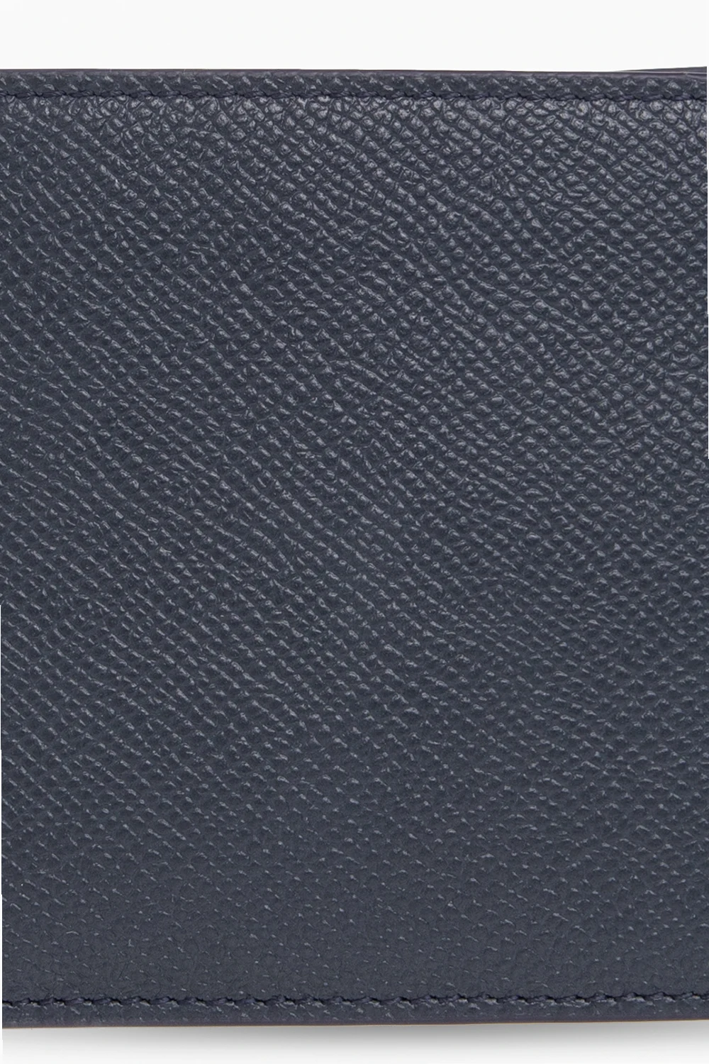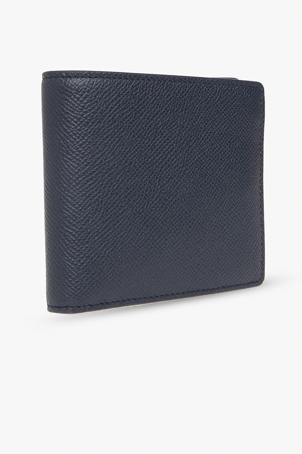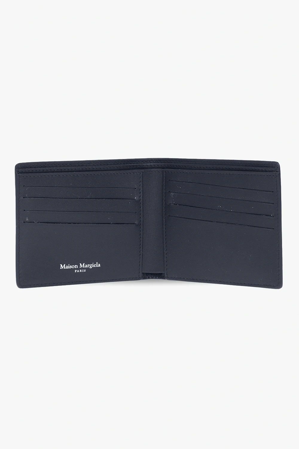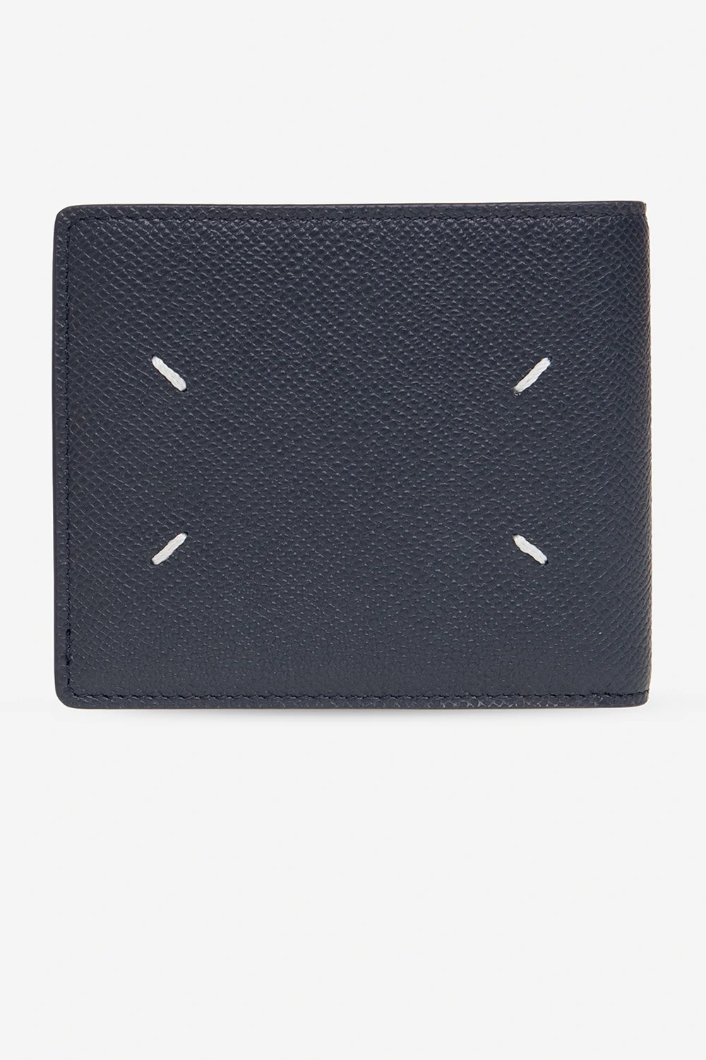 Granatowy, składany portfel MM6 Maison Margiela. Wykonany ze skóry cielęcej. Ozdobiony przeszyciem w kolorze białym. Wewnątrz sześć miejsc na karty oraz miejsce na banknoty.