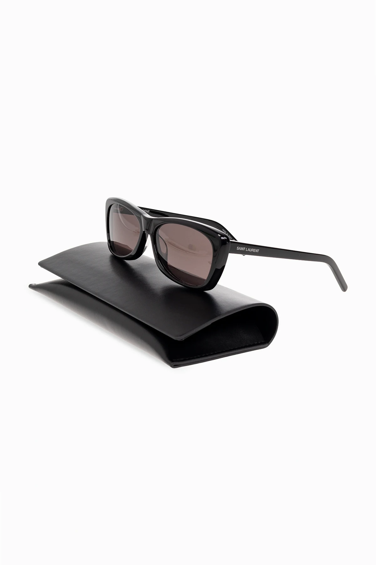Czarne okulary przeciwsłoneczne, model ‘SL 613-001’ Saint Laurent. Prostokątne oprawki. Zauszniki ozdobione wygrawerowanym logo w kolorze białym. Czarne, nylonowe soczewki ze 100% ochroną przed promieniowaniem UV. Dołączone etui.