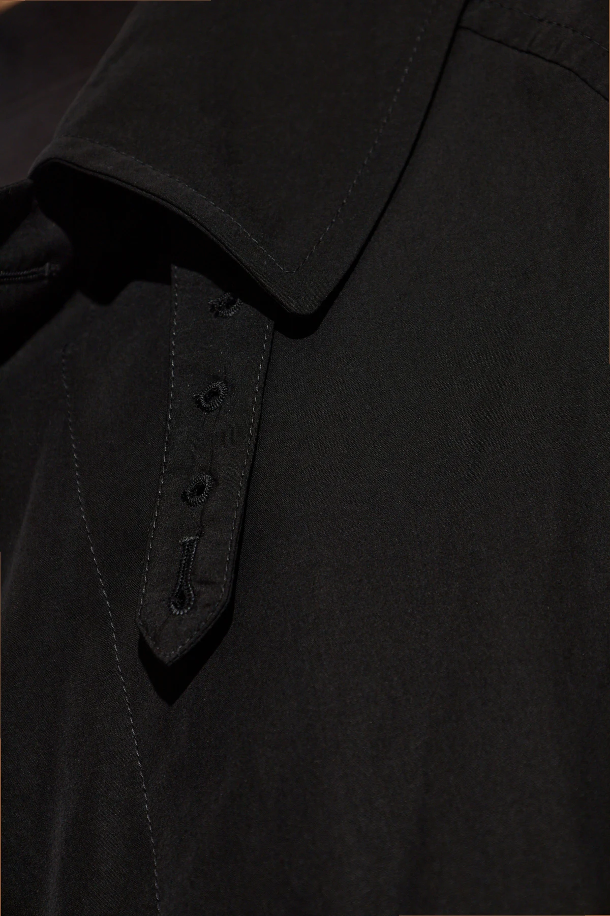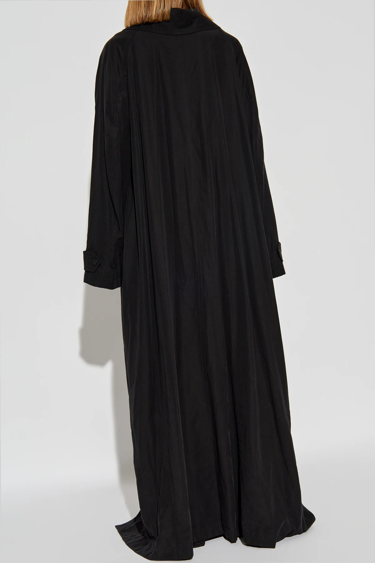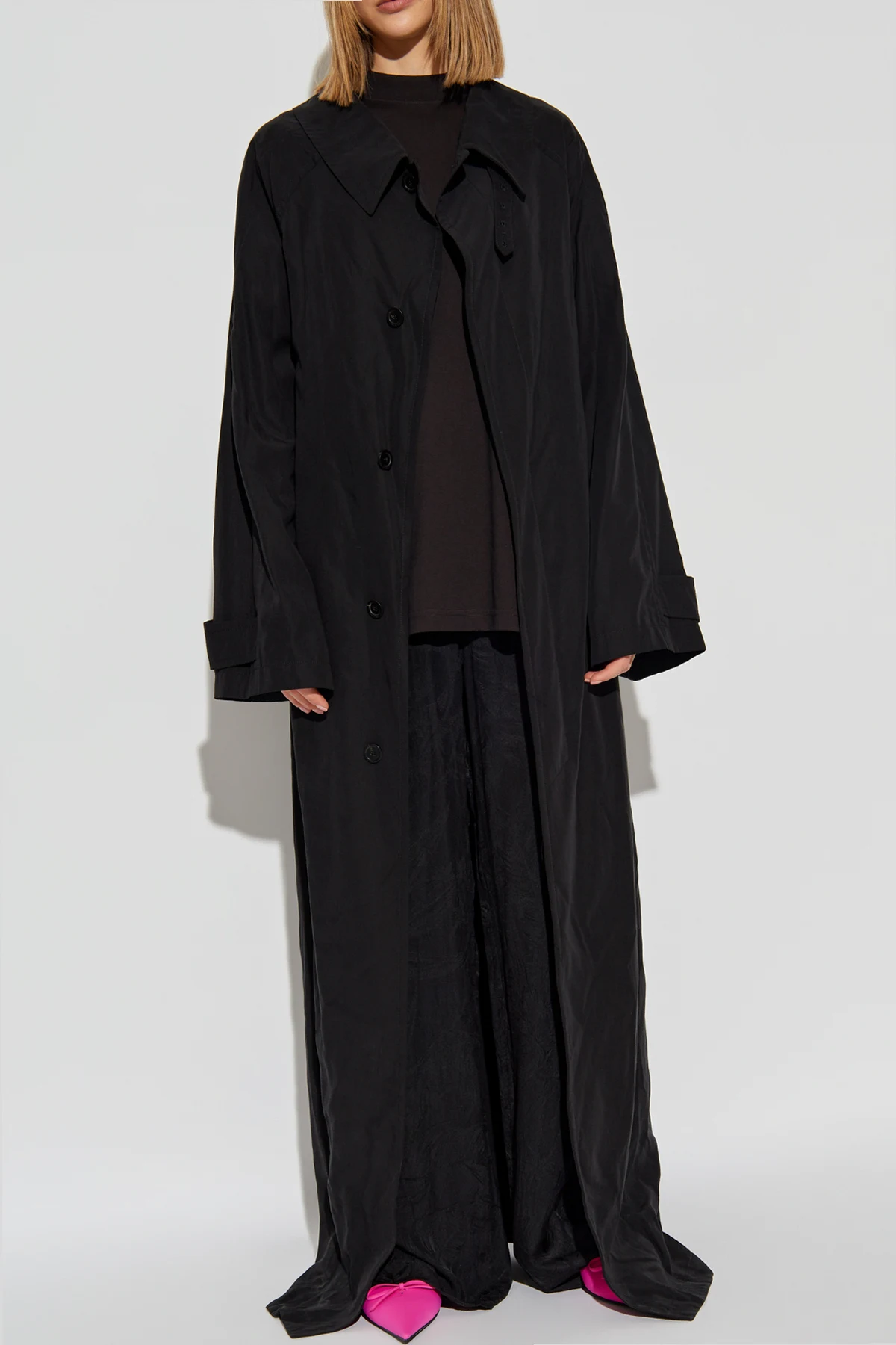 Zachwycający w swojej prostocie, a jednocześnie wyrafinowany długi płaszcz od Balenciaga , jest kwintesencją współczesnej elegancji połączonej z klasycznym wzornictwem. Jego głęboki, nasycony odcień czerni, w połączeniu z matową strukturą wysokiej jakości Lyocellu , tworzy bezkompromisowy wyraz stylu dla wymagających. Nietuzinkowy krój, inspirowany klasycznym trenczem, ożywiony został przez krótkie rękawy - odważny detal, który nadaje płaszczowi nowoczesny charakter.