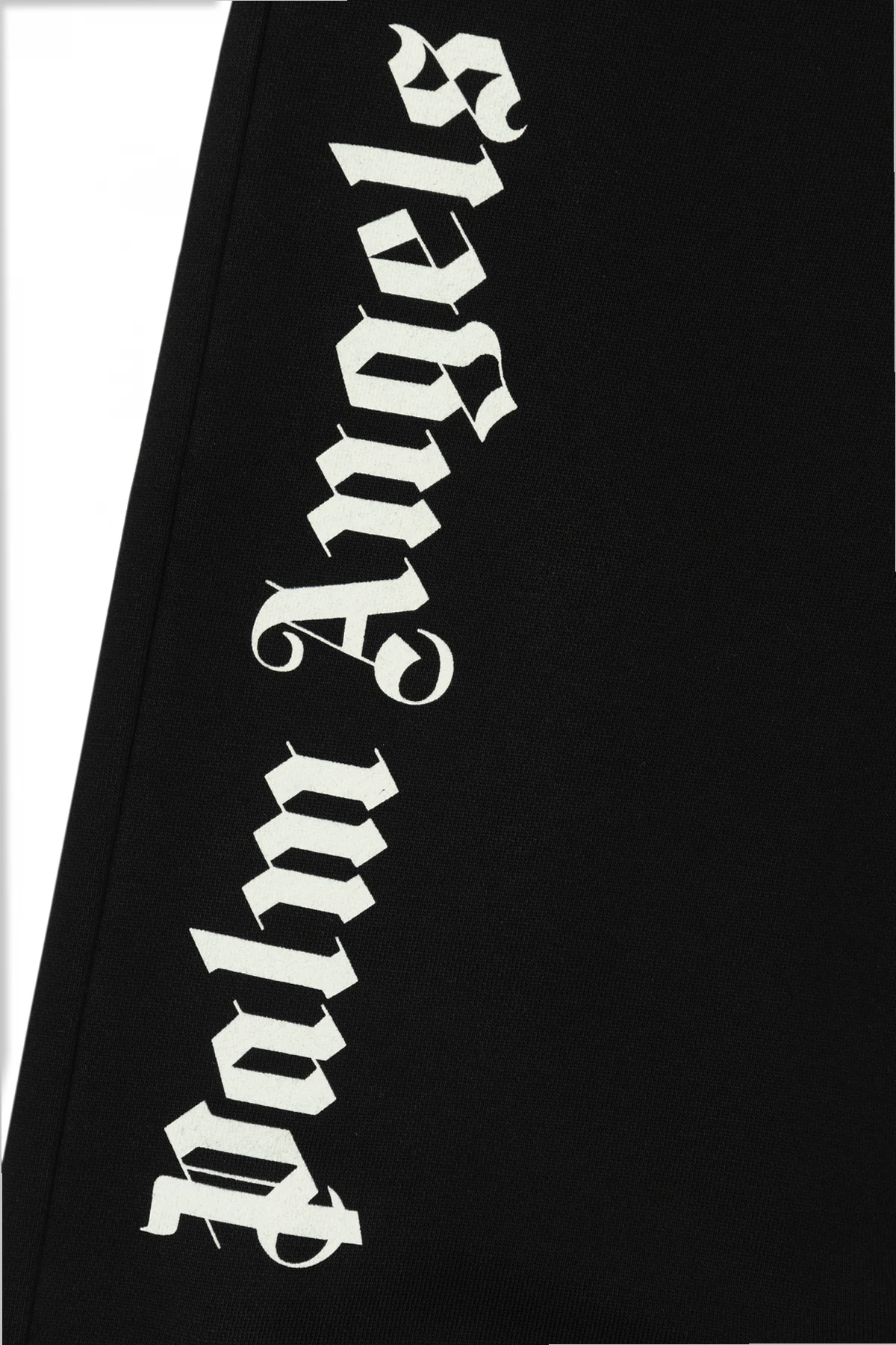 Spodnie cechuje luźny krój z elastycznym ściągaczem w pasie oraz nogawkach, co zapewnia niebywałą wygodę i swobodę ruchu. Na lewej nogawce znajduje się duży, biały nadruk "Palm Angels" w gotyckim stylu, który dodaje niepowtarzalnego charakteru.