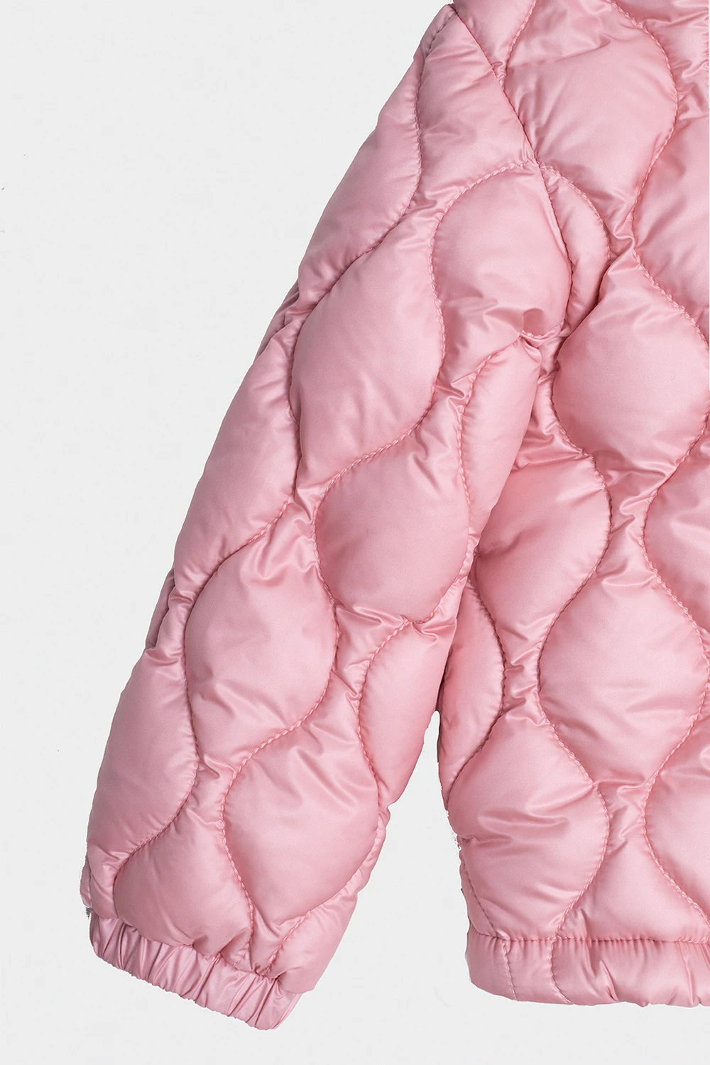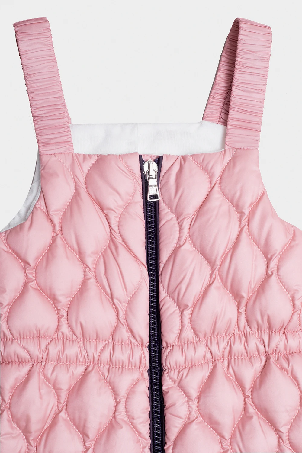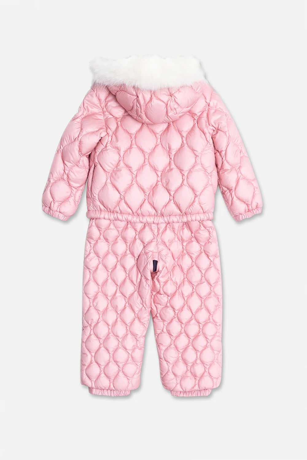 Różowy, dekoracyjnie pikowany zestaw: kurtka i kombinezon narciarski, model ‘Delbe’ Moncler Enfant. Ocieplany gęsim pierzem i puchem. Kurtka z kapturem zapinana na zamek. Na ramieniu ozdobiona naszywką z logo. Kaptur z odpinanym kołnierzem wykończonym imitacją futra w kolorze białym. Dwie kieszenie zapinane na zatrzaski. Długie rękawy oraz dół wykończone ściągaczem. Kombinezon na ramiączkach zapinany z przodu na zamek. W pasie wszyta guma. Z boku naszywka z logo. Długie nogawki zakończone ściągaczem.
