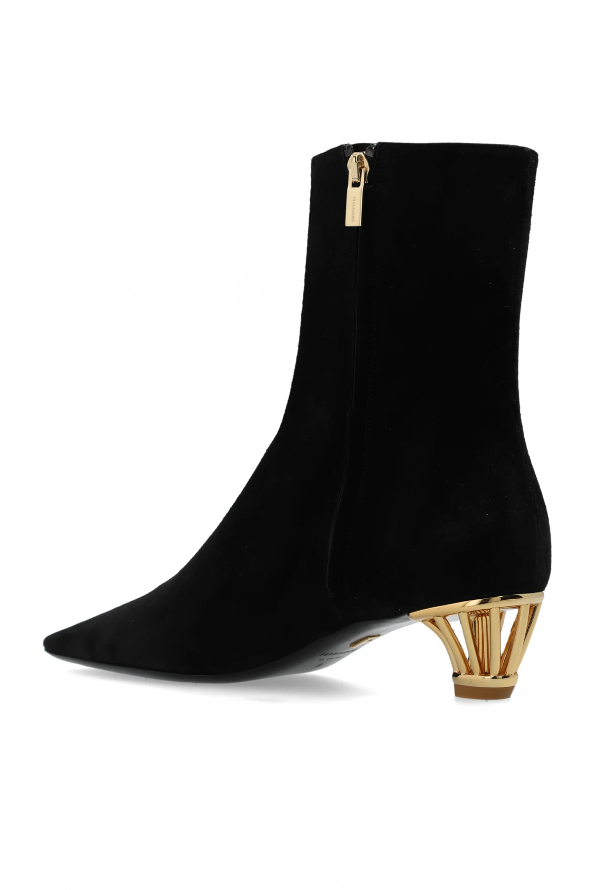 Materiał: Botki wykonane są z najwyższej jakości czarnej skóry cielęcej, która zapewnia trwałość i komfort użytkowania. Wnętrze buta zdobi subtelne logo "FERRAGAMO", podkreślające prestiżowy charakter produktu.