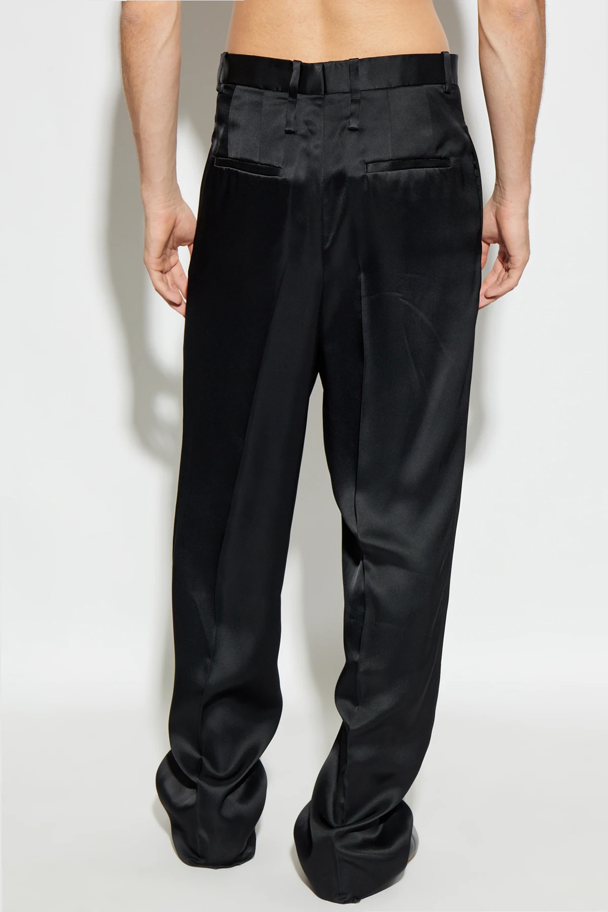 Subtelny satynowy połysk gładkiej tkaniny z wyselekcjonowanej wiskozy ukazuje troskę o detale i szlachetność wykonania. Dyskretne kieszenie boczne harmonijnie współgrają z dwiema klasycznymi, tylnymi kieszeniami zakończonymi listwą. Całość dopełniają szlufki umożliwiające personalizację stylizacji ulubionym paskiem.