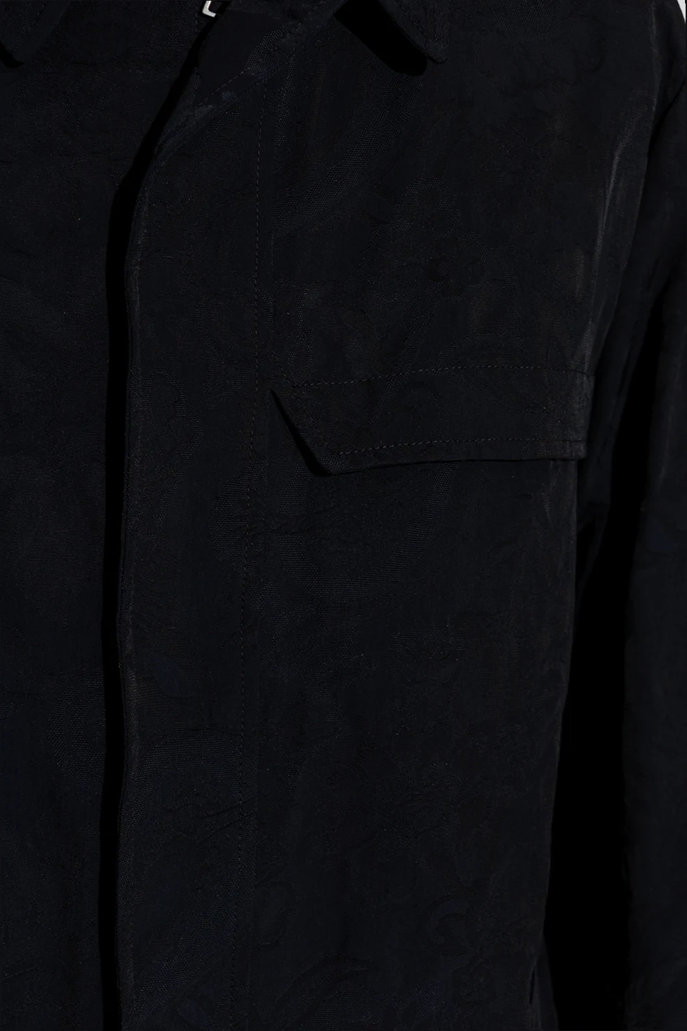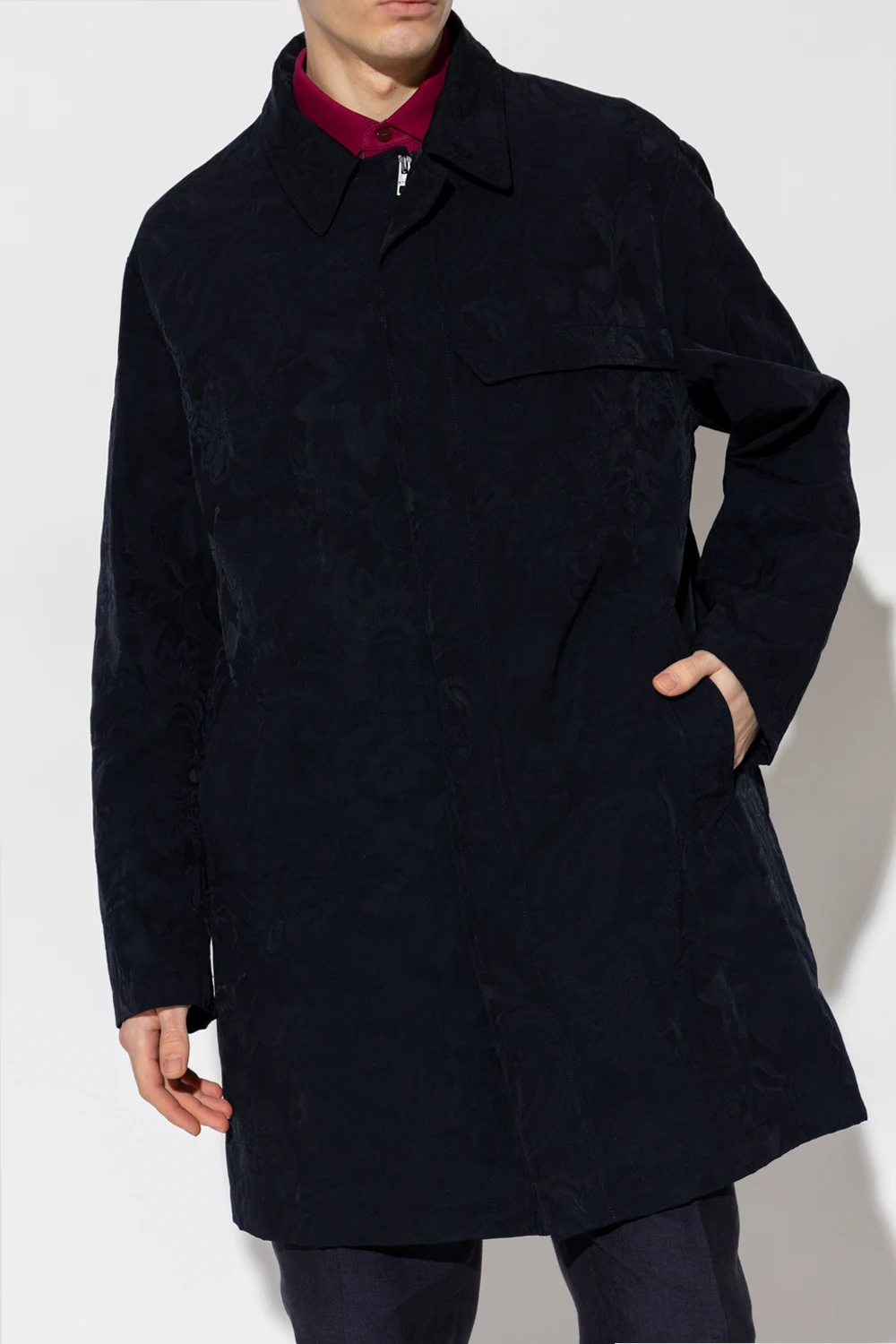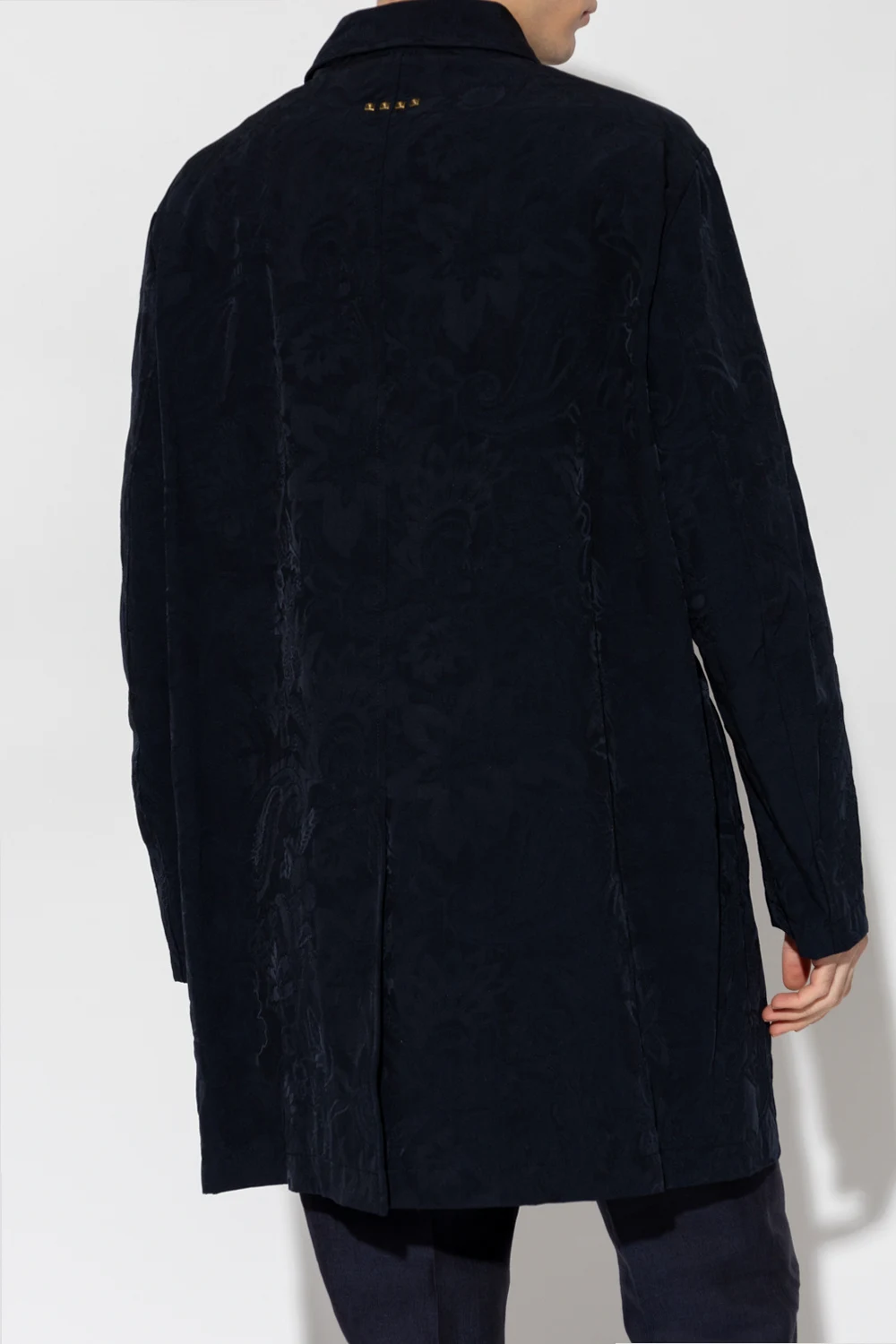 Granatowy płaszcz Etro. Wykonany z materiału ozdobionego żakardowym wzorem z motywem ‘paisley’. Zapinany na dwubiegunowy zamek oraz plisę z zatrzaskami. Trzy kieszenie: dwie wsuwane i jedna z patką. Długie rękawy. Tył z pojedynczym rozcięciem zapinanym na zatrzask.