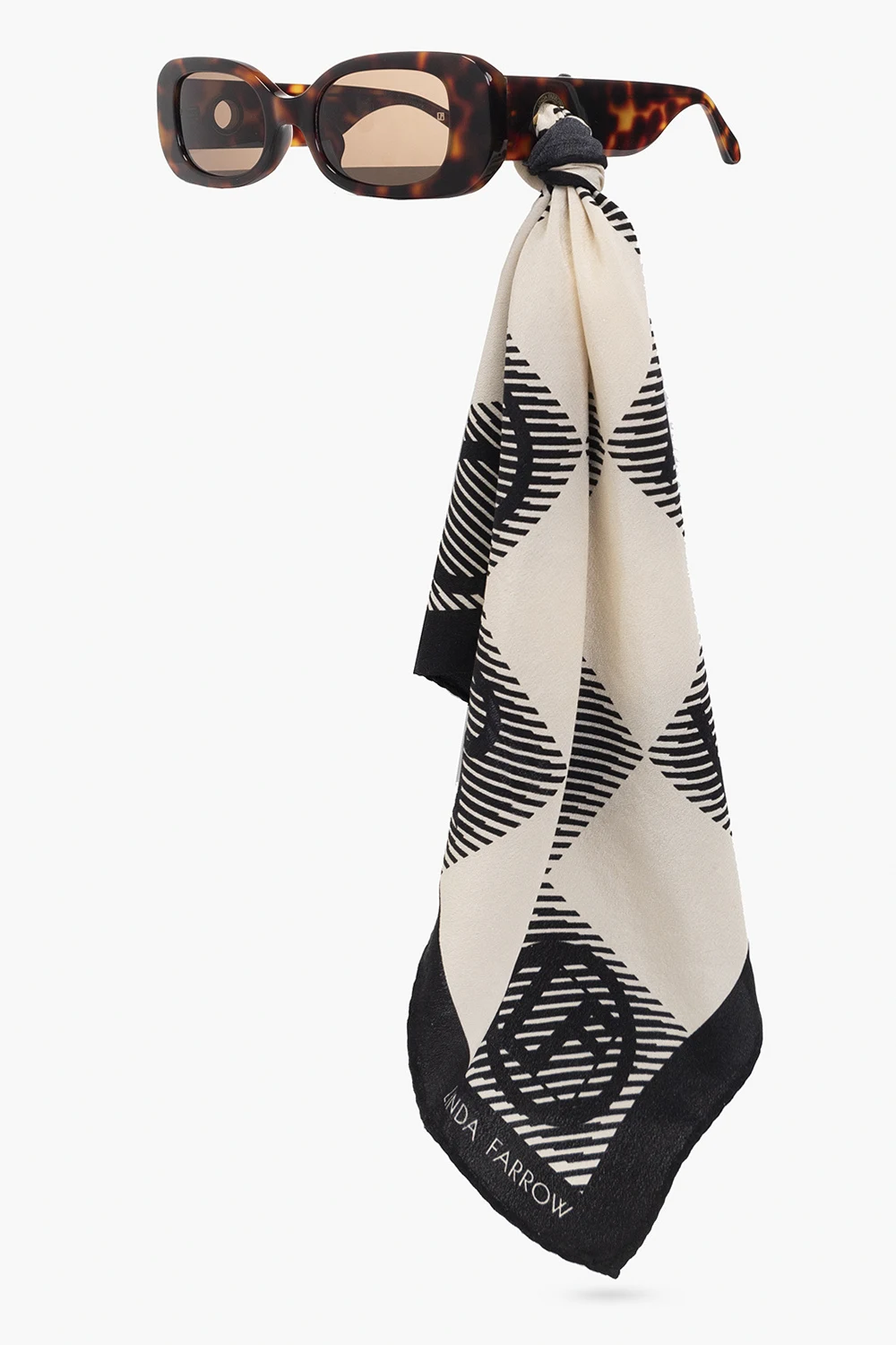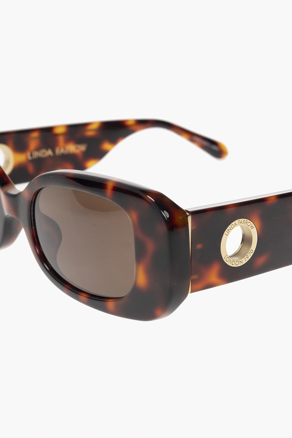 Brązowo-czarne, szylkretowe okulary przeciwsłoneczne, model ‘Lola’ Linda Farrow. Wykonane z ręcznie polerowanego włoskiego acetatu. Prostokątne oprawki. Platerowane 22-karatowym jasnym złotem okucia i zawiasy z monogramem. Brązowe soczewki z technologią ZEISS i 100% ochroną przed promieniowaniem UV. Dołączone etui.