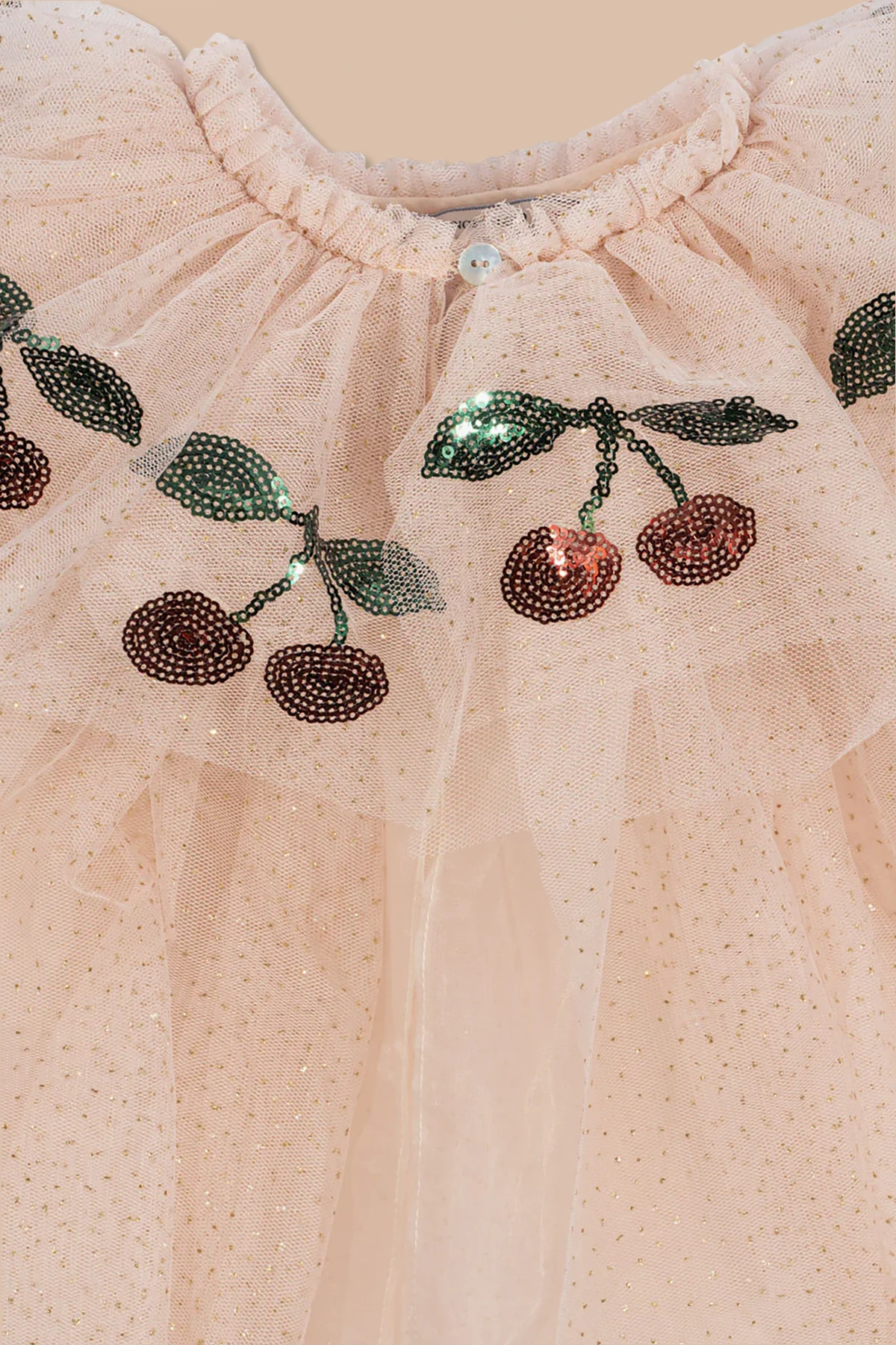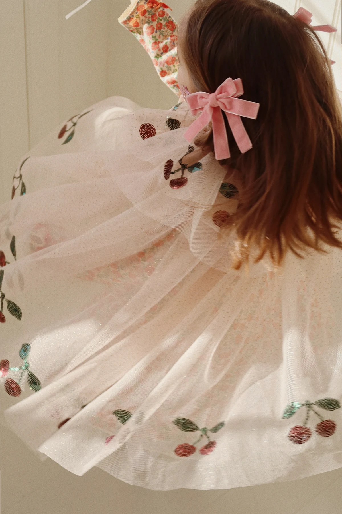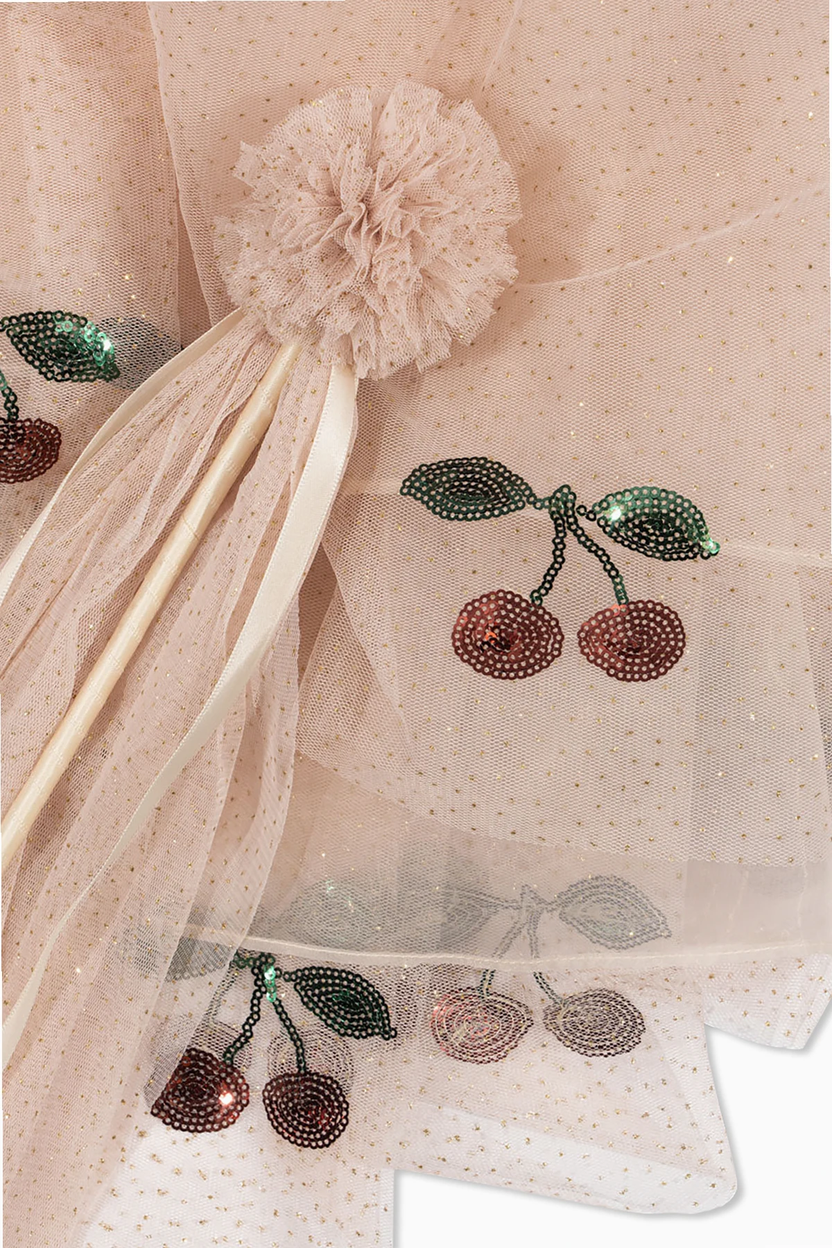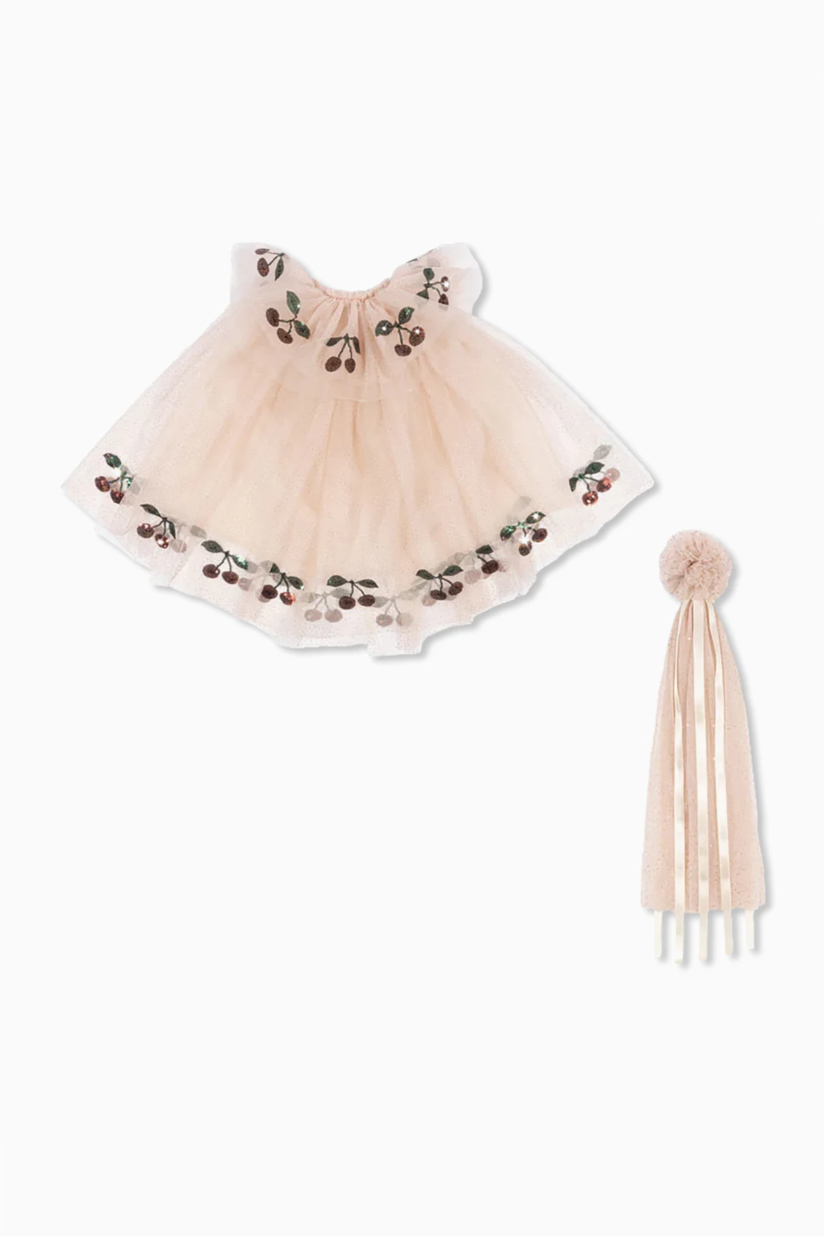 Peleryna wykonana jest z subtelnego tiulu, ozdobionego połyskującymi aplikacjami w kształcie wiśni, które rozświetlają każdą zabawę. Jej falbaniasty krój podkreśla lekkość i zwiewność, nadając kostiumowi wyjątkowego uroku. Dodatkowym akcentem jest różdżka z tiulowym pomponem, dopełniająca całość stylizacji.