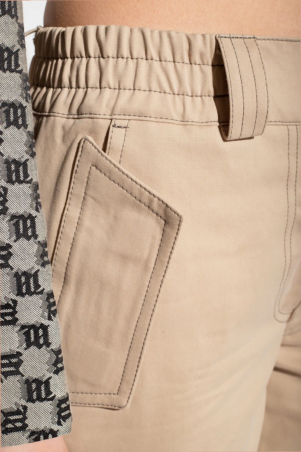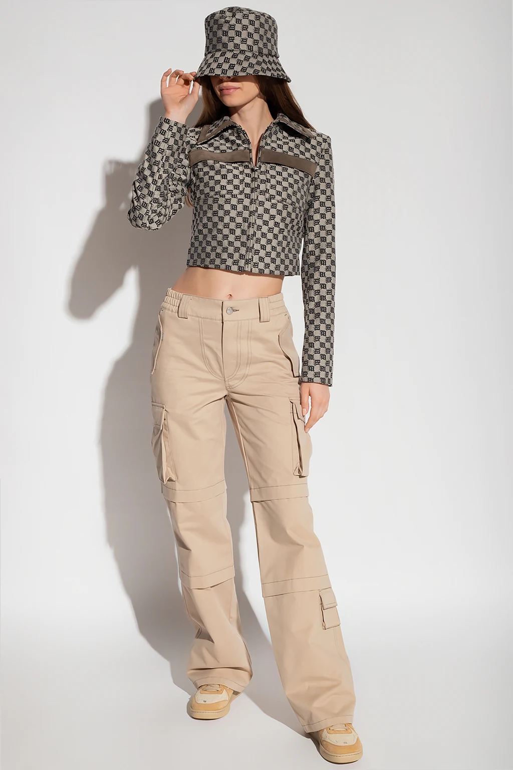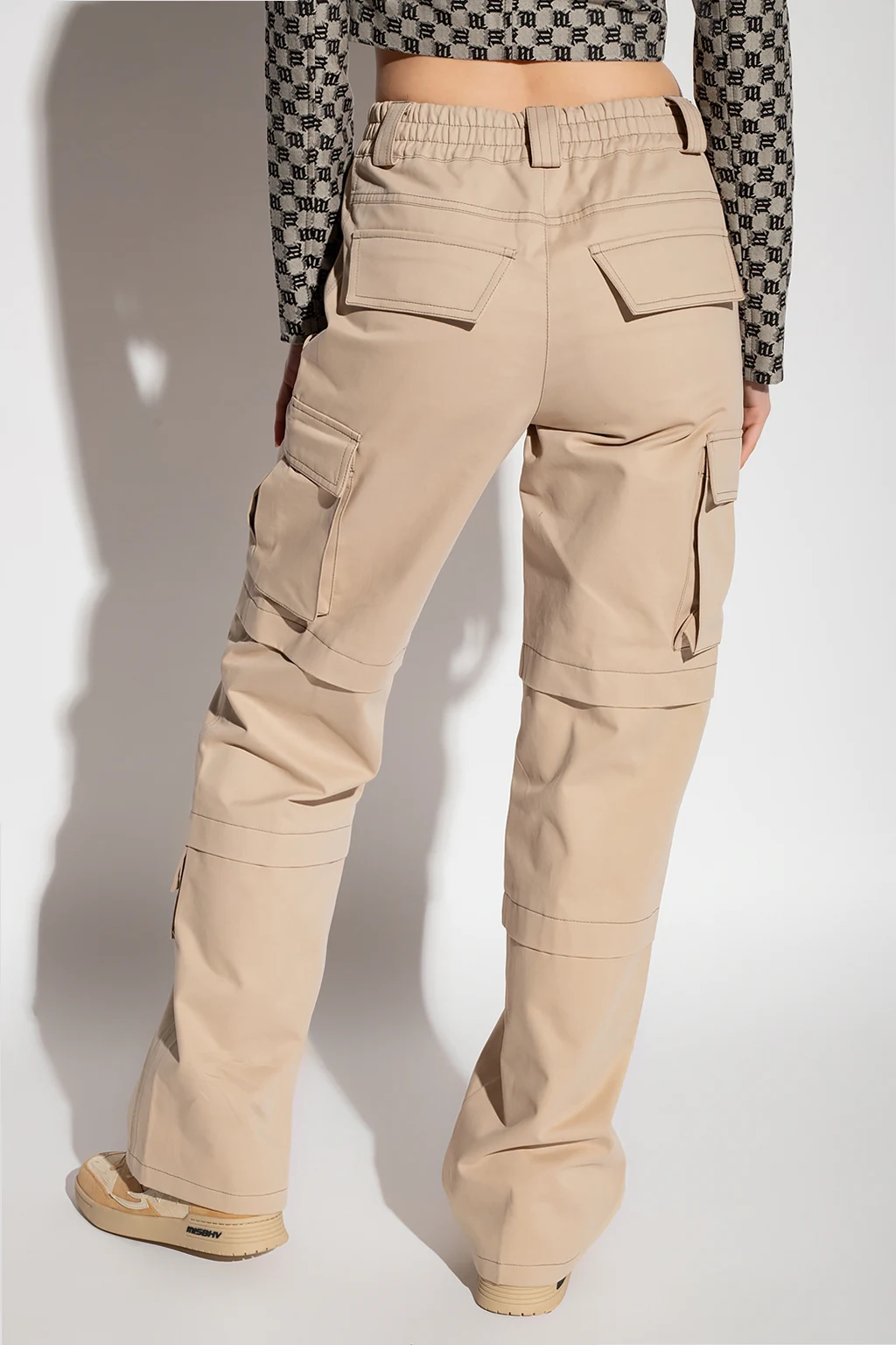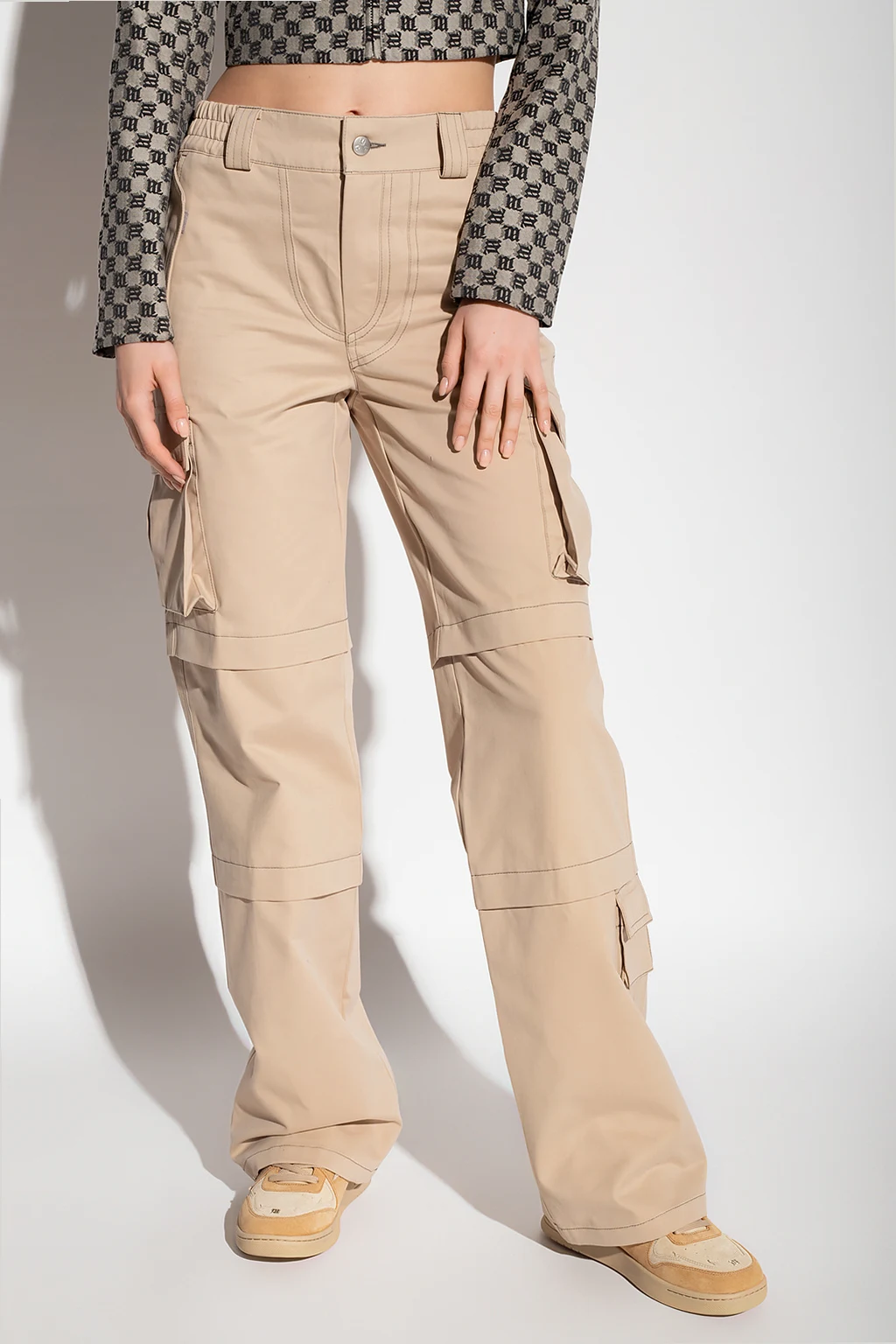 Beżowe spodnie typu ‘cargo’ MISBHV. Wykonane z bawełny. Zapinane na zamek i guzik. W pasie wszyta guma. Sześć kieszeni: dwie z patką i cztery z patką zapinaną na rzep. Szerokie nogawki o prostym kroju ozdobione zakładkami.