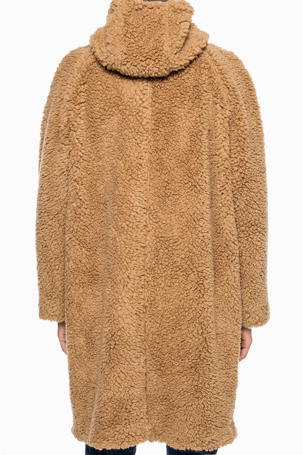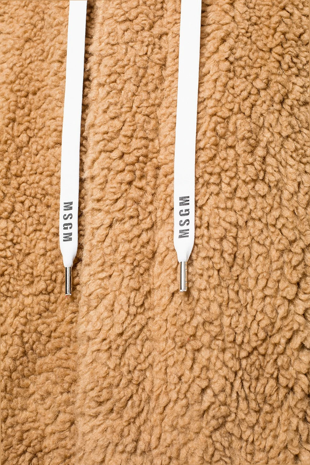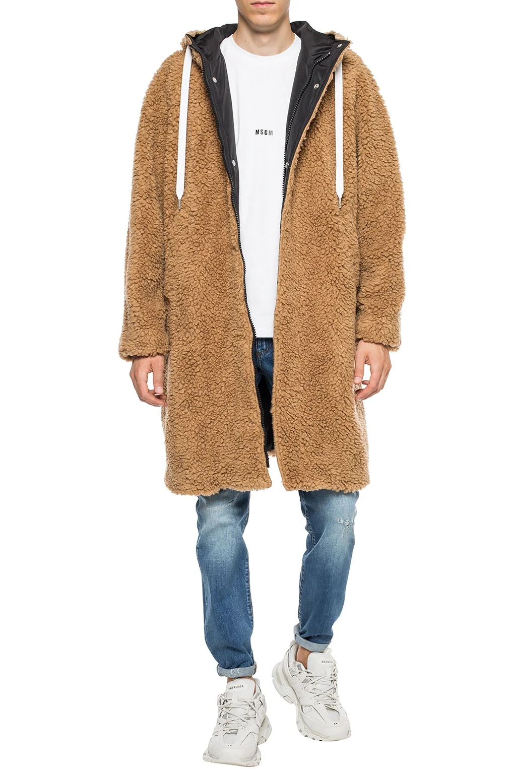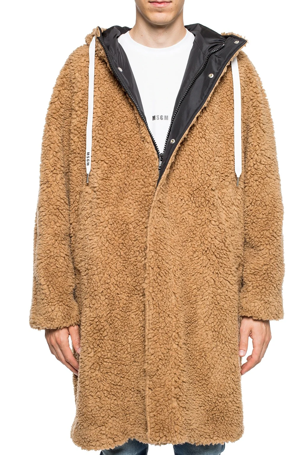 Brązowy płaszcz MSGM. Wykonany z materiału imitującego futro. Zapinany na zamek i zatrzaski. Z przodu dwie wsuwane kieszenie. Kaptur ściągany trokami.