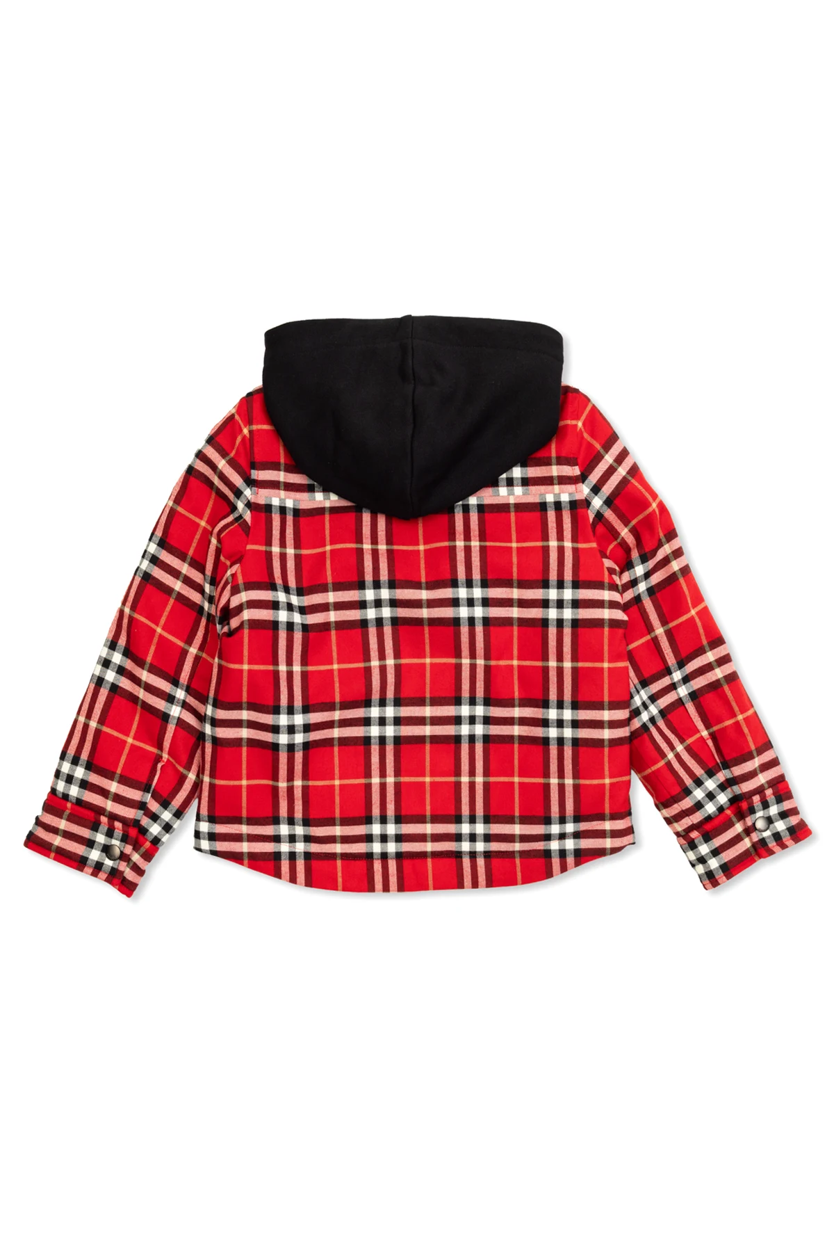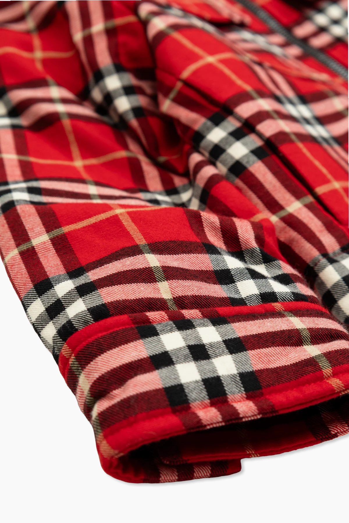 Ocieplana kurtka z kapturem Burberry Kids to wyraz najwyższej klasy rzemiosła oraz szlachetnej elegancji dziecięcej mody. Dominujący czerwony kolor w kultowy wzór tartanowej kraty, zestawionej z subtelnymi akcentami czerni, bieli i beżu, tworzy harmonijną i ponadczasową kompozycję. Klasyczny, swobodny fason gwarantuje wygodę, a starannie przemyślane przeszycia podkreślają dbałość o detale.