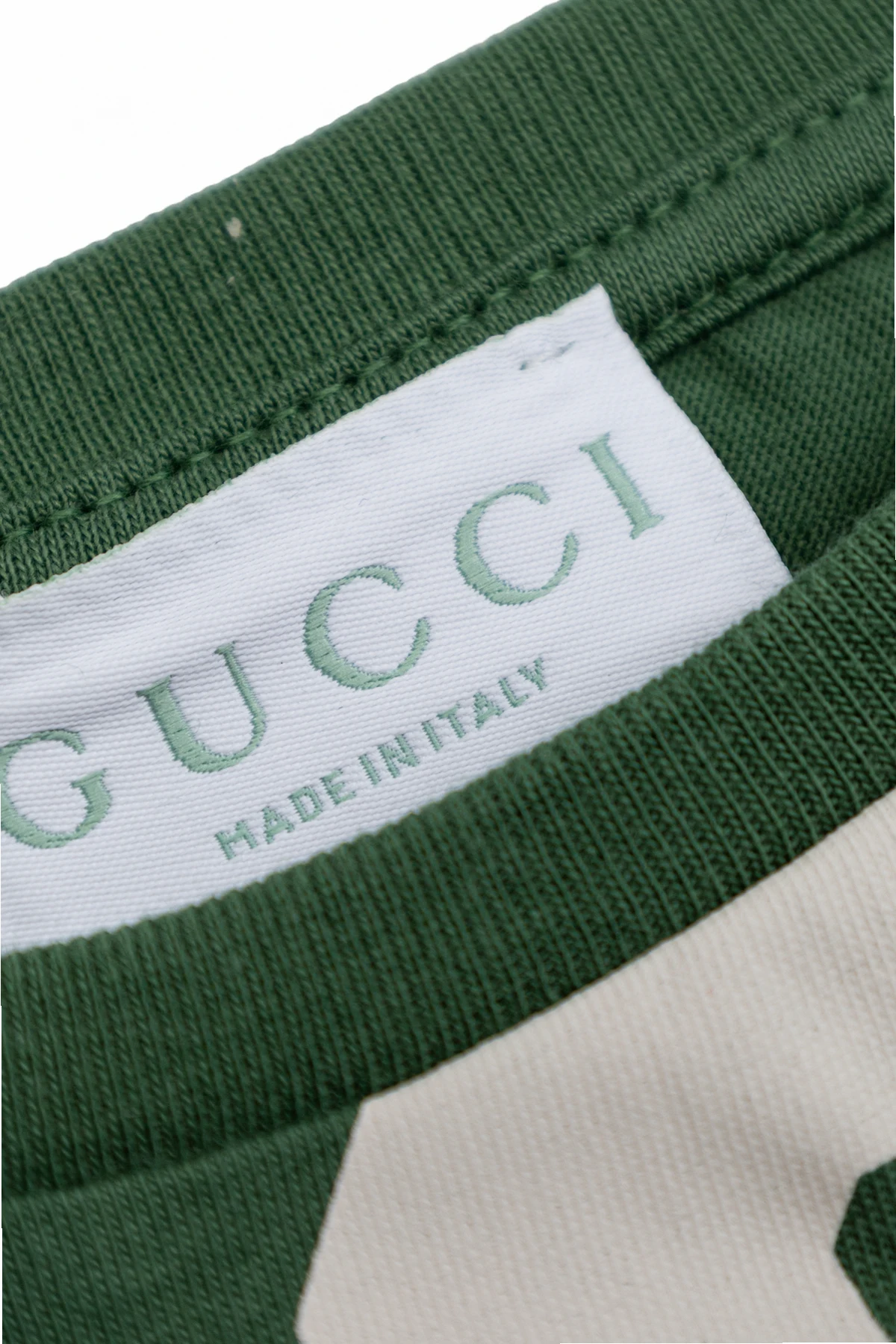 Przód koszulki zdobi wyrazisty nadruk z szeroko rozstawionymi literami GUCCI w kolorze białym, doskonale kontrastującymi z głębią zieleni. Luksusowy charakter dopełnia widoczna metka z napisem „GUCCI” oraz „MADE IN ITALY” przy kołnierzu. Starannie dobrana, ekskluzywna dzianina bawełniana gwarantuje niezrównany komfort noszenia i doskonałe wykończenie każdego detalu.