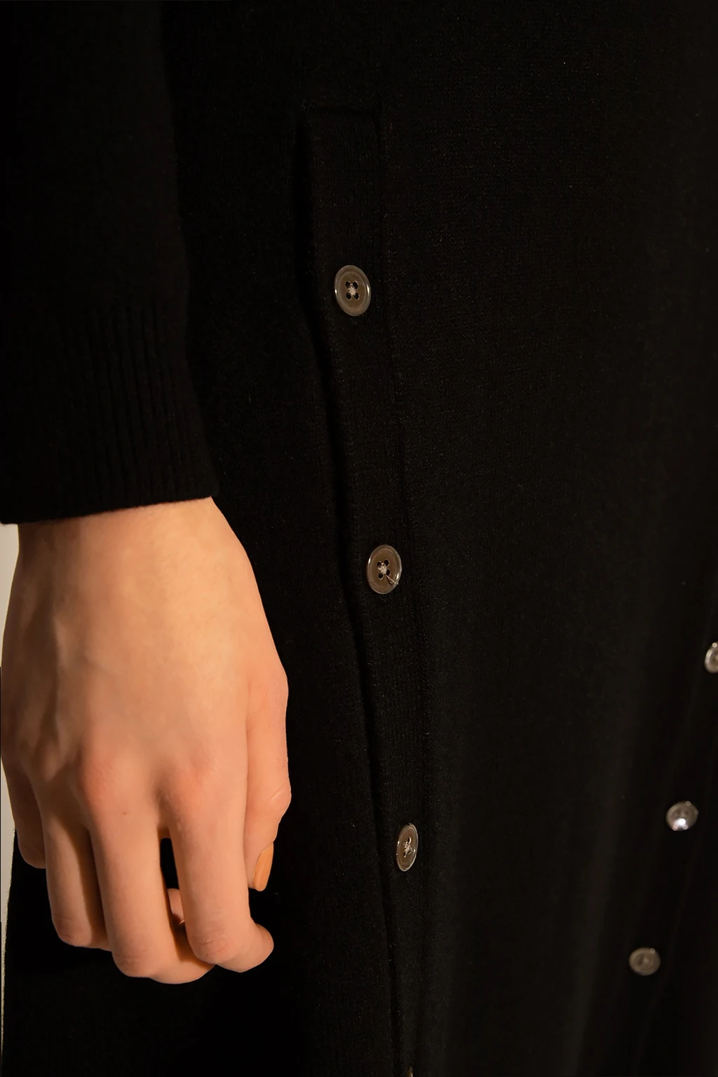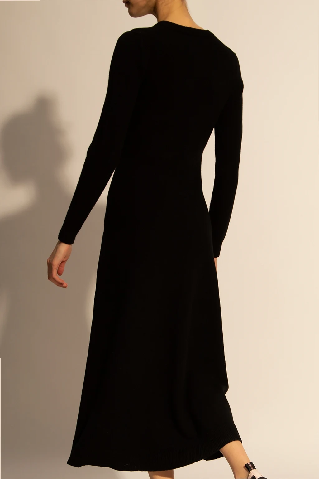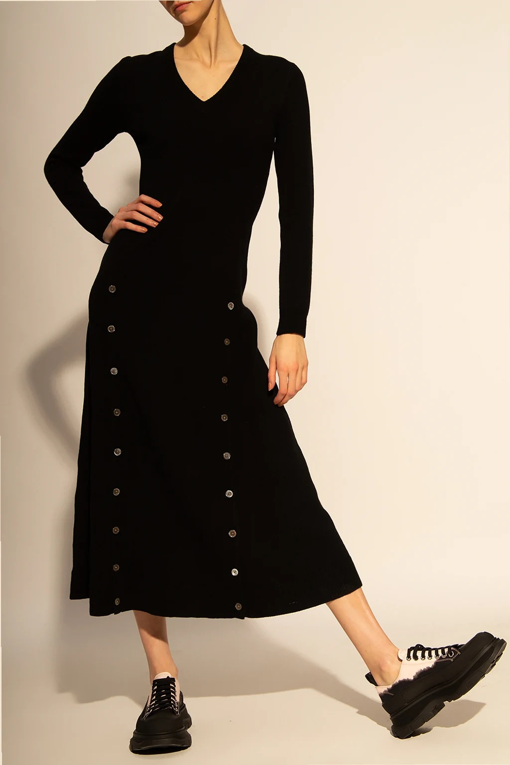 Czarna, kaszmirowa sukienka z dekoltem w serek Michael Kors. Zapinana z przodu na guziki. Długie rękawy.