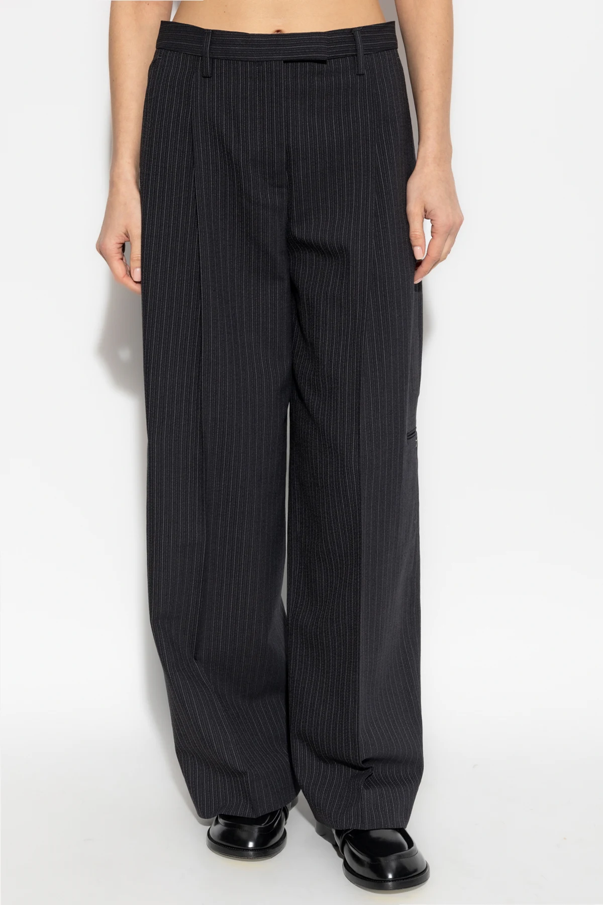 Detale takie jak szlufki w talii oraz cztery wsuwane i dwie zapinane na guzik kieszenie, czynią je praktycznym wyborem. Zapinane na zamek, zaczep i guzik, spodnie doskonale wpisują się w filozofię Acne Studios, łącząc szlachetne tkaniny z przełamywaniem modowych schematów.