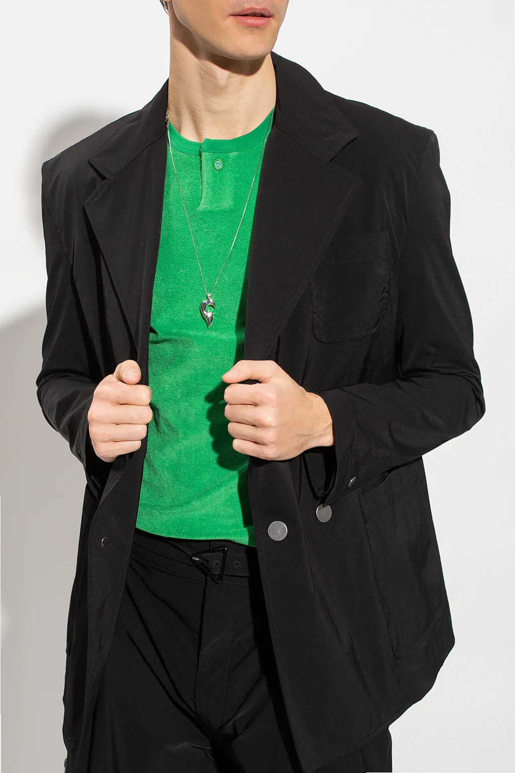 Czarny, krótki, dwurzędowy płaszcz Bottega Veneta. Zapinany na zatrzaski. Otwarte klapy. Trzy wsuwane kieszenie. Długie rękawy zakończone zatrzaskami. Z tyłu rozcięcie.