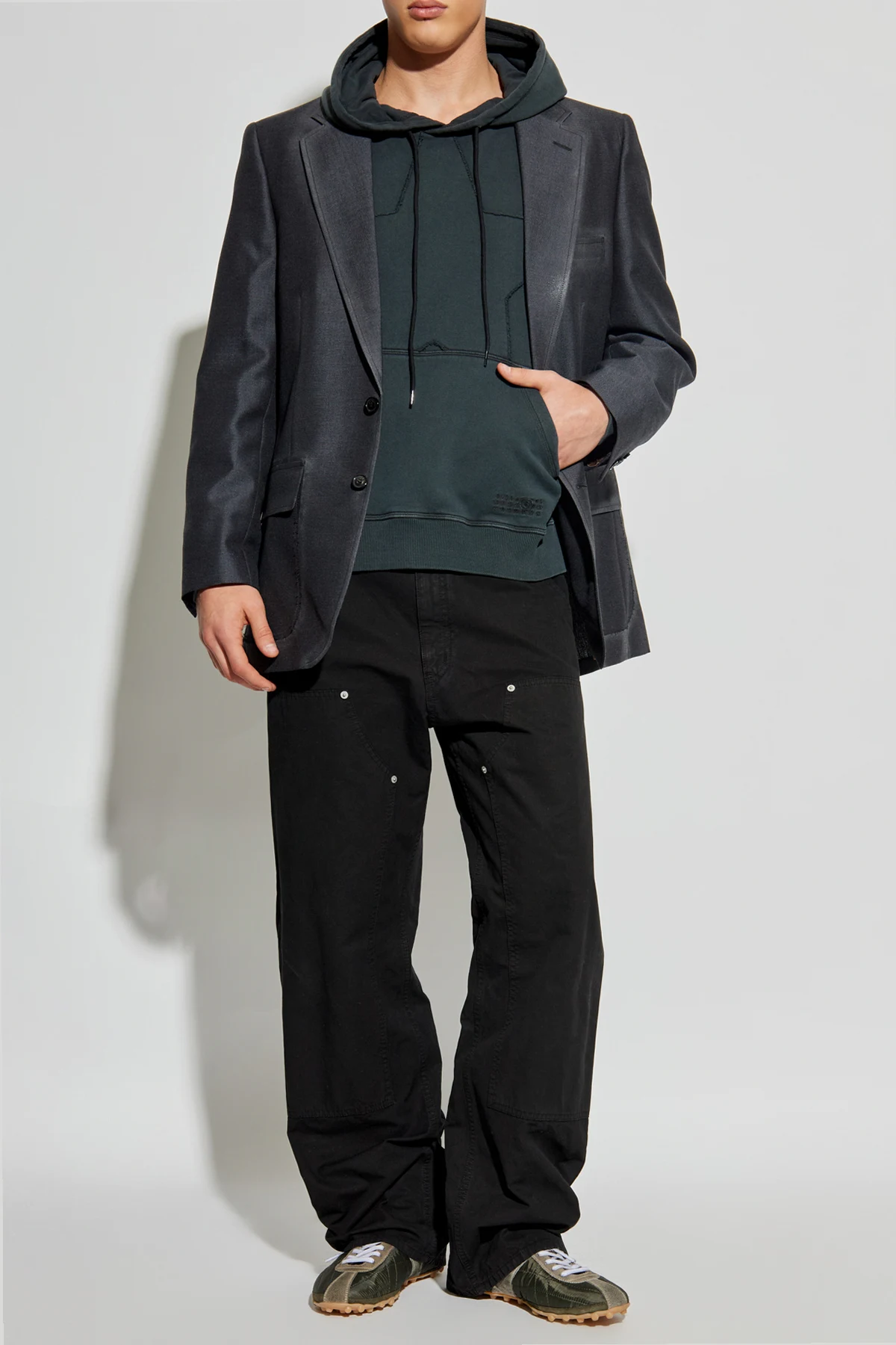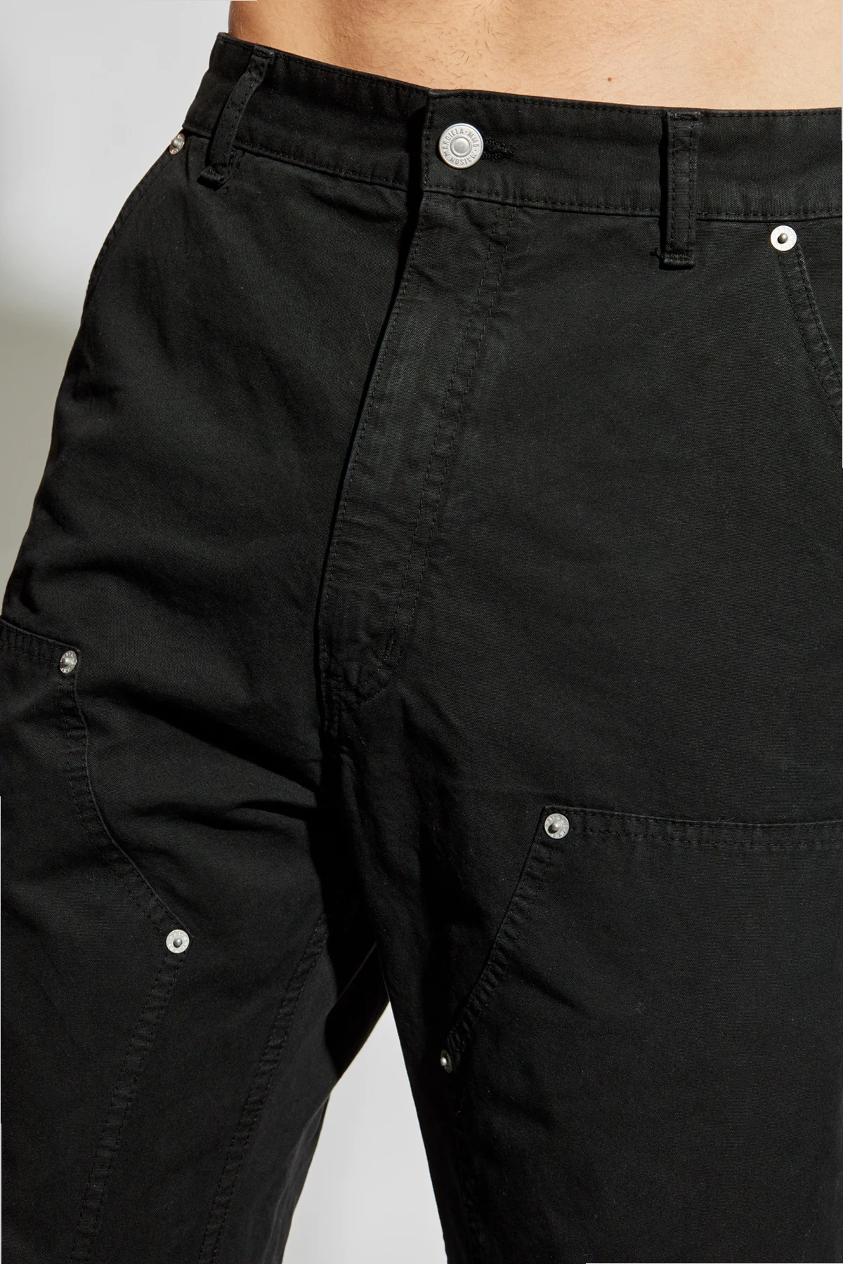 Klasyczny krój prostych nogawek harmonijnie łączy się z wyrazistymi detalami – srebrzyste nity przy ukośnych, przednich kieszeniach oraz charakterystyczny guzik z tłoczonym logo projektanta przy zapięciu. Efektowne przeszycia i dodatkowe panele na udach i kolanach podkreślają awangardowy charakter modelu, będący nawiązaniem do wyjątkowej estetyki Maison Margiela.