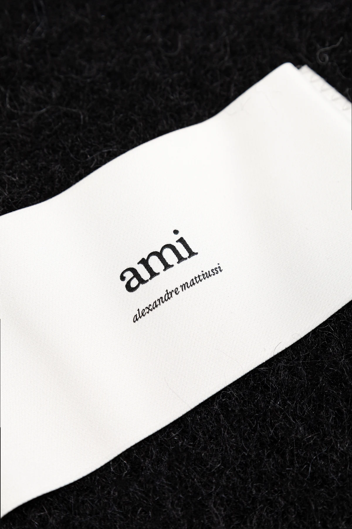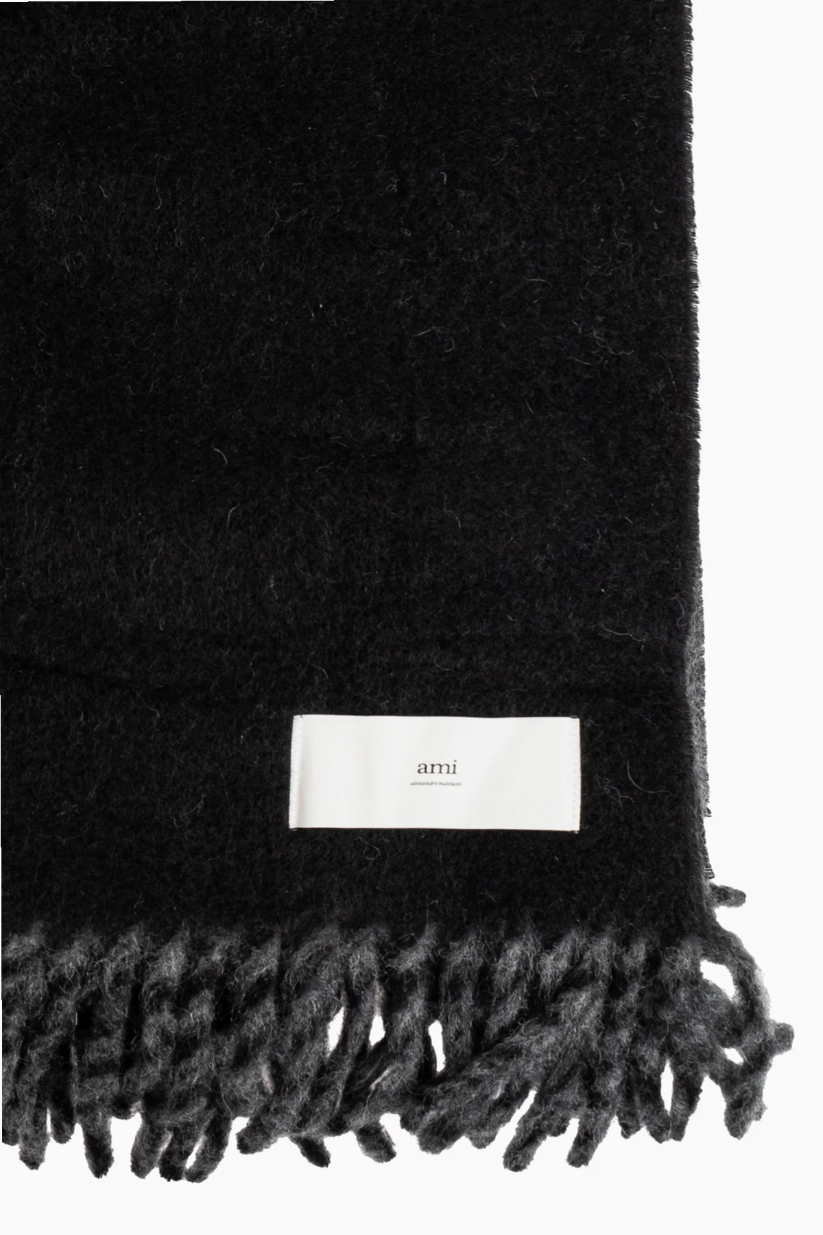 Dodatkowym atutem są stylowe frędzle umieszczone na jednym z krótszych boków, które nadają całości wyrafinowanego wyglądu. Prosty, ale wyraźny detal w postaci prostokątnej naszywki z białym logo "ami alexandre mattiussi" w czarnym kolorze, umieszczonej w jednym z rogów, podkreśla ekskluzywne pochodzenie produktu.