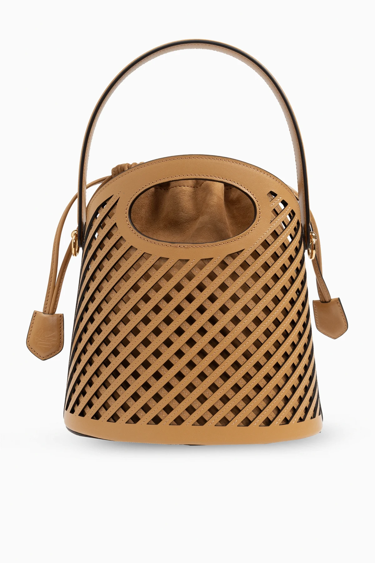 Torba ma kształt kubełka, co nadaje jej nowoczesny i elegancki wygląd. Zewnętrzna część torby wykonana jest z wysokiej jakości skóry w kolorze brązowym, wzbogacona o sztywną, ażurową strukturę, która tworzy unikalny kraciasty wzór.
