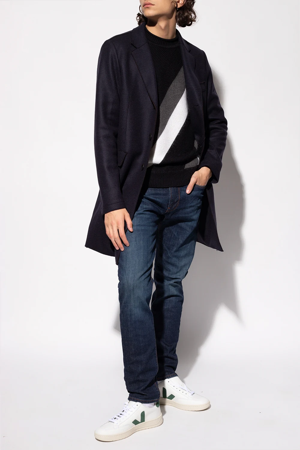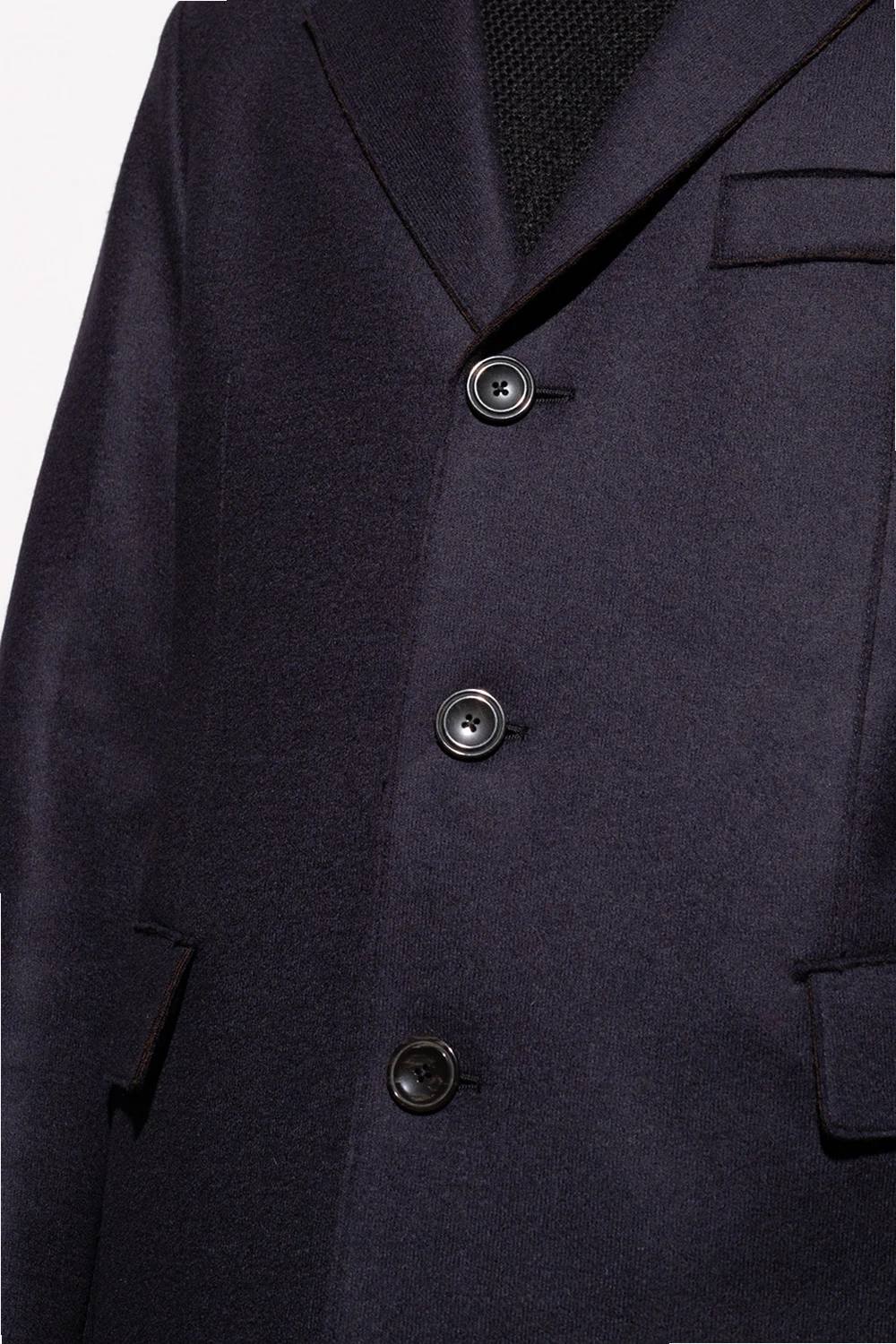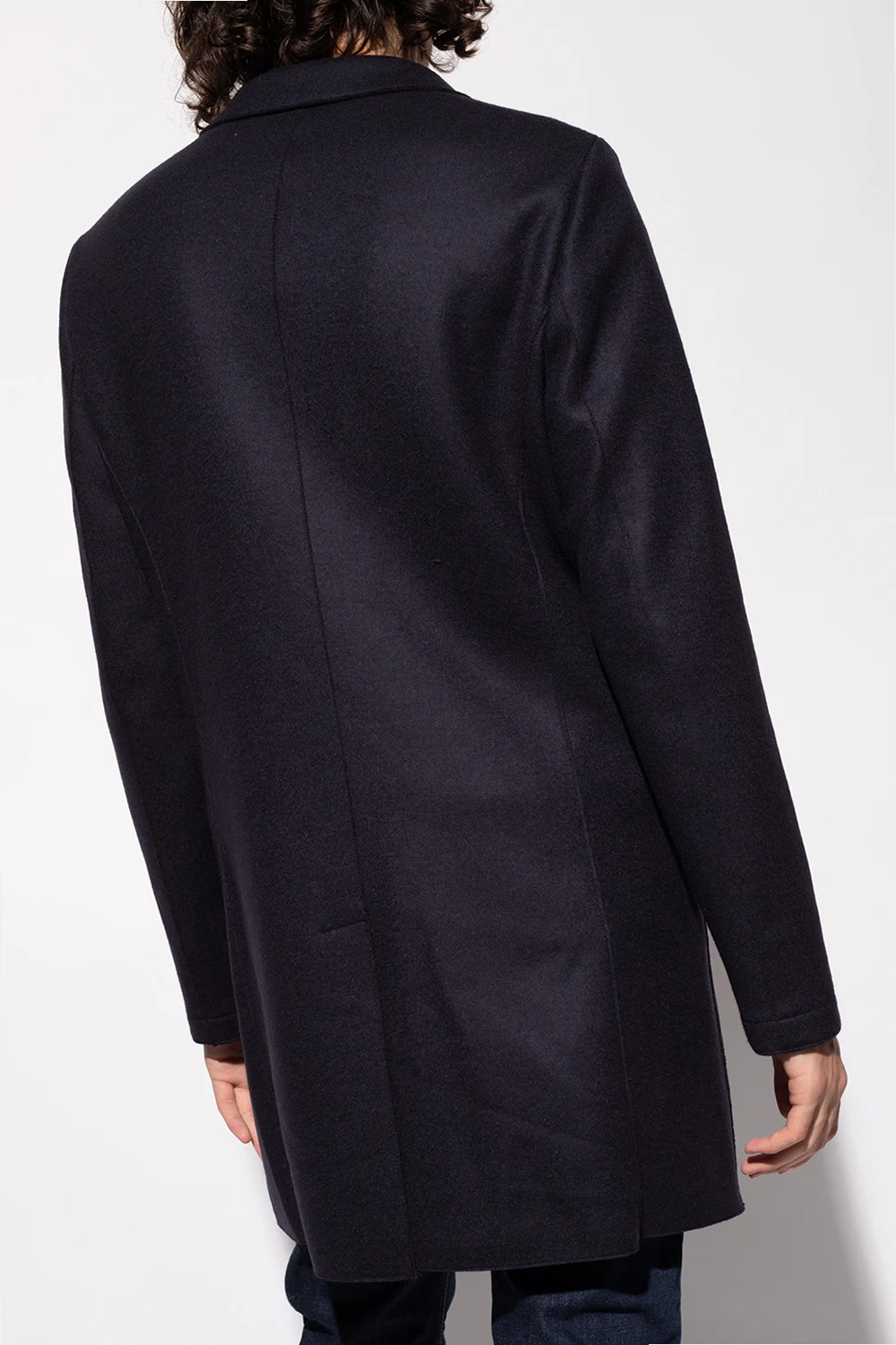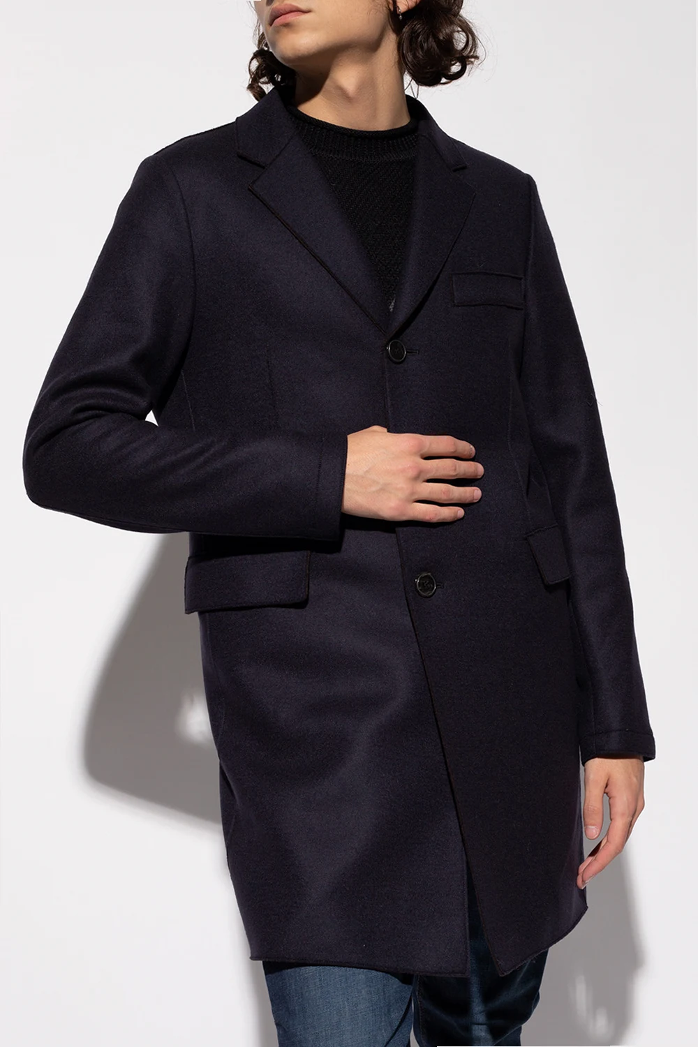 Granatowy, wełniany płaszcz z otwartymi klapami Emporio Armani. Zapinany na guziki. Z przodu trzy kieszenie – dwie z patkami i jedna wsuwana. Z tyłu pojedyncze wycięcie. Surowe wykończenie. Długie rękawy.