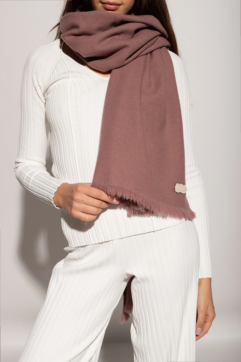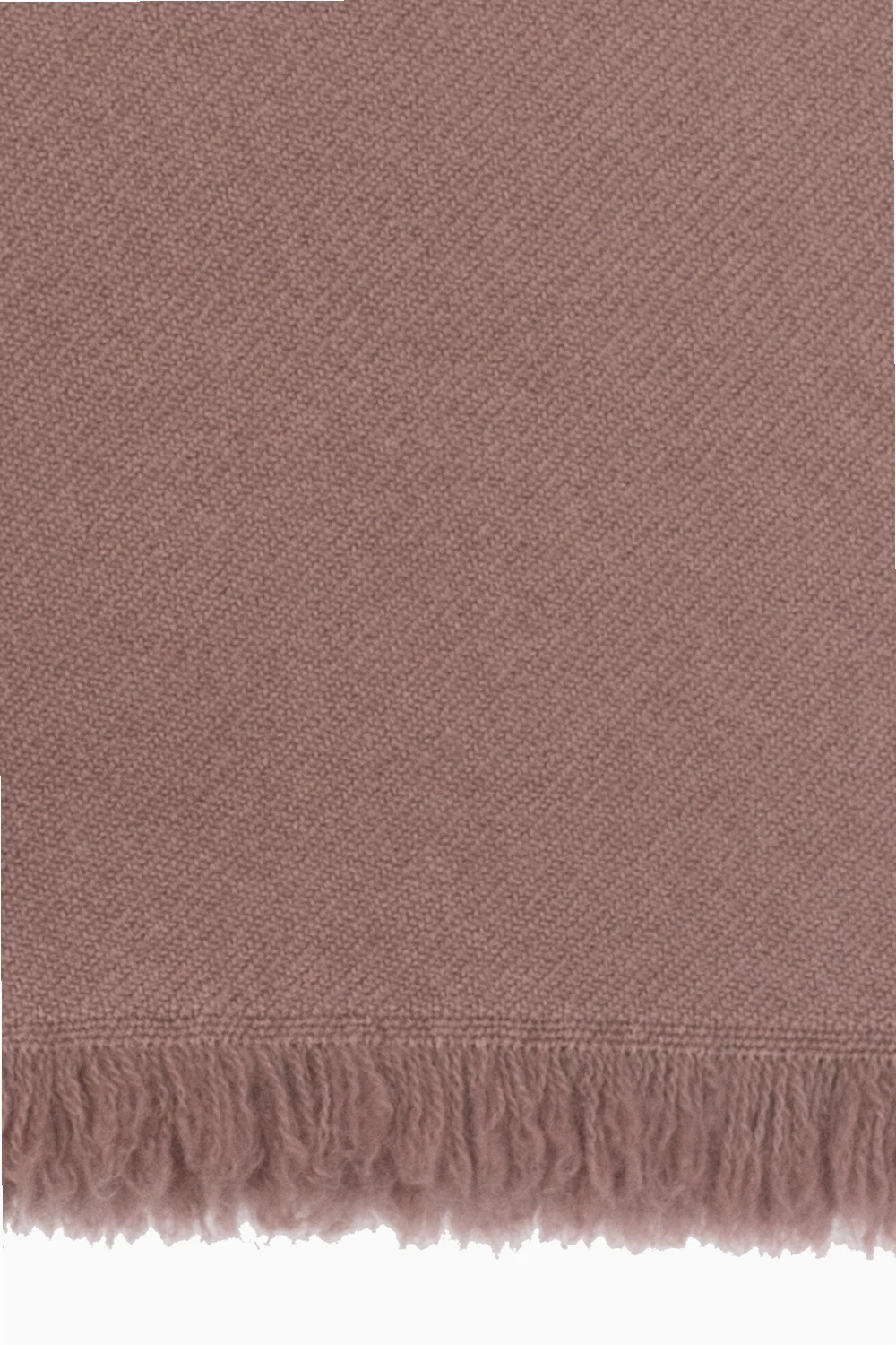Fioletowy, kaszmirowy szal Agnona. Ozdobiony aplikacją z logo. Surowo wykończone dwa brzegi.