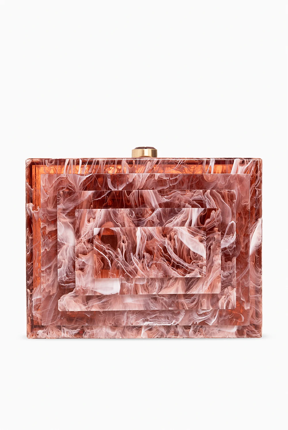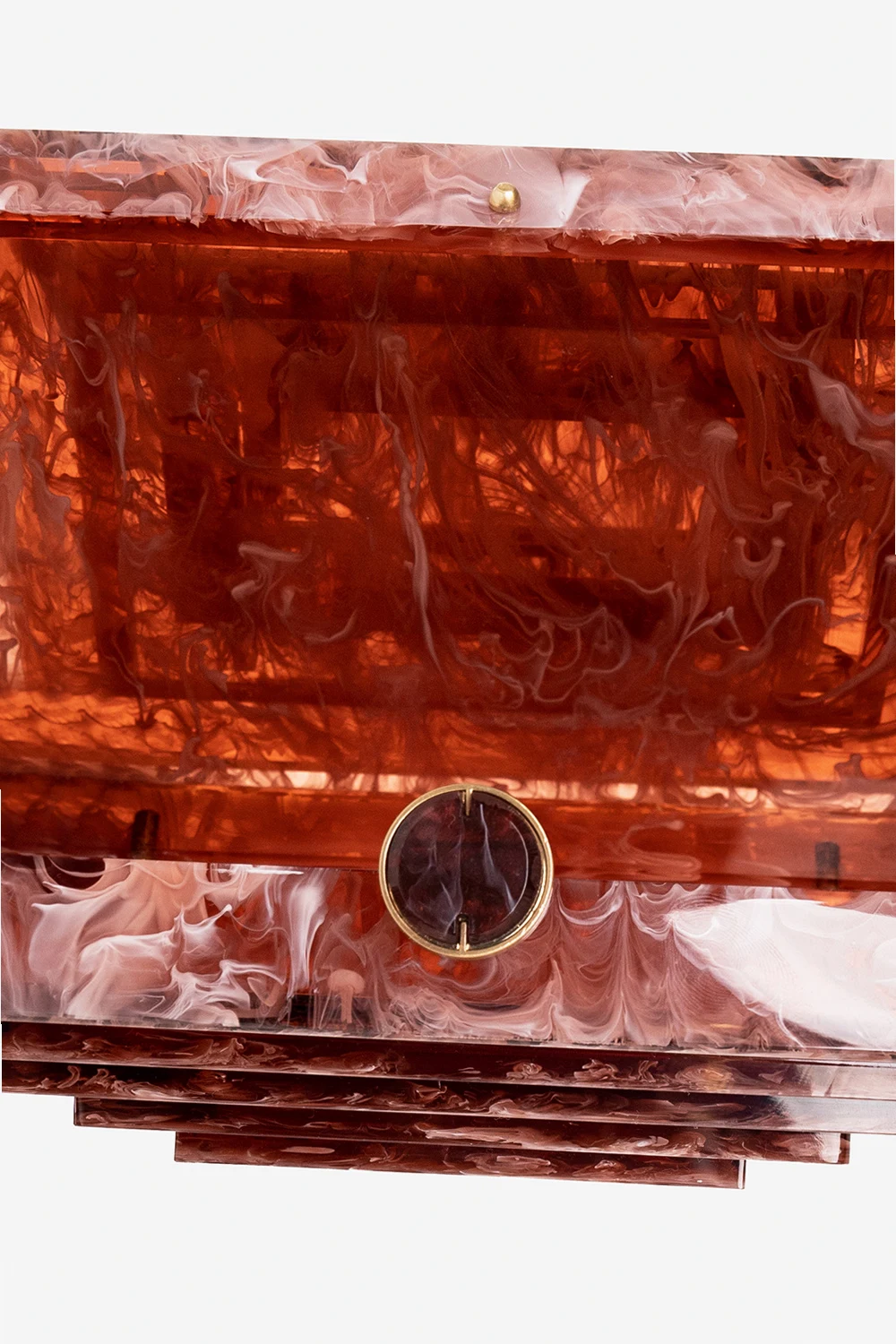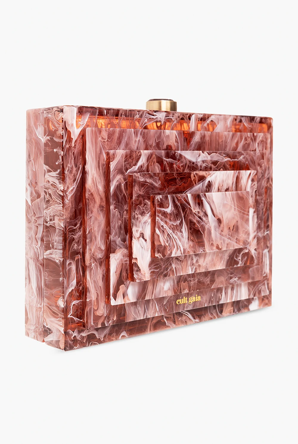 Czerwono-biała torba do ręki, model ‘Logan’ Cult Gaia. Wykonana z akrylu i żywicy ozdobionej marmurkowym wzorem. Zamykana na zatrzask. Ozdobiona nadrukowanym logo w kolorze złotym. Wewnątrz komora.