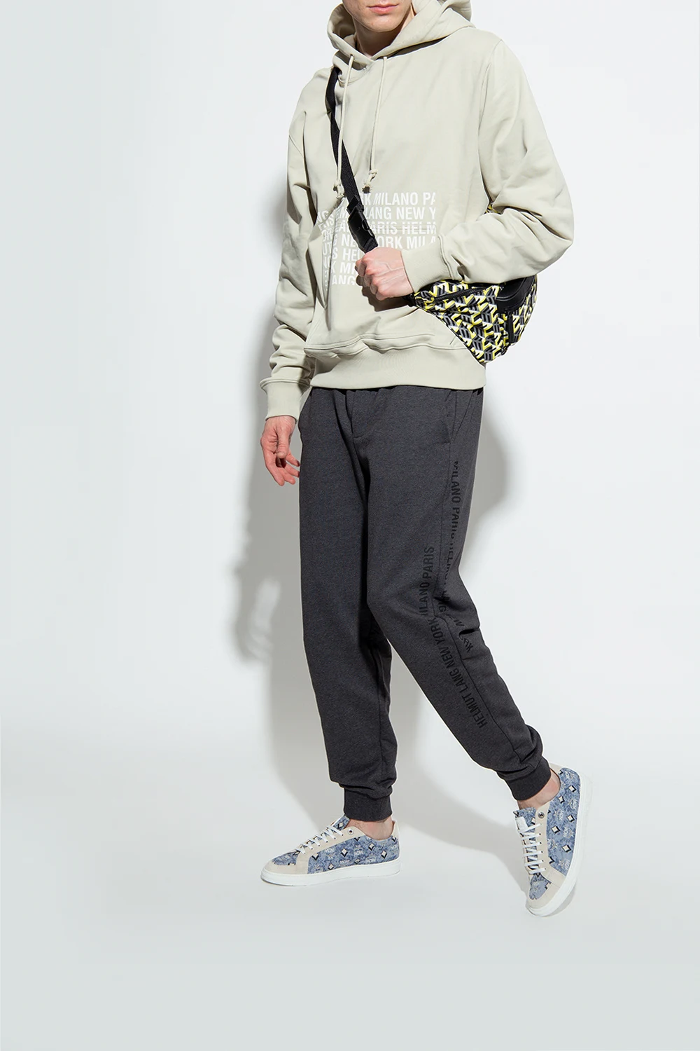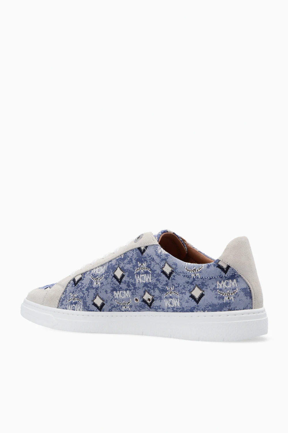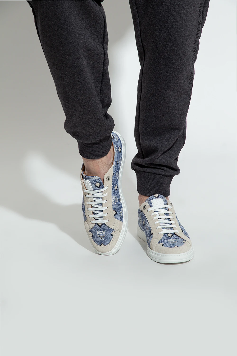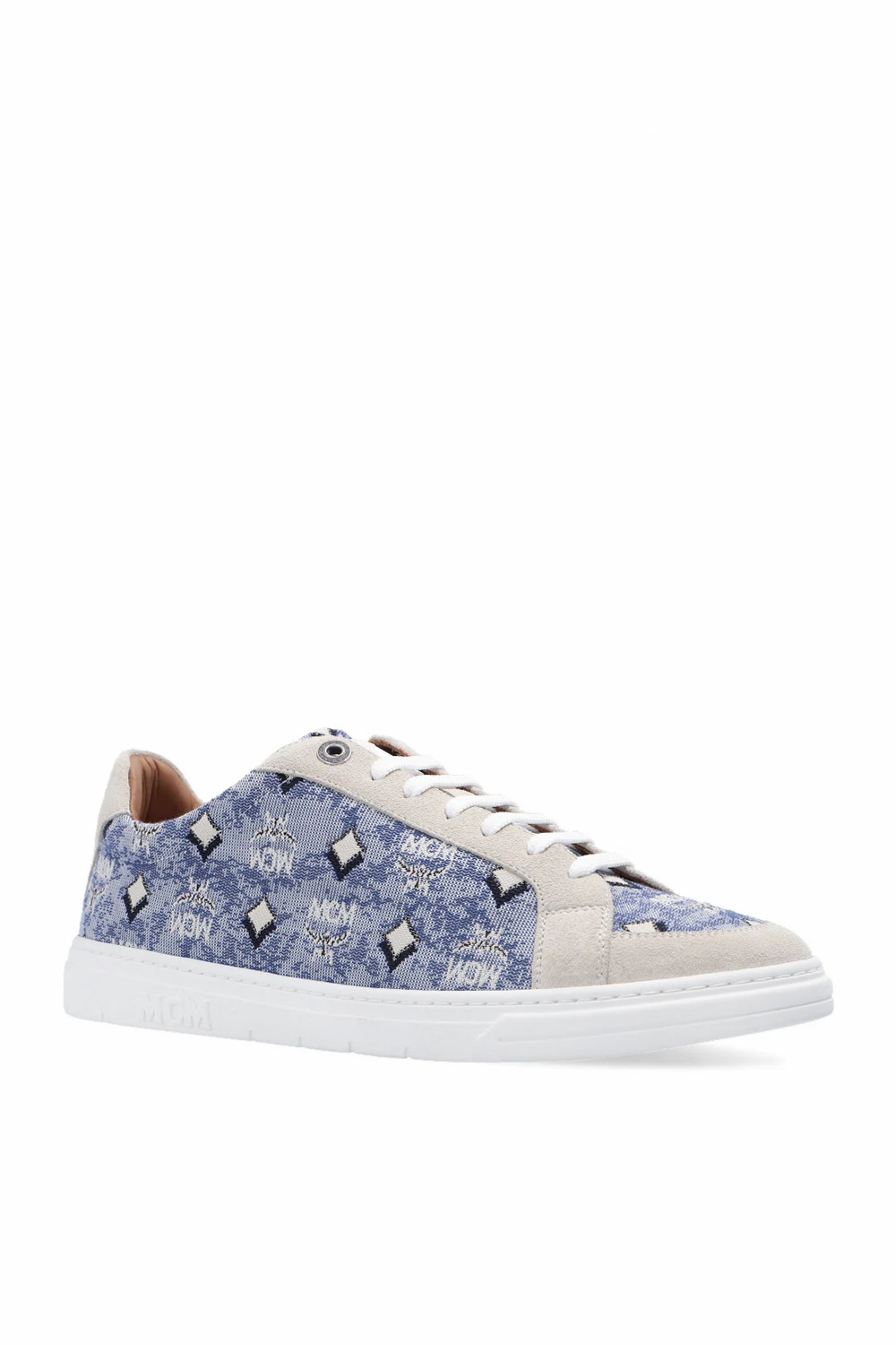 Niebiesko-biało-kremowe sznurowane buty sportowe MCM. Ozdobione żakardowym wzorem ‘Vintage Monogram’. Na języku biała naszywka z logo. Biała, gumowa podeszwa.