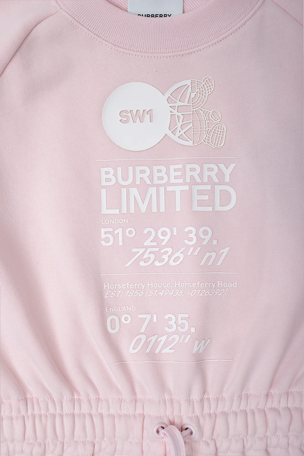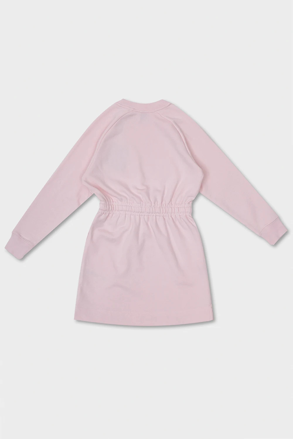 Jasnoróżowa sukienka, model ‘Ffion’ Burberry Kids. Wykonana z bawełny. W pasie ściągana trokami. Wypukła aplikacja z logo w kolorze białym. Dwie wsuwane kieszenie. Okrągły dekolt. Długie rękawy zakończone ściągaczami.
