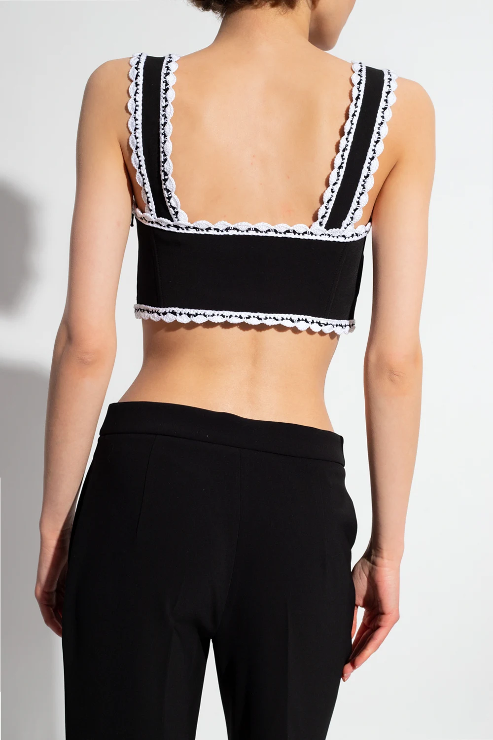 Krótki, czarno-biały top na ramiączkach z haftem Moschino. Zapinany z boku na zamek i haftkę. Miseczki usztywniane fiszbinami.